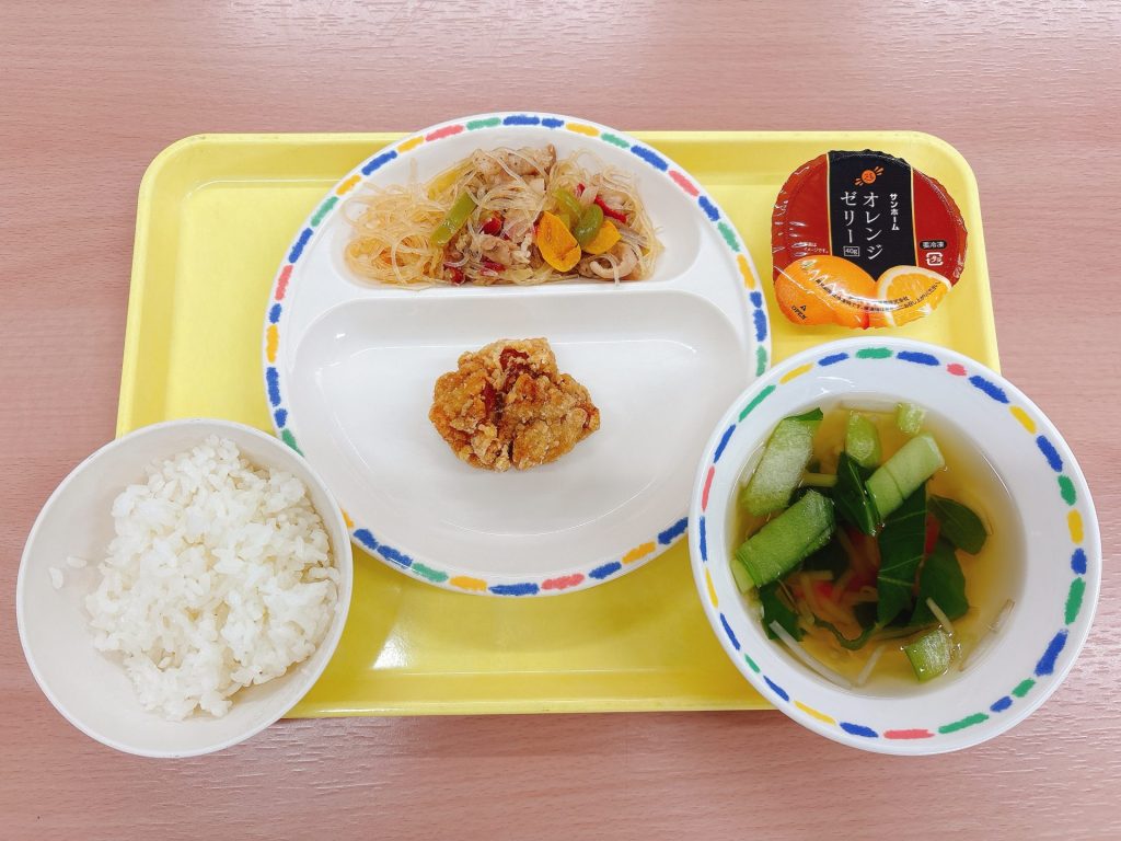 3園リクエストメニュー:今日は3園さんリクエストのからあげ、チャプチェ、ゼリーです☺️