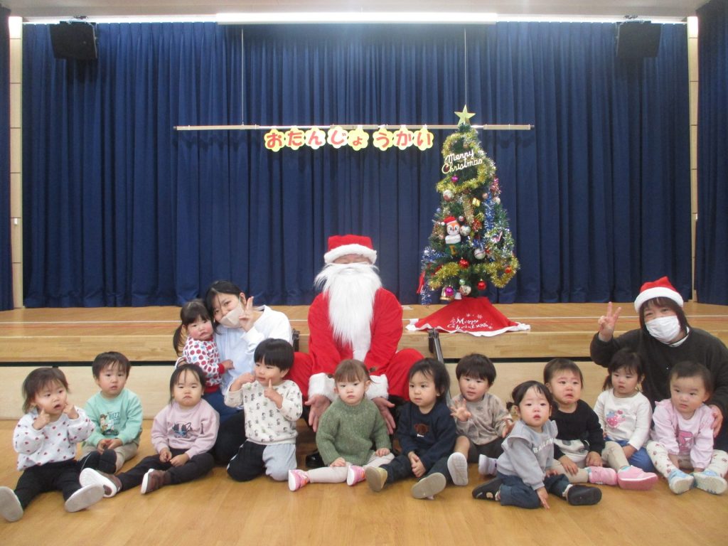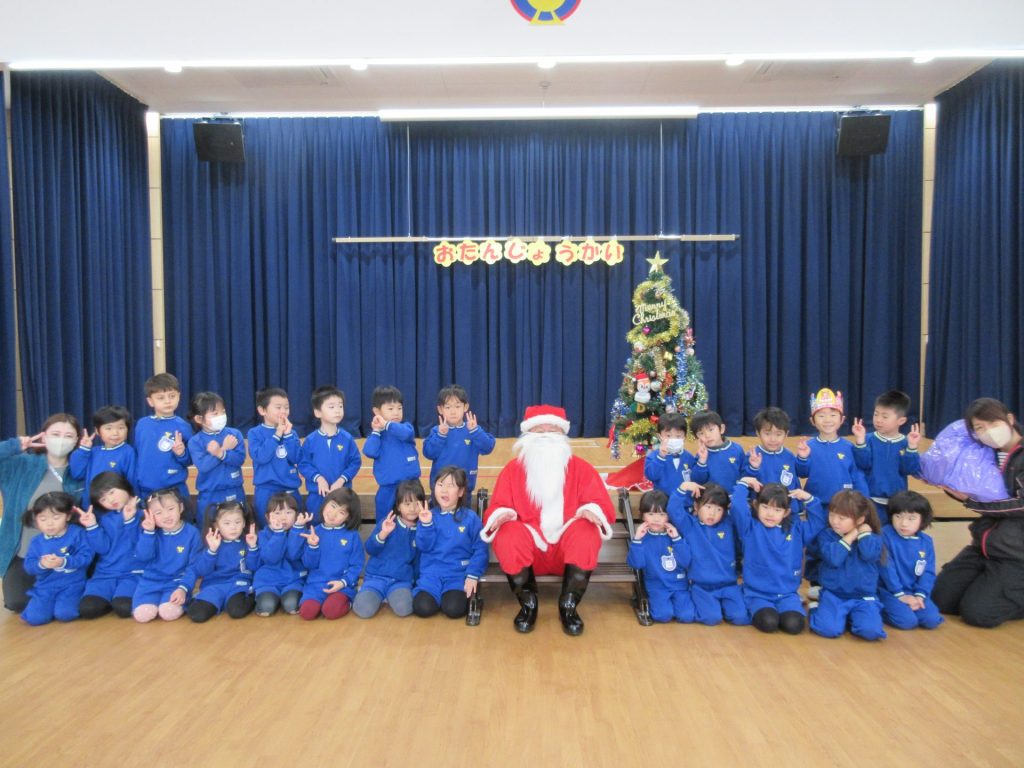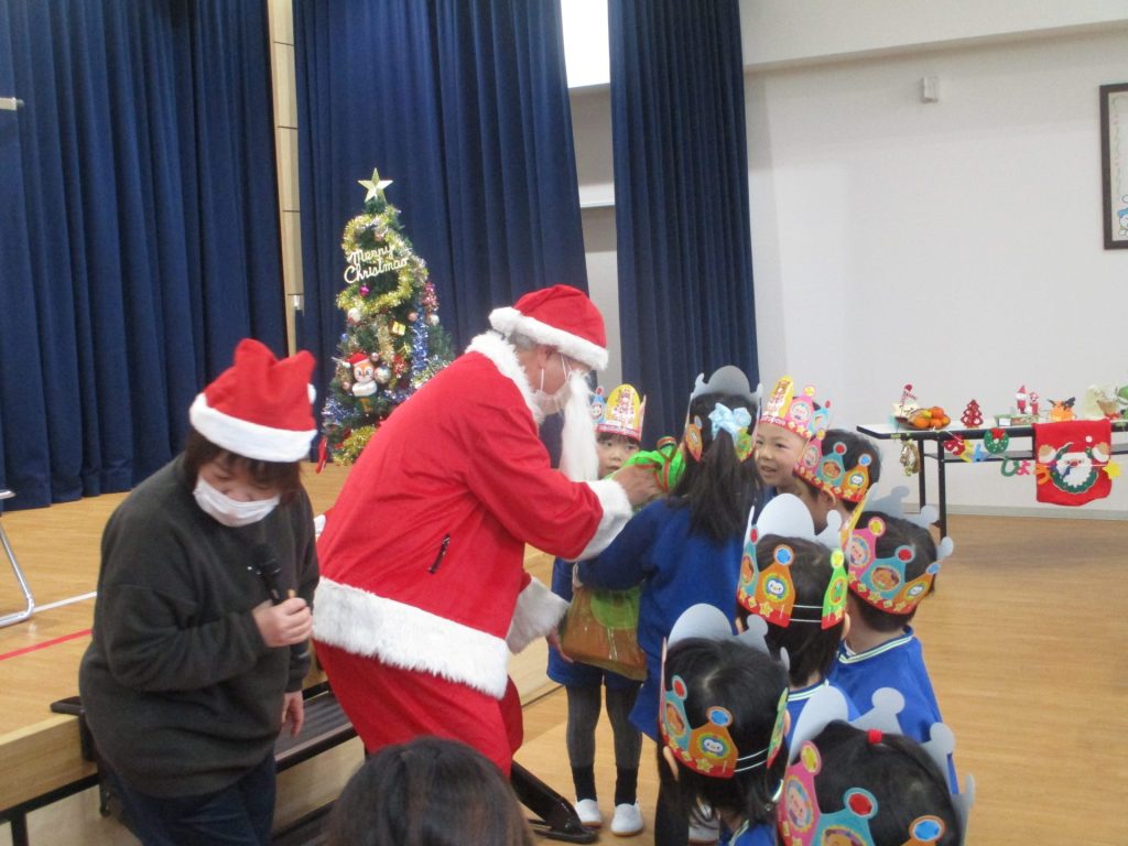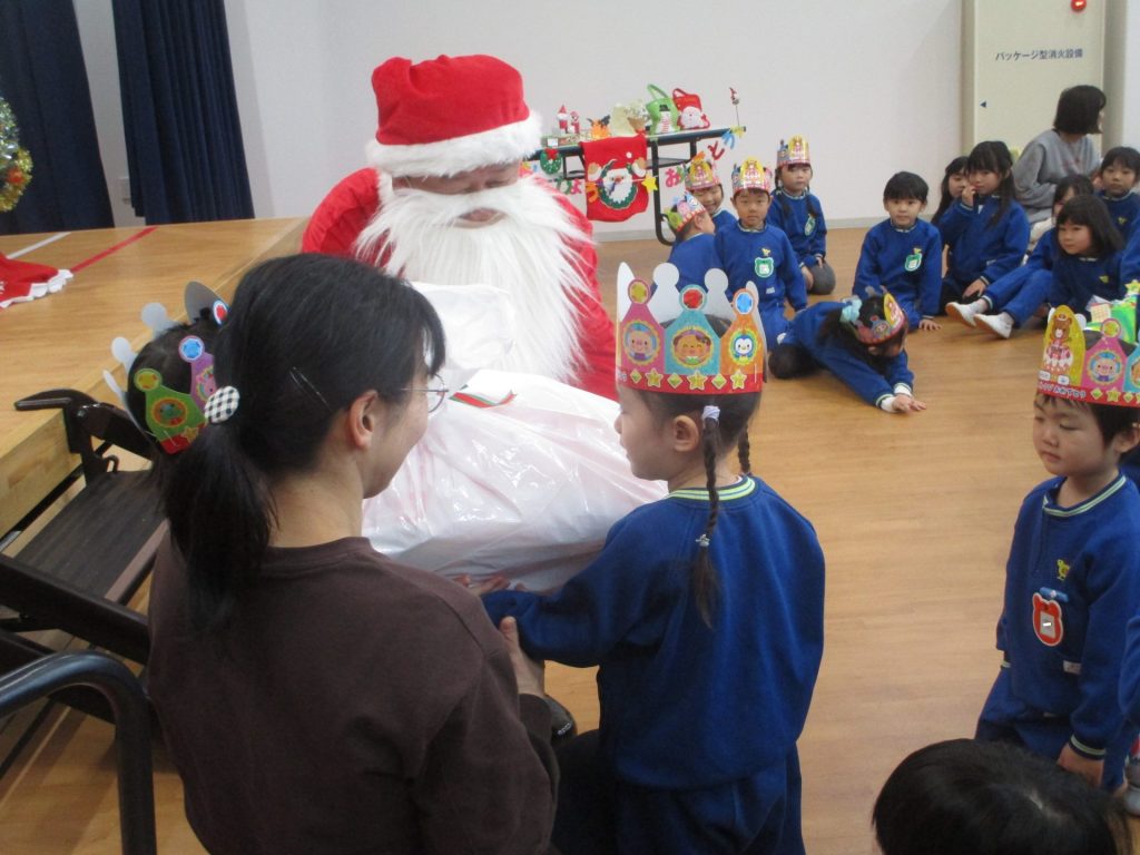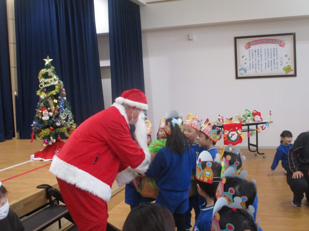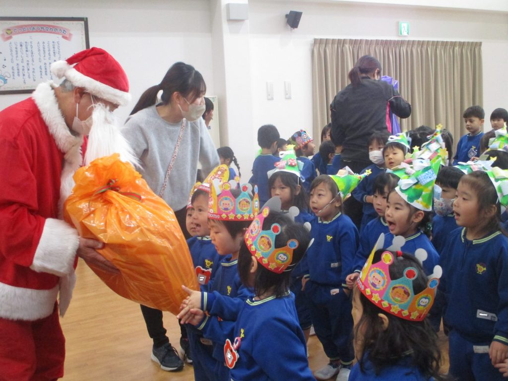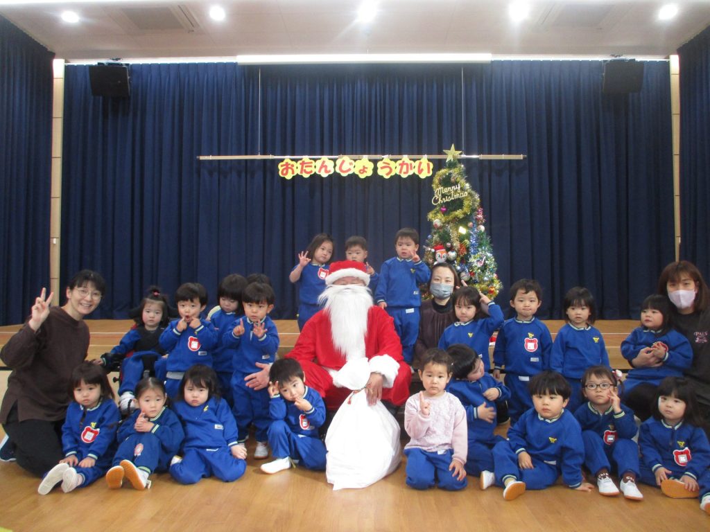 次は楽しみにしていたクリスマス会です!クリスマスやサンタクロースになった名前の由来を聞きました。大きな袋を持ったサンタクロースの登場に大興奮な子ども達でしたよ!!