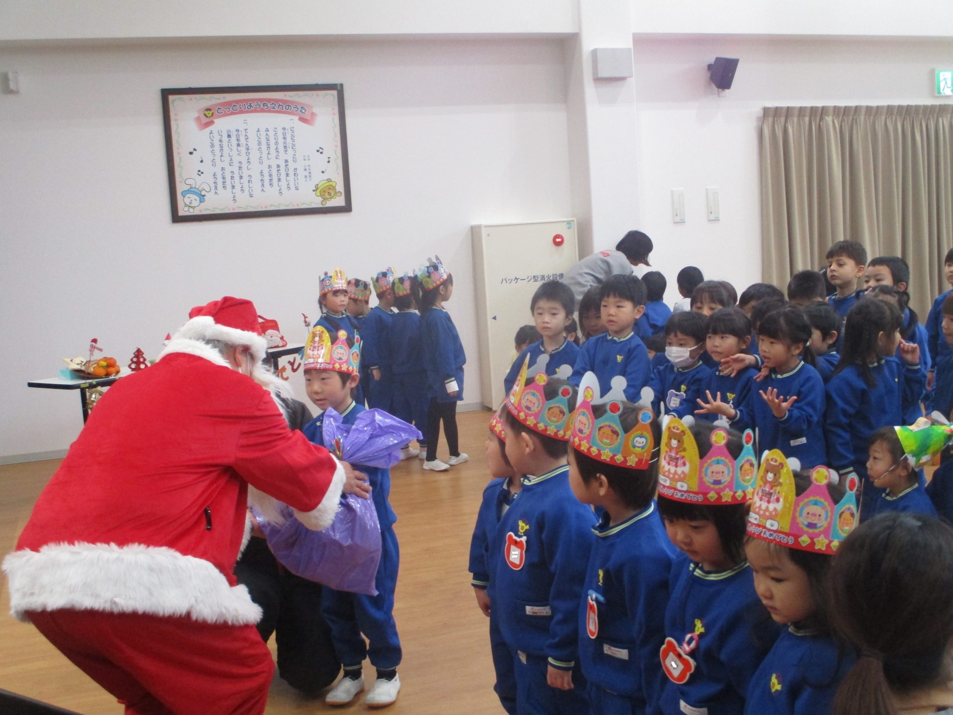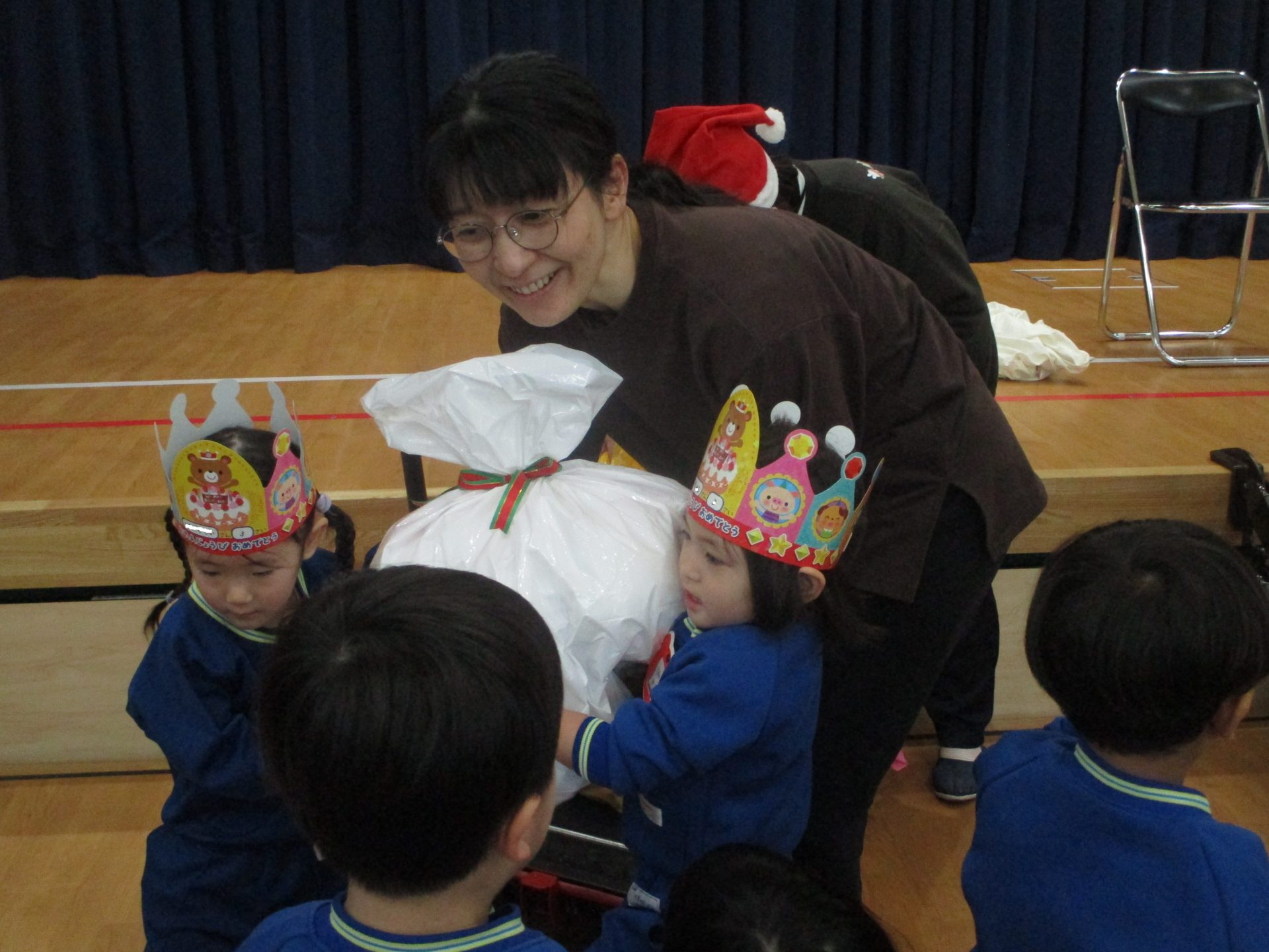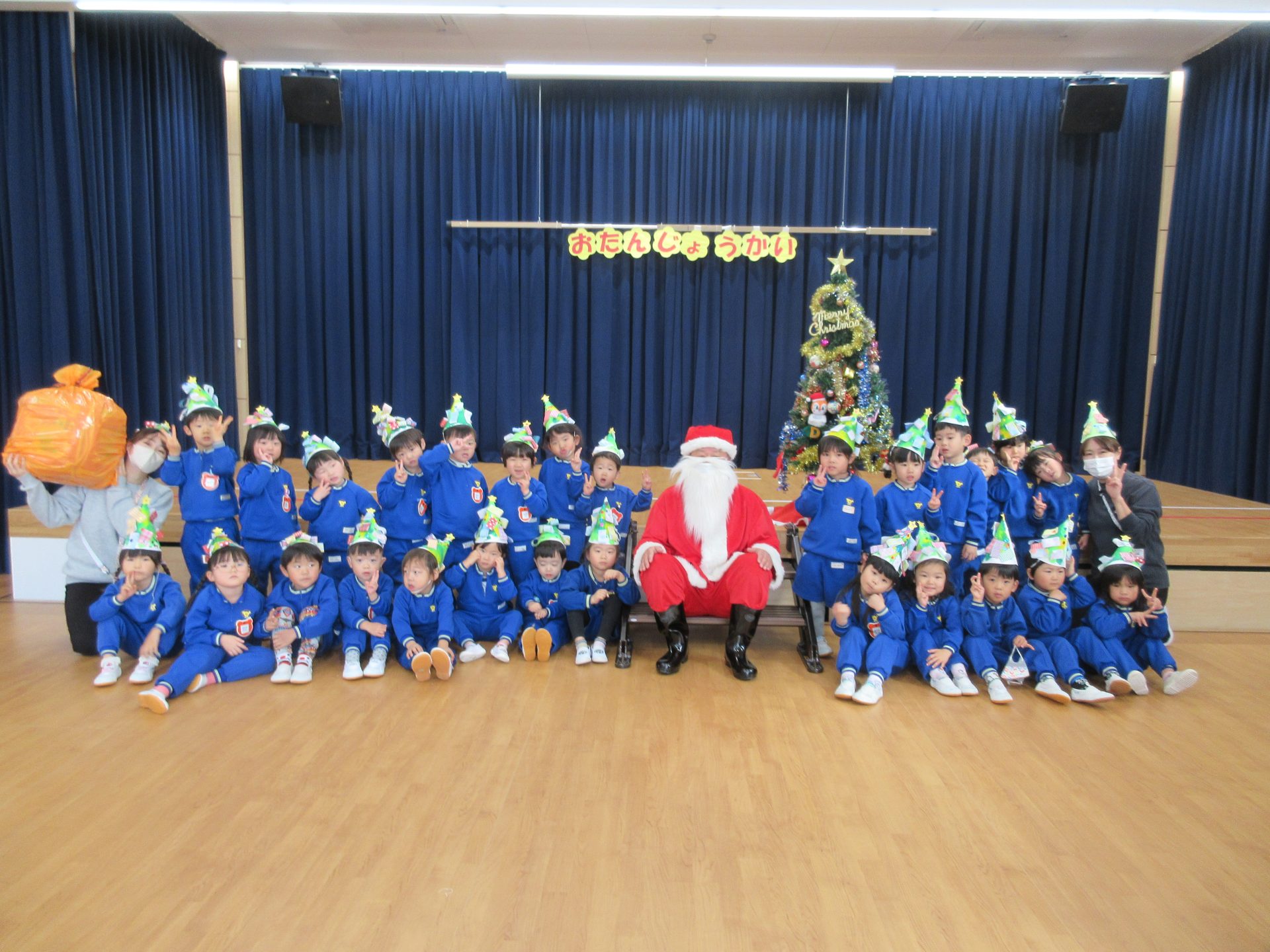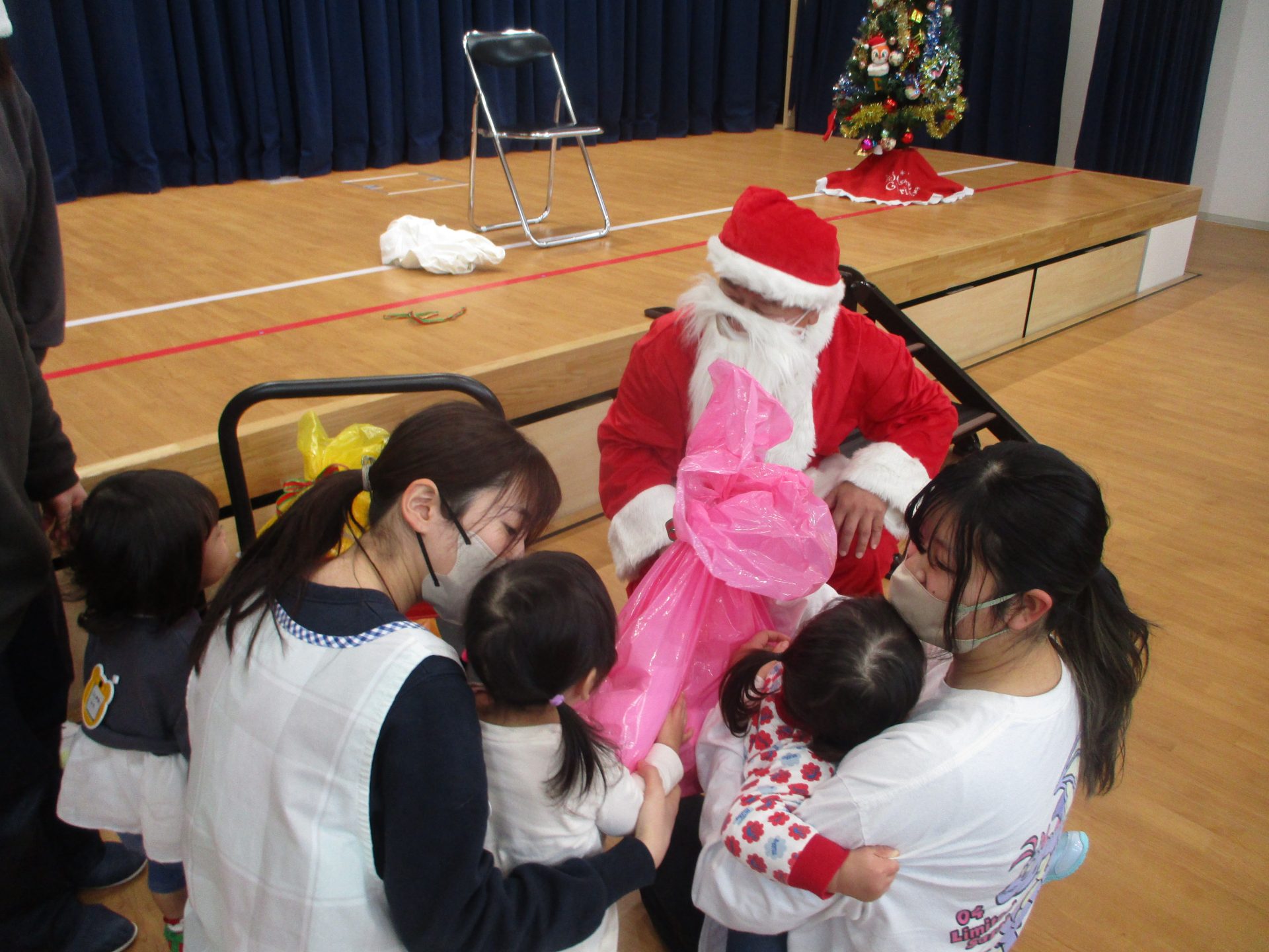 次は楽しみにしていたクリスマス会です!クリスマスやサンタクロースになった名前の由来を聞きました。大きな袋を持ったサンタクロースの登場に大興奮な子ども達でしたよ!!