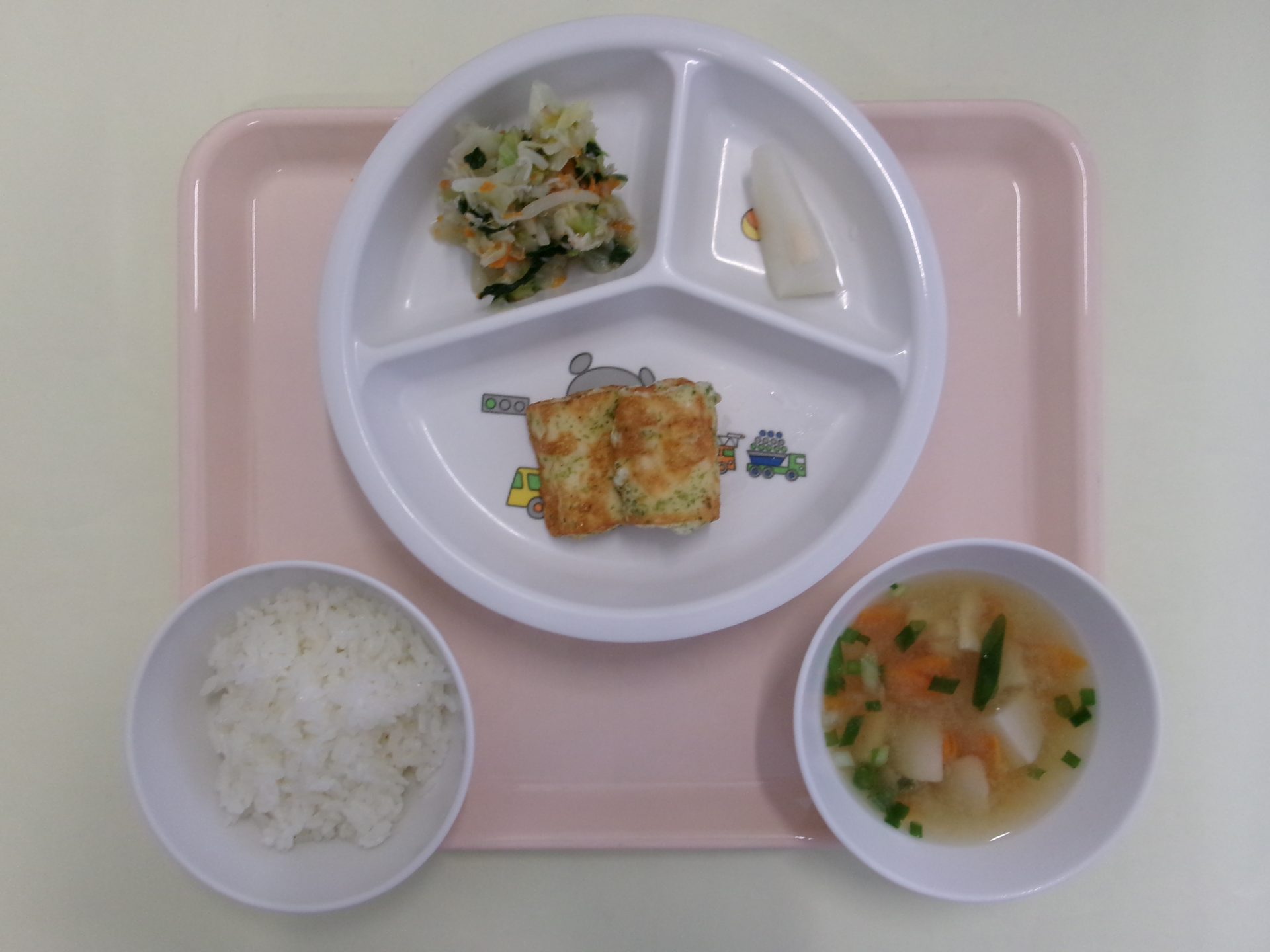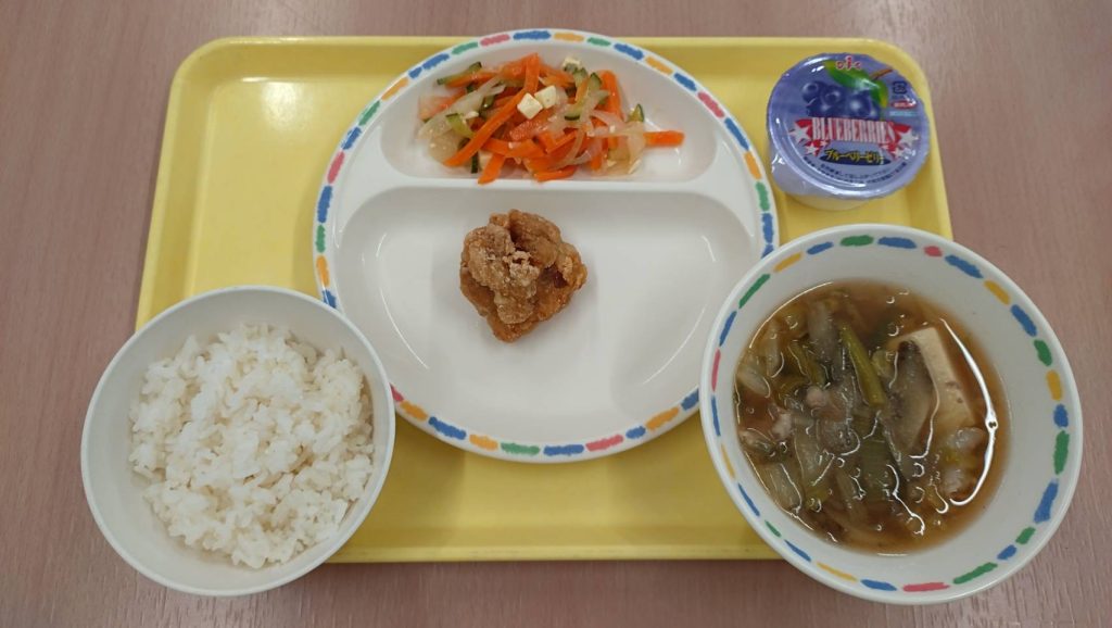 1園リクエストメニュー:今日は1園さんリクエストの唐揚げ、すき焼き風煮、キャロットサラダ、ゼリーです☺