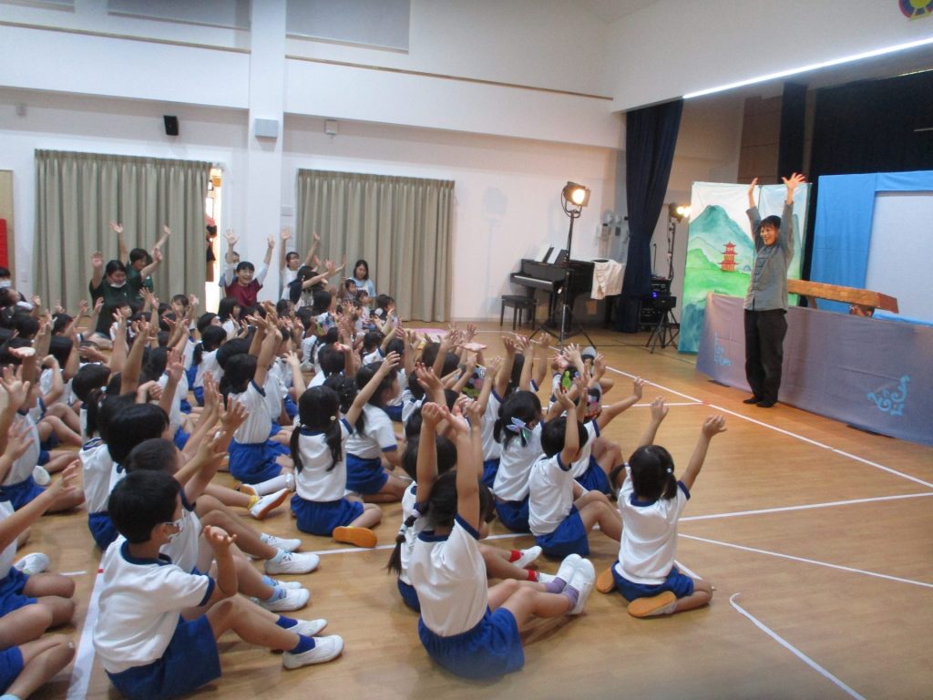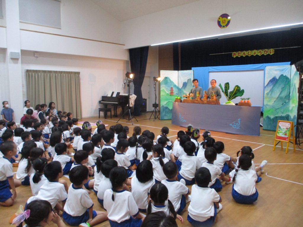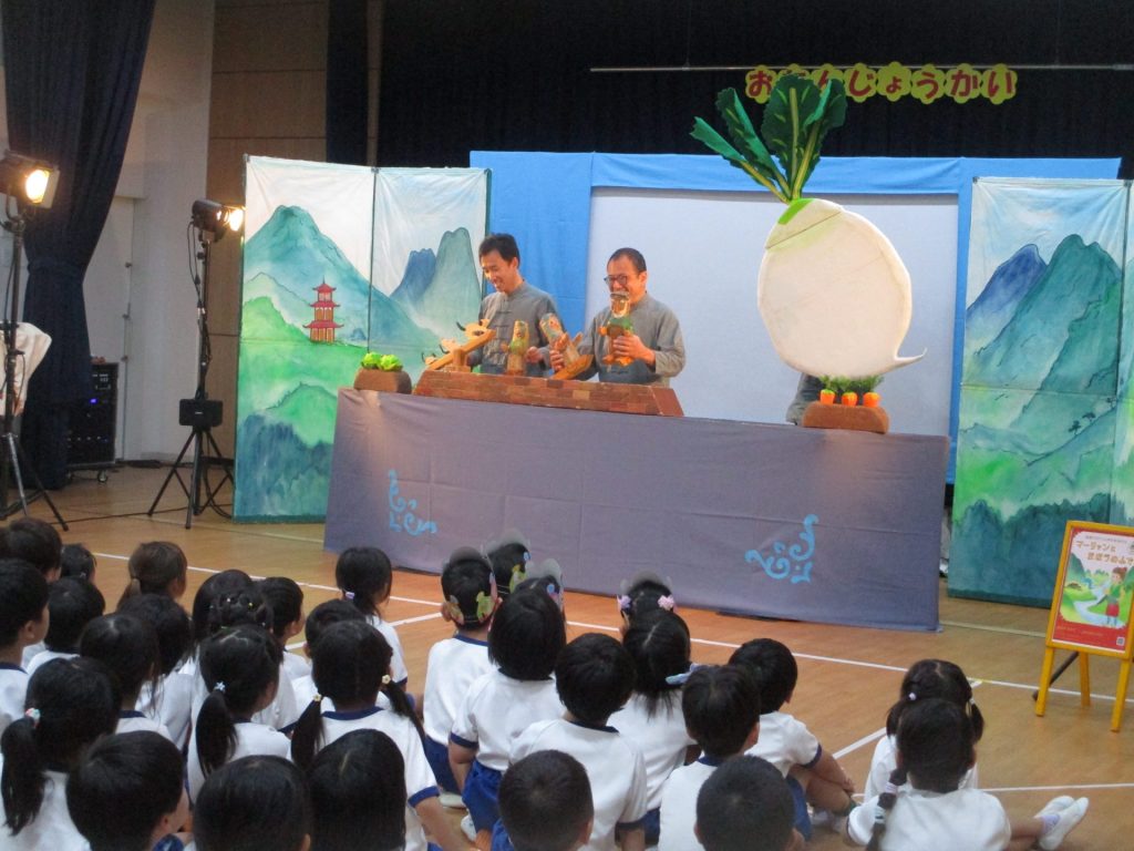 後半は、劇団すぎのこさんの人形劇を鑑賞しました。「おおきなかぶ」と「マーリャンと魔法のふで」の2作品を見せてもらいました。