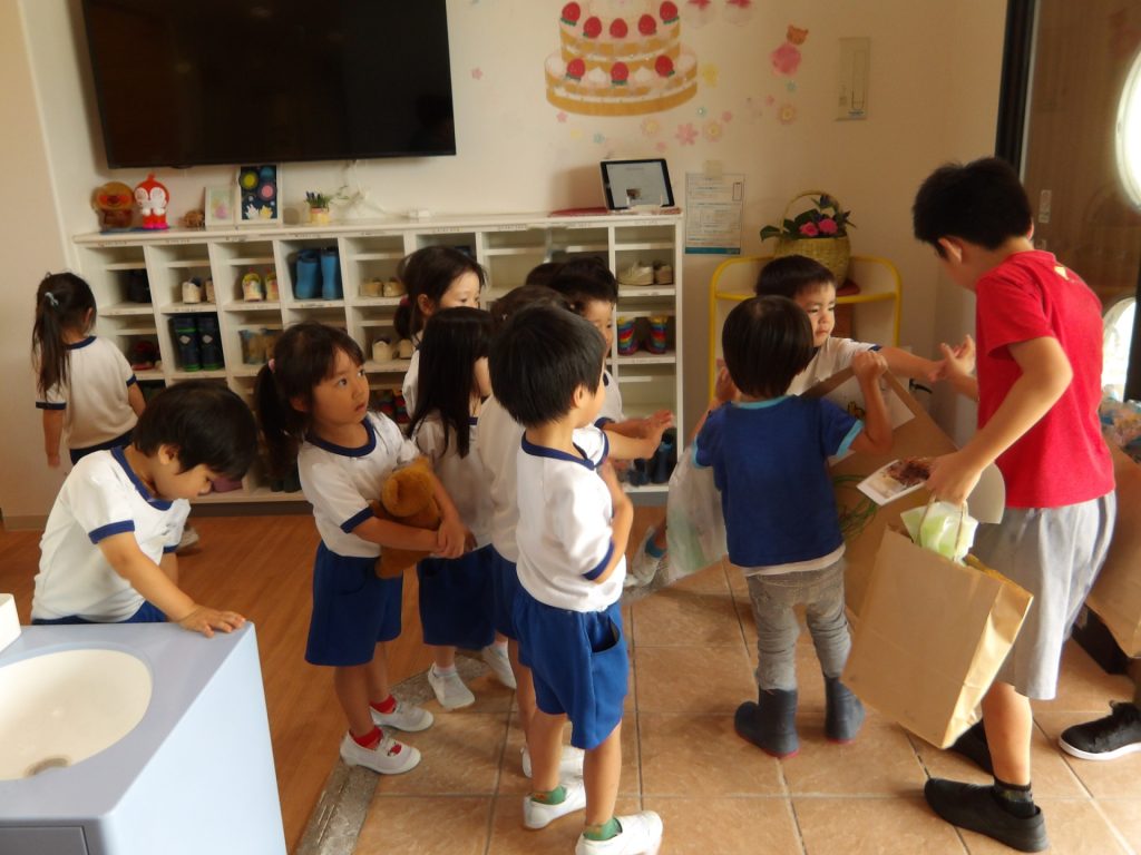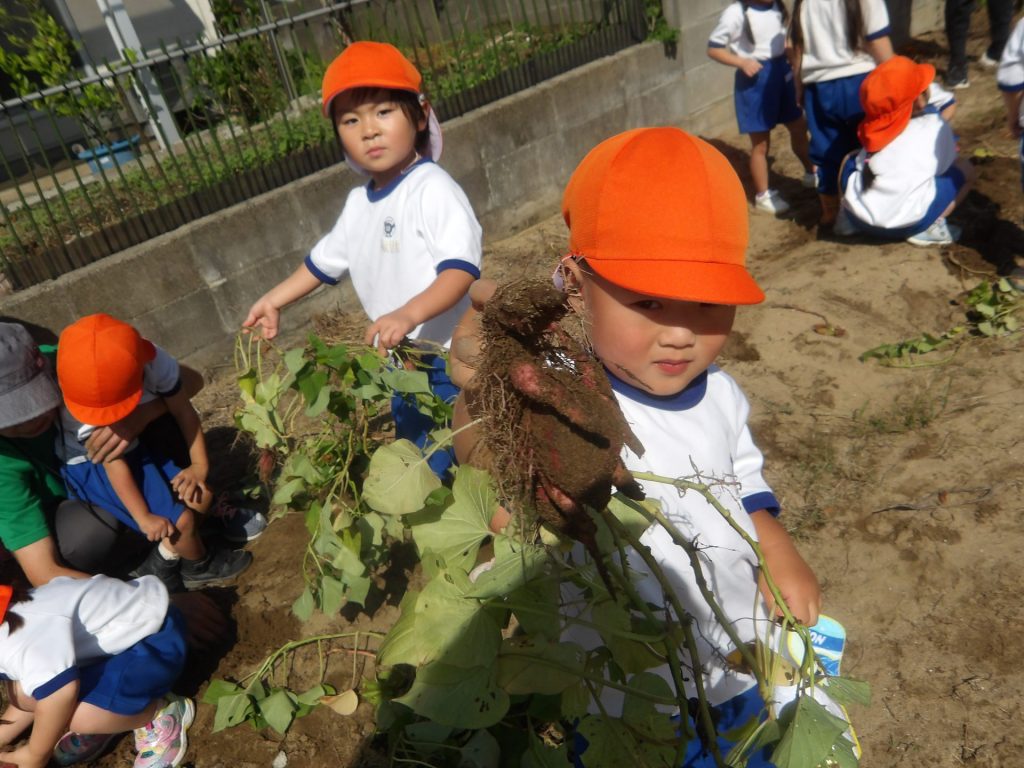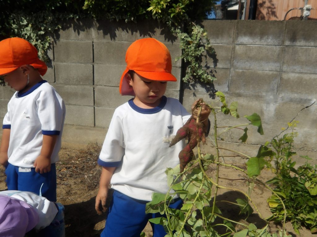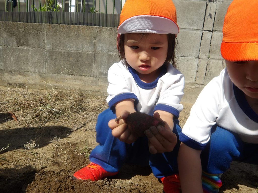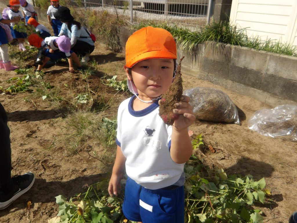 畑に到着すると、お芋の掘り方を思い出しながら芋ほりを楽しみました。土の深い所に植わっているサツマイモはなんだか宝探しのようです。掘れるたびにあちこちから歓声があがりました。細長いのや小さいのなど、いろいろな形のお芋が掘れました。