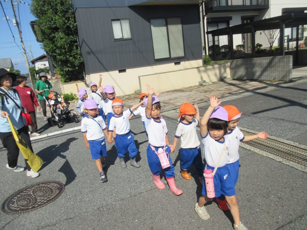 年中組のお兄さん、お姉さんに手をつないでもらい、いも畑へ歩いて行きました。お芋の掘り方は、絵本を読んで予習もばっちりです!