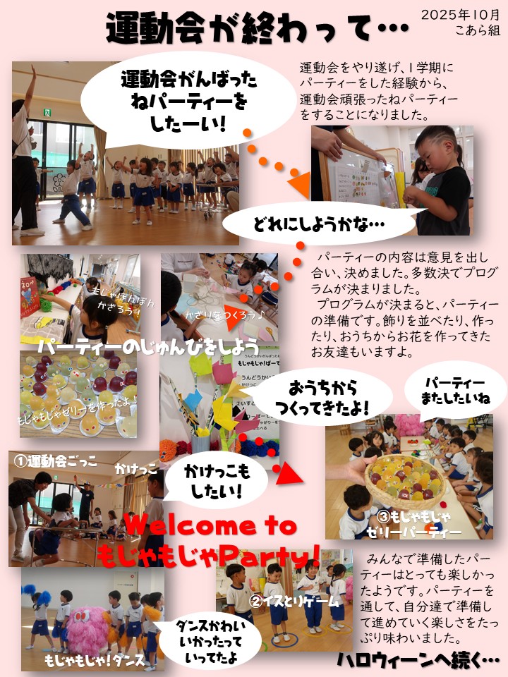 運動会が終わり、「運動会がんばったねのもじゃもじゃパーティーがしたい!!」と熱烈なリクエストがでてきました。1学期頑張ったねパーティーを思い出してくれたのでしょうか。