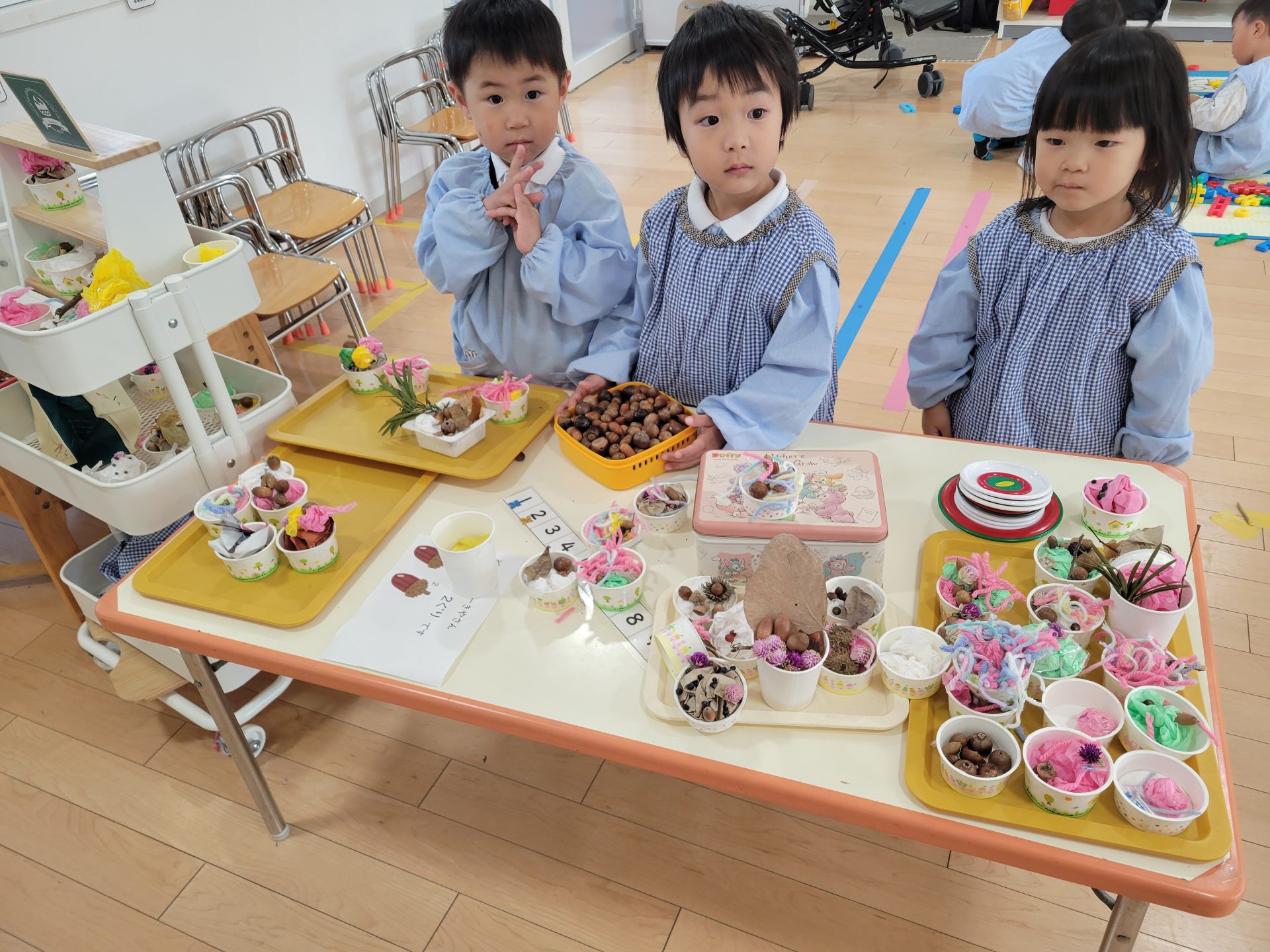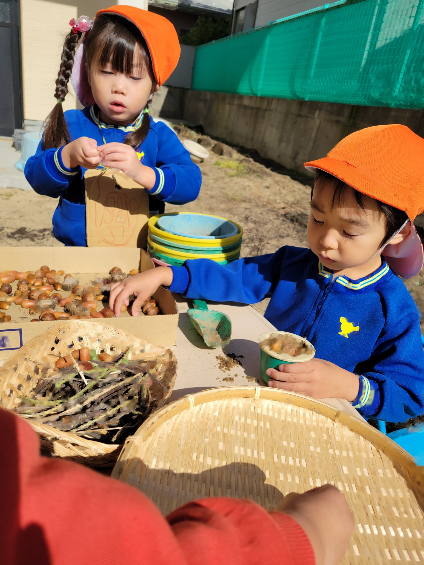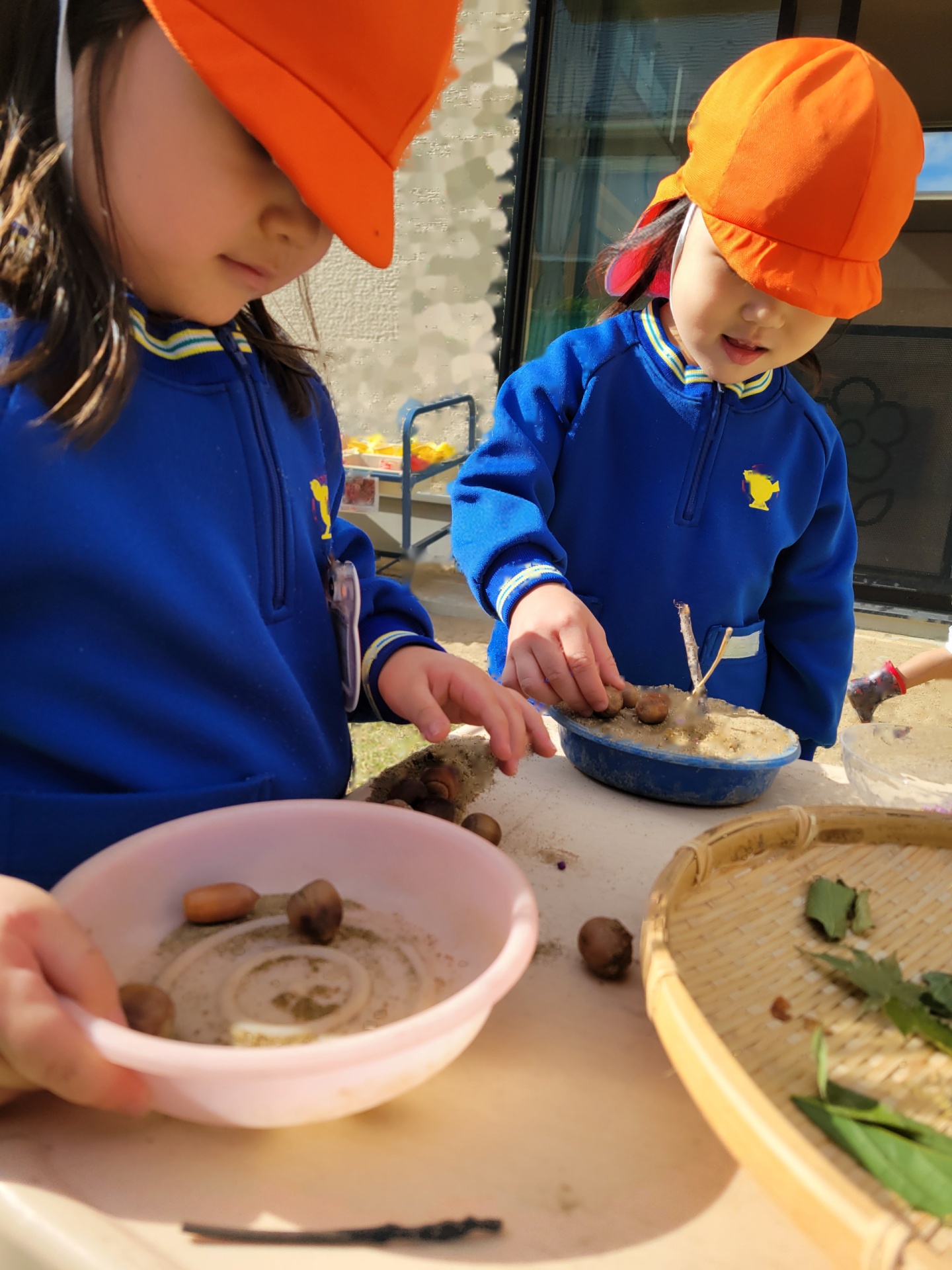 どんぐり拾い以降、どんぐりでケーキを作ったり、園庭でおままごとをしたりして楽しんでいました。ケーキに乗せたり、おにぎりの具にしてみたり・・・。
