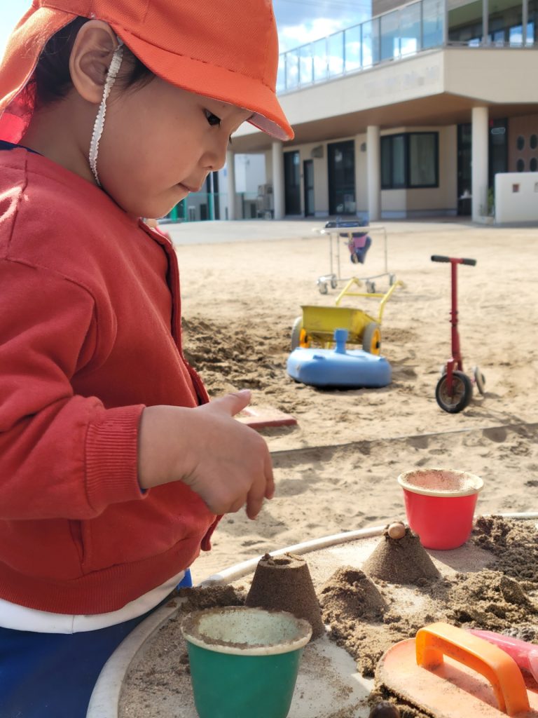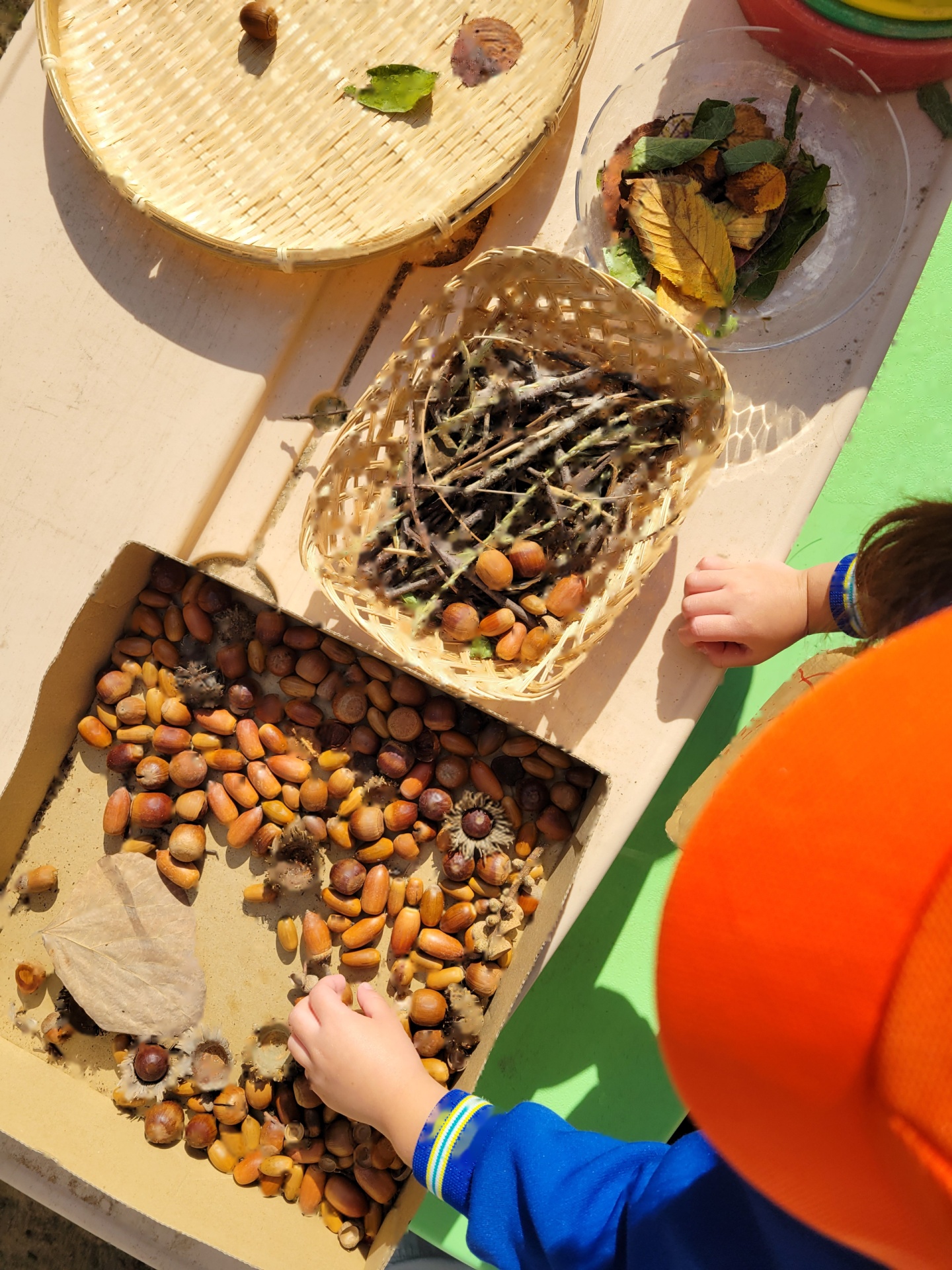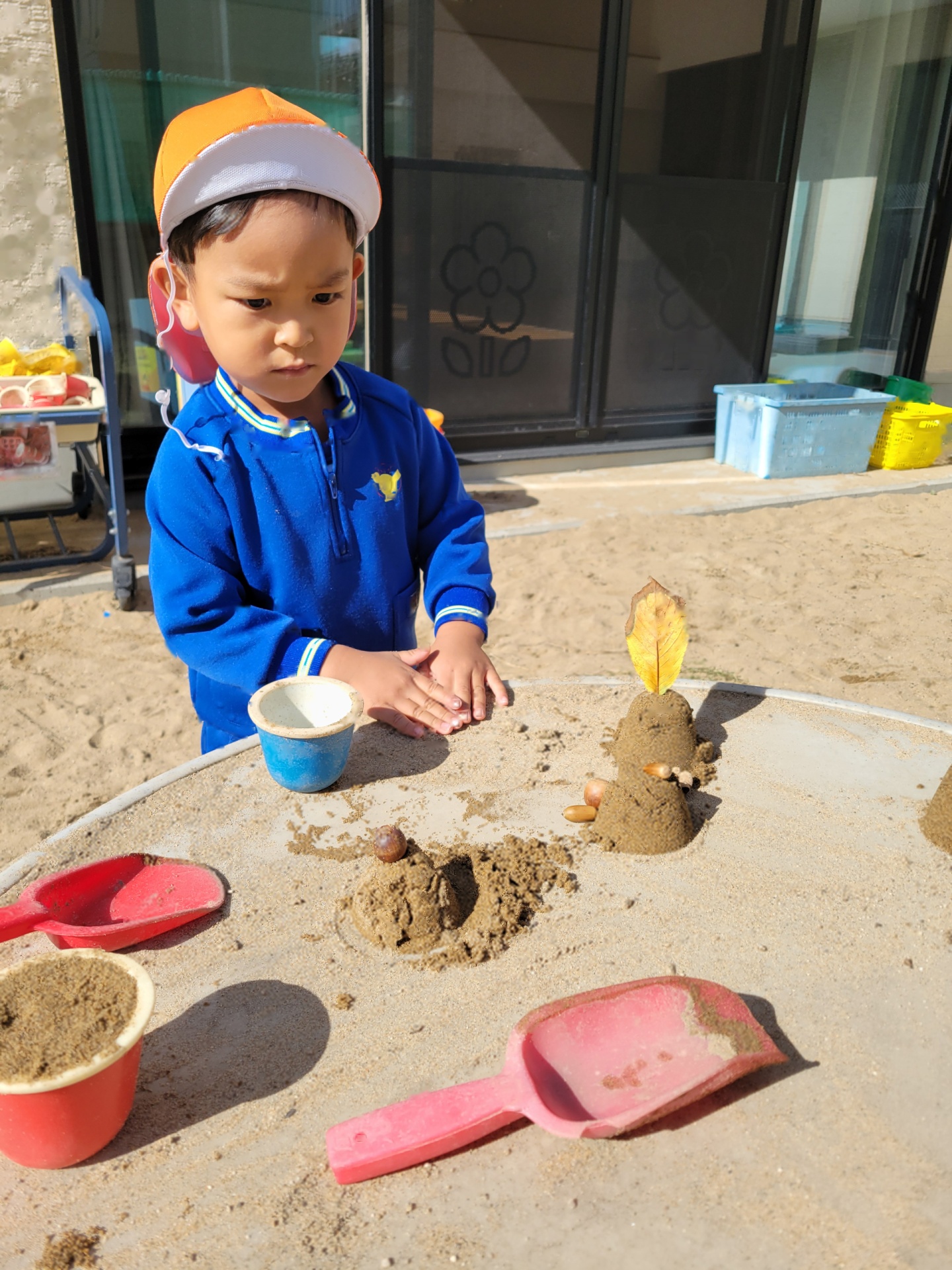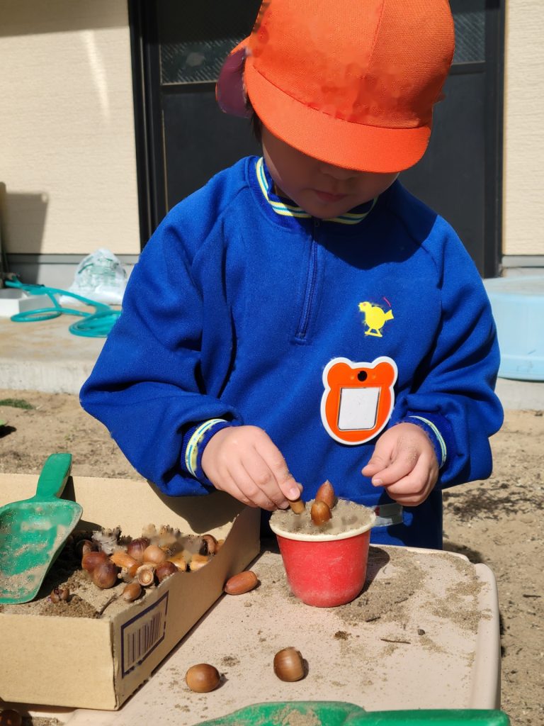 どんぐり拾い以降、どんぐりでケーキを作ったり、園庭でおままごとをしたりして楽しんでいました。ケーキに乗せたり、おにぎりの具にしてみたり・・・。