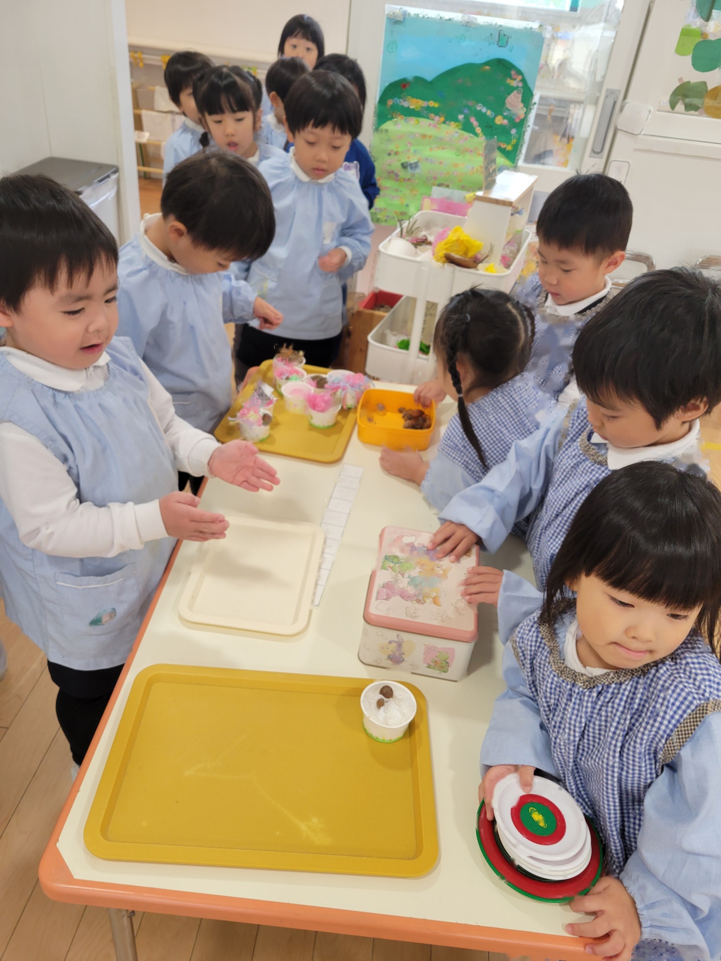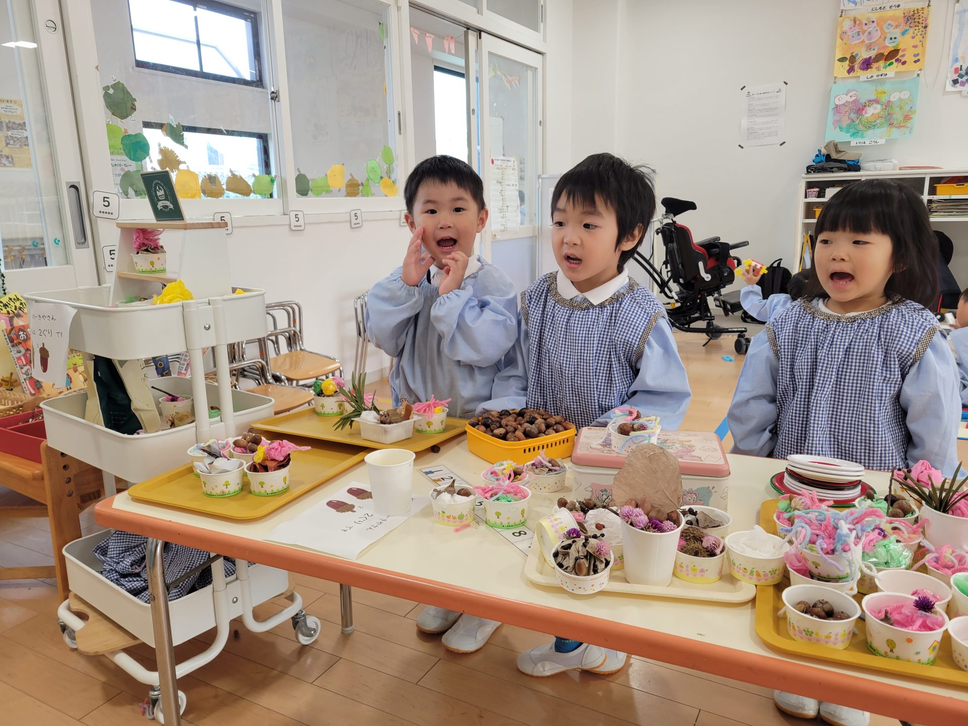 先日お届けしたどんぐりケーキ屋さんもついに開店しました。声を合わせて「いらっしゃいませ!」