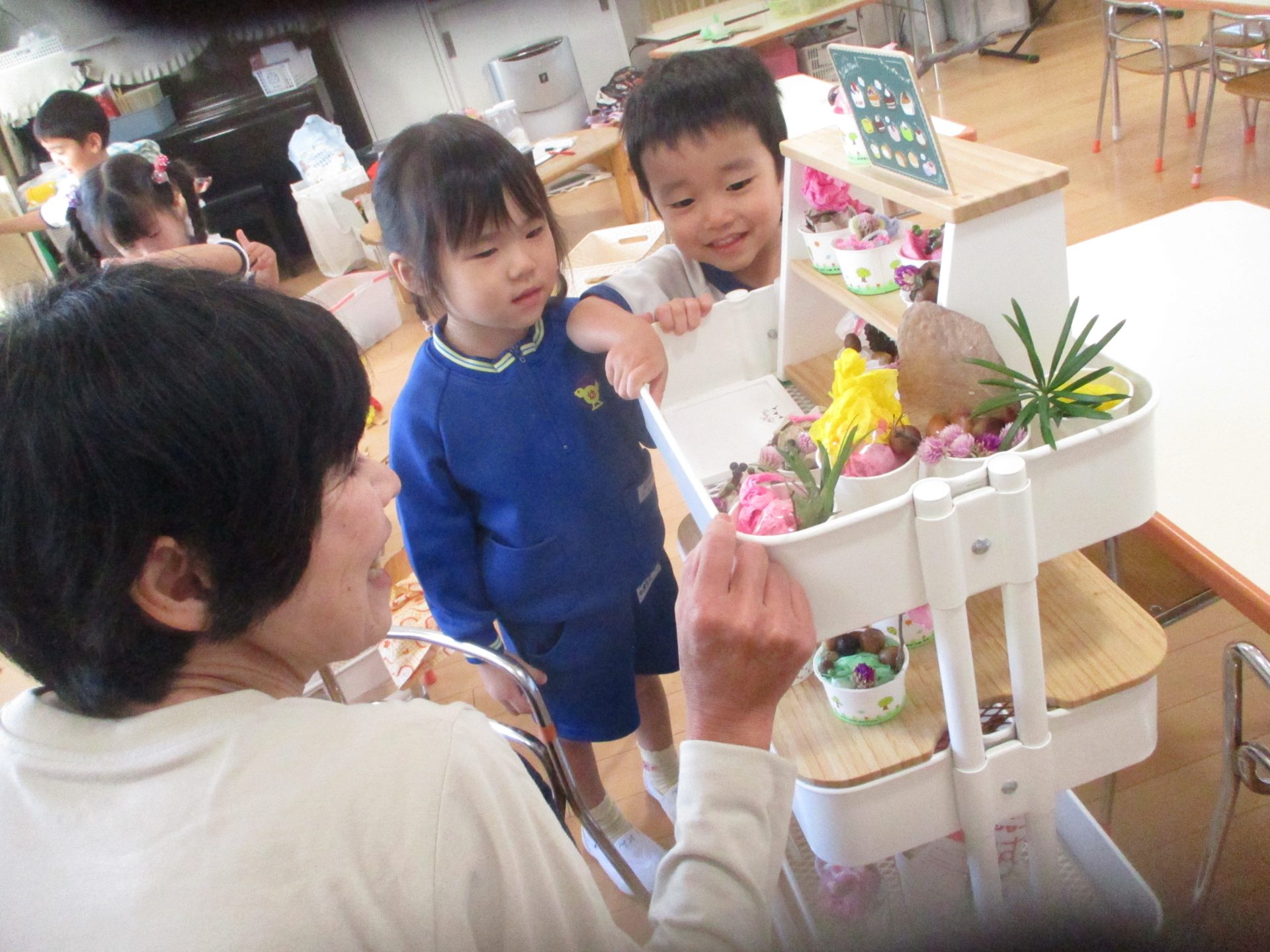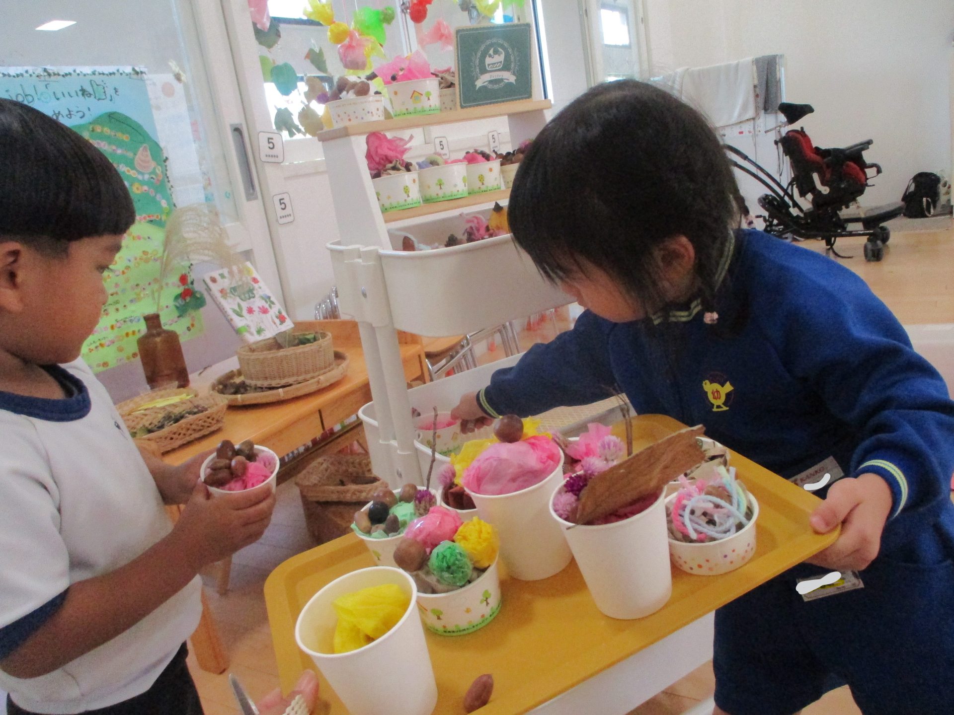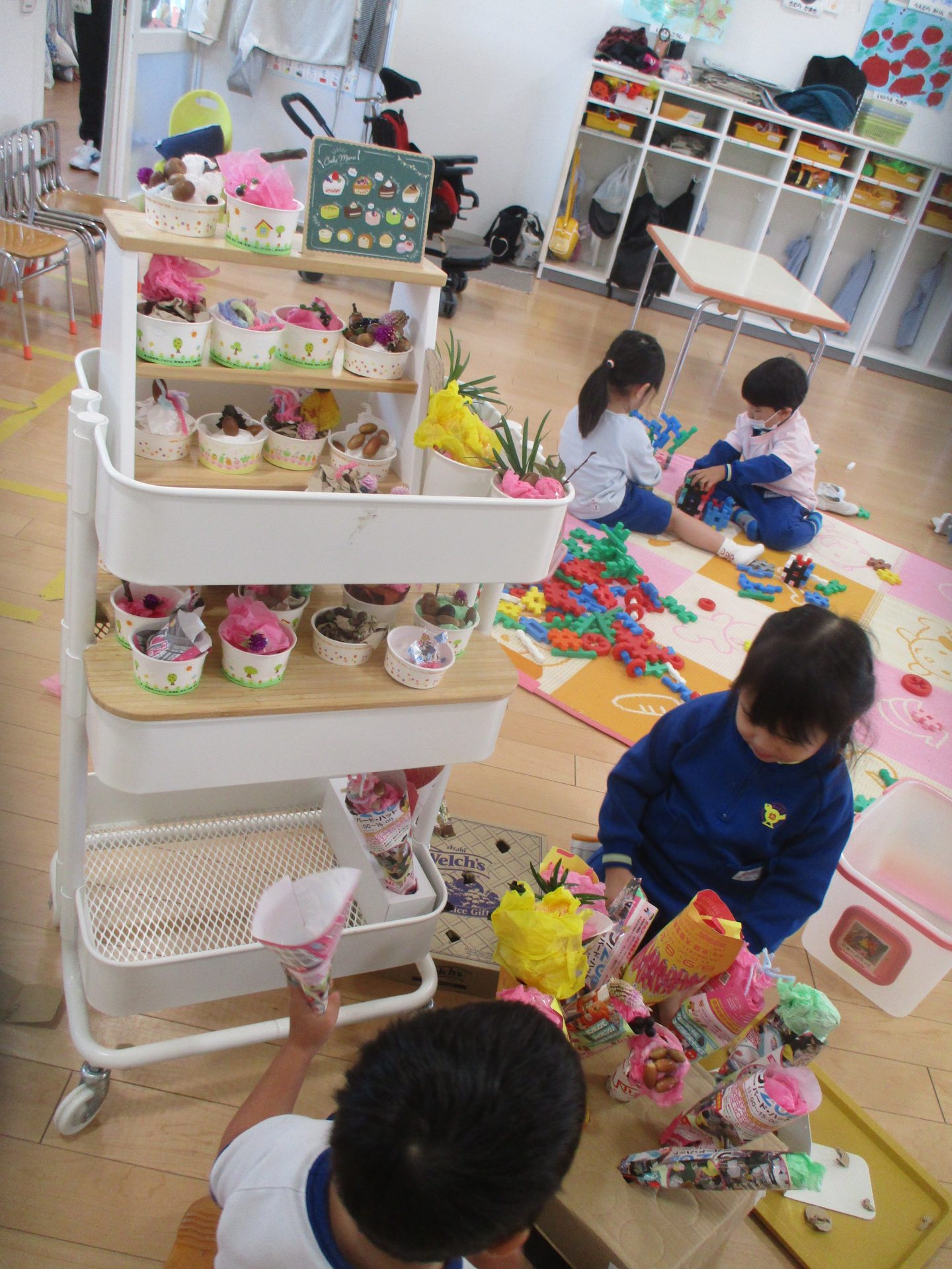 自分達で準備したことが実現していくと、鼻高々です。園に帰ると、少し前から作っていたどんぐりケーキを「くじらじまみたいに並べたい!」ときれいに並べ始めました。今回の経験も、また新たな遊びへ繋がってきています。わくわくしますね。