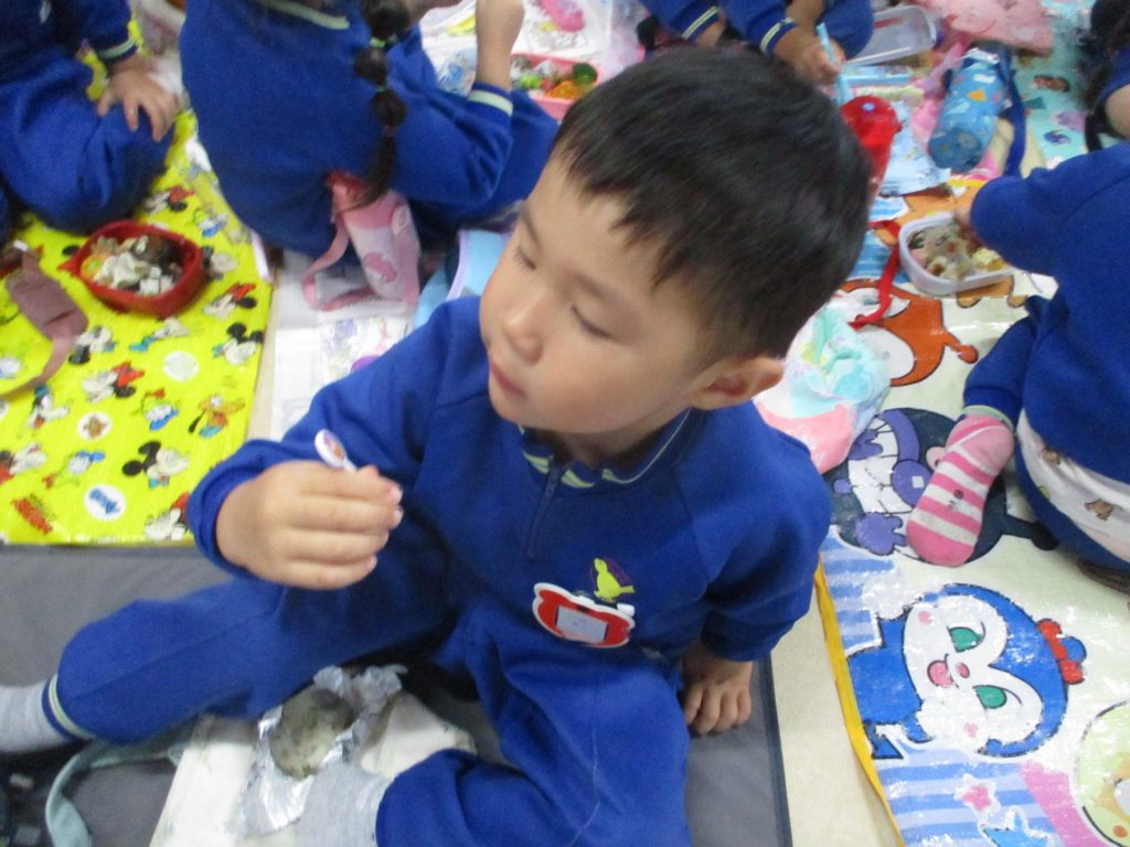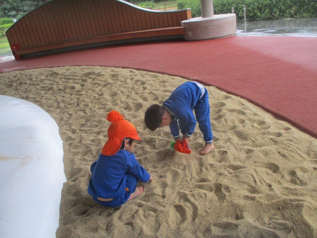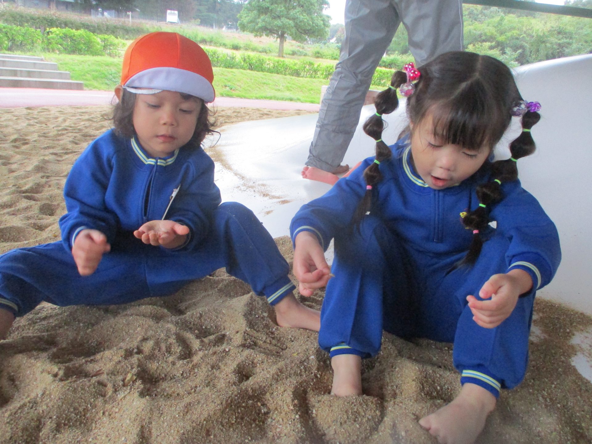 自分達で準備したことが実現していくと、鼻高々です。園に帰ると、少し前から作っていたどんぐりケーキを「くじらじまみたいに並べたい!」ときれいに並べ始めました。今回の経験も、また新たな遊びへ繋がってきています。わくわくしますね。