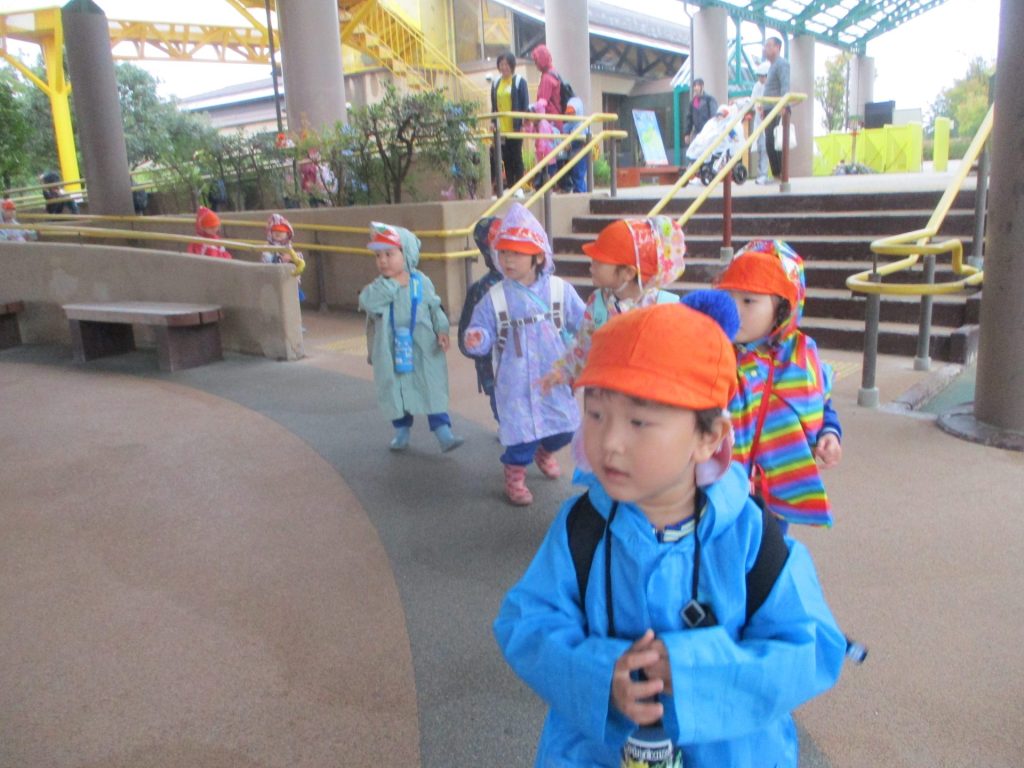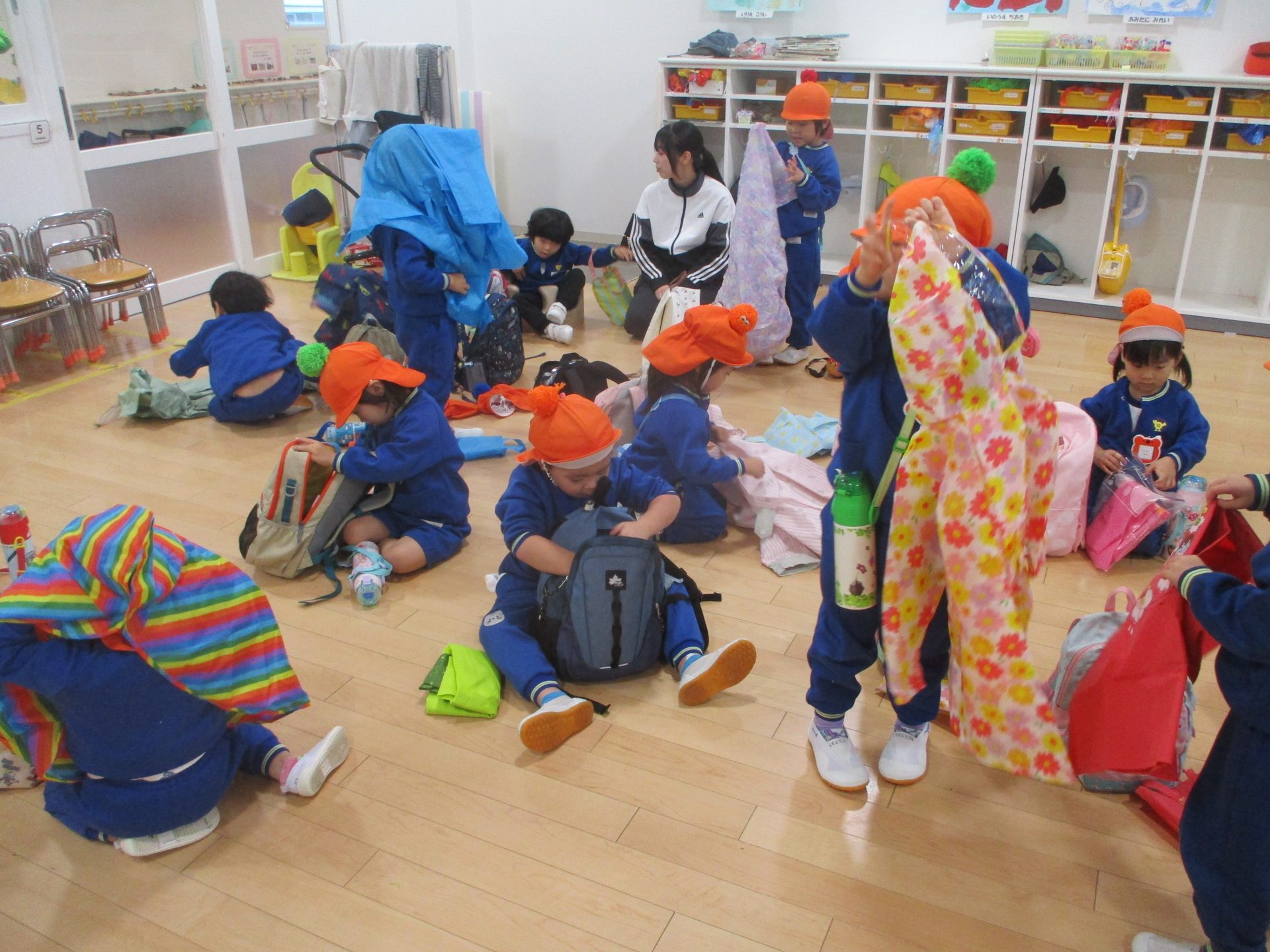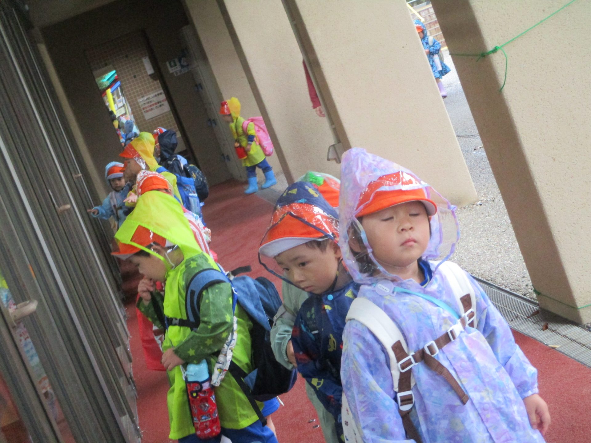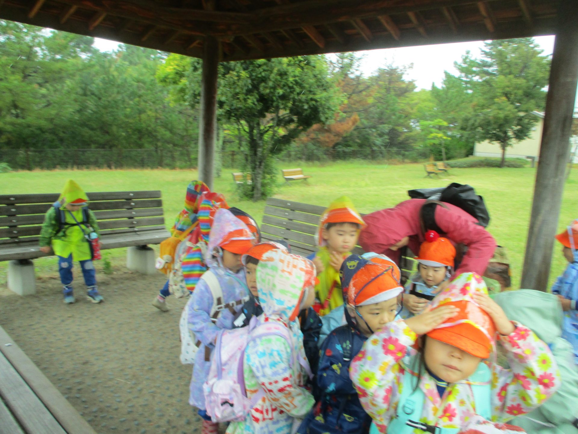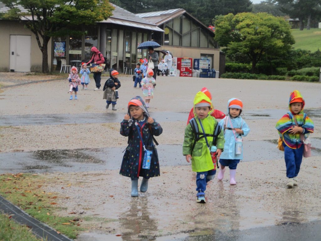 10月31日はらっきょうウォークを兼ねた秋の園外保育でした。あいにくの雨でしたが、子ども達はカッパを着れると大張り切り!難しいけれど、頑張って自分で着ましたよ。雨のお散歩に出発進行!