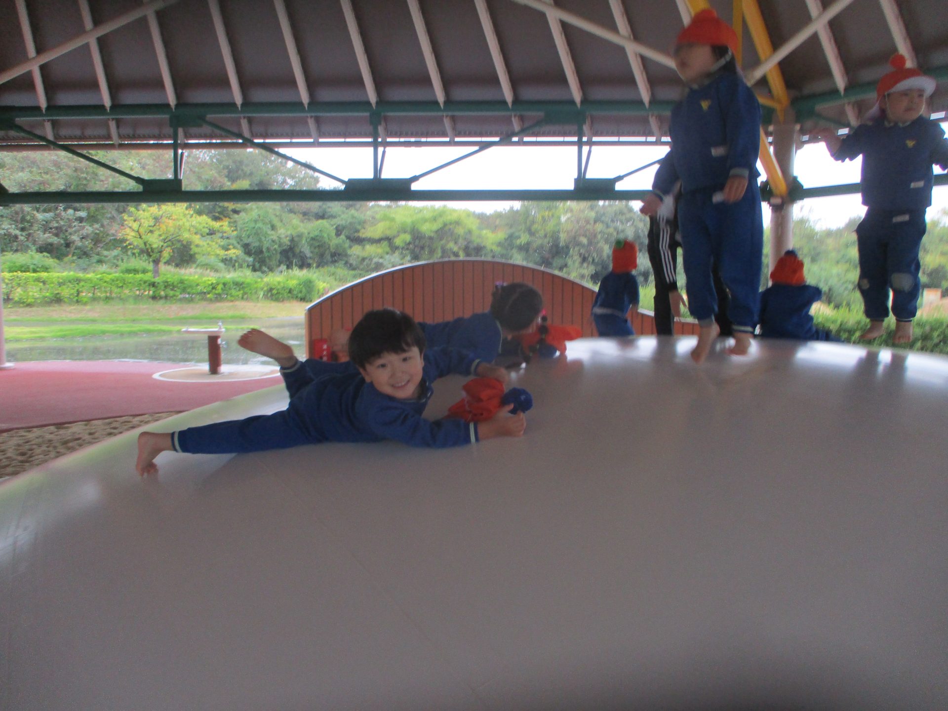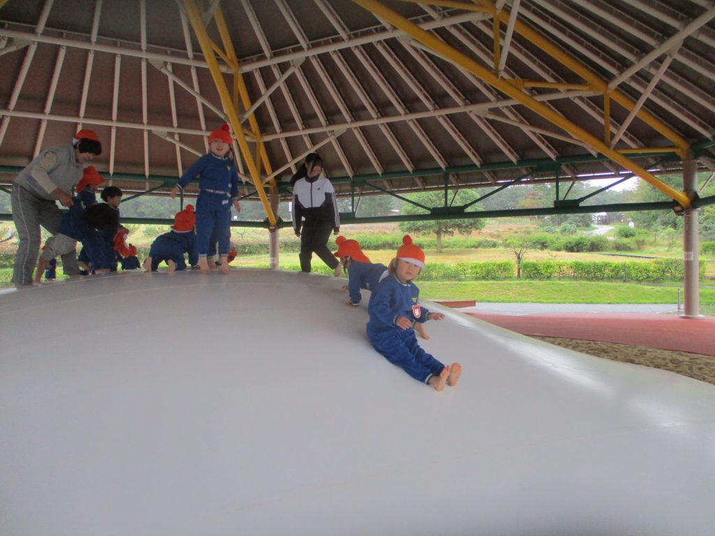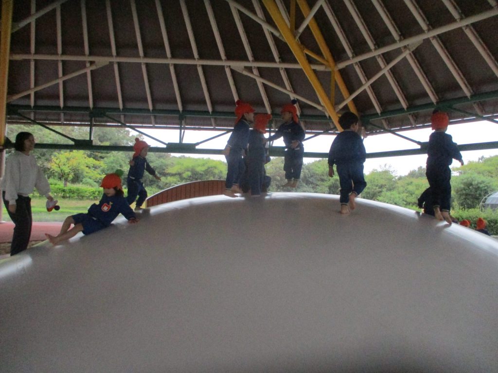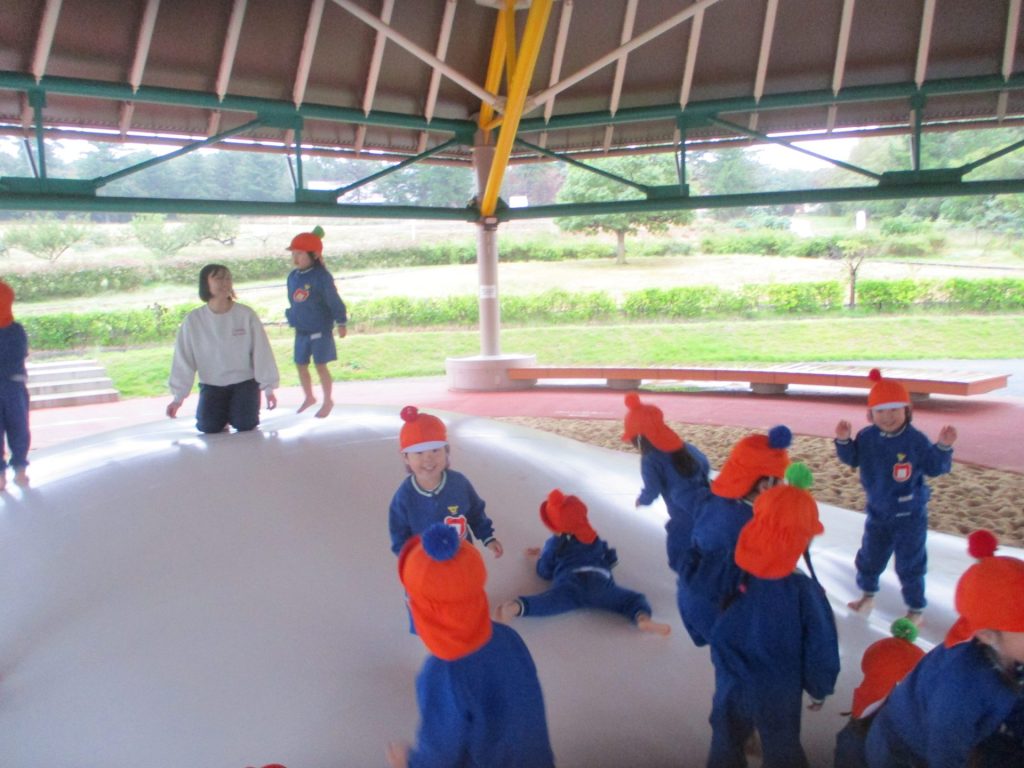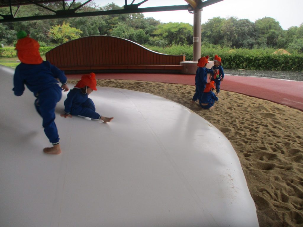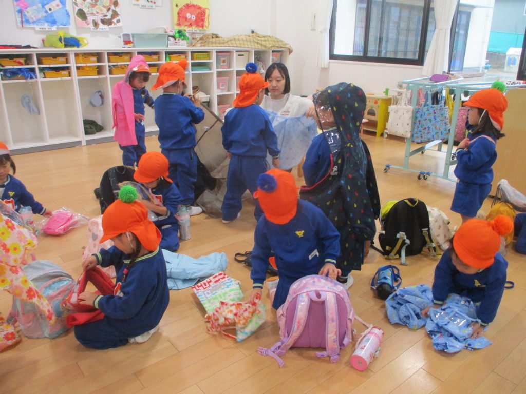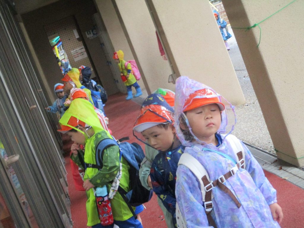10月31日はらっきょうウォークを兼ねた秋の園外保育でした。あいにくの雨でしたが、子ども達はカッパを着れると大張り切り!難しいけれど、頑張って自分で着ましたよ。雨のお散歩に出発進行!