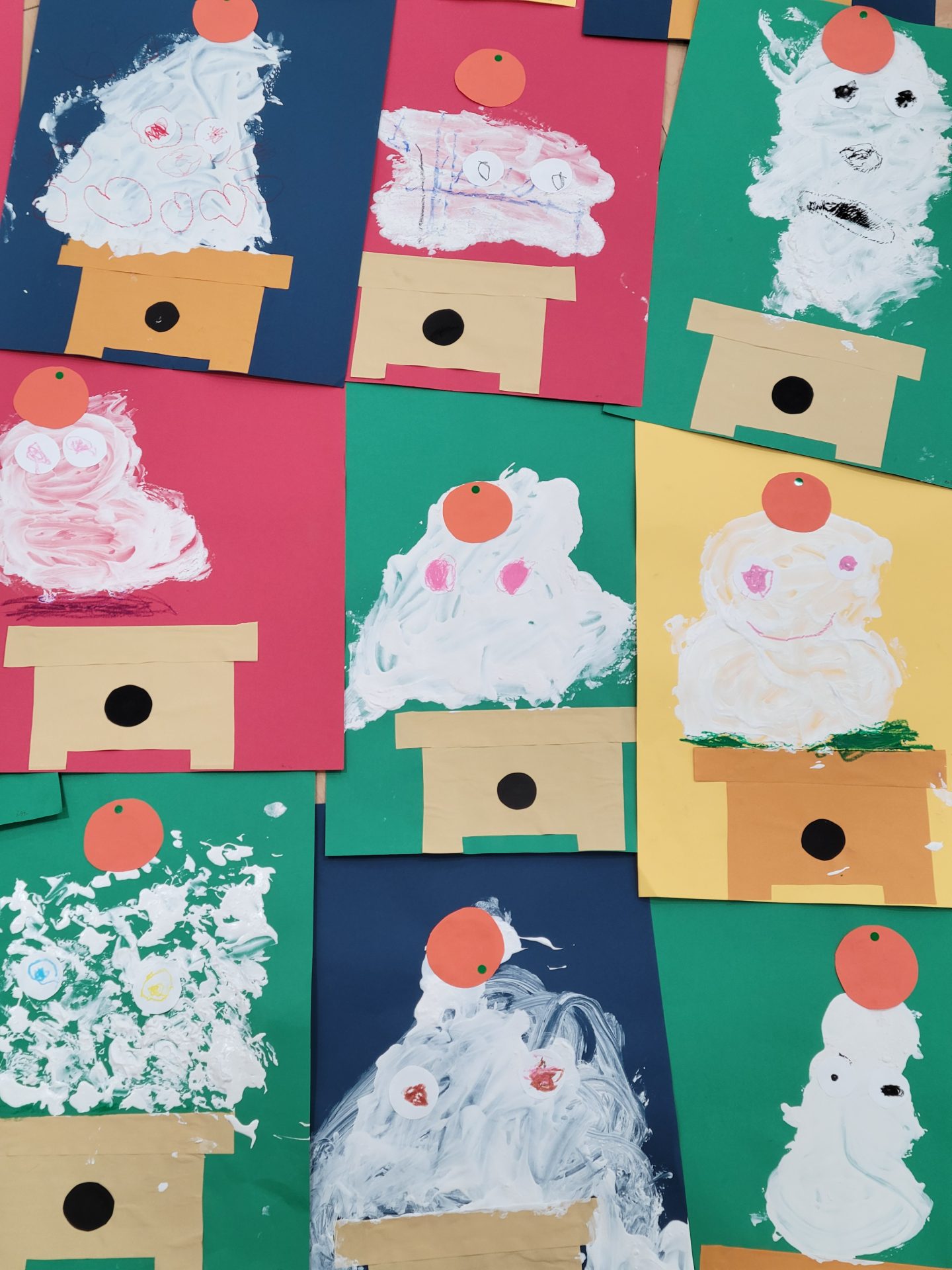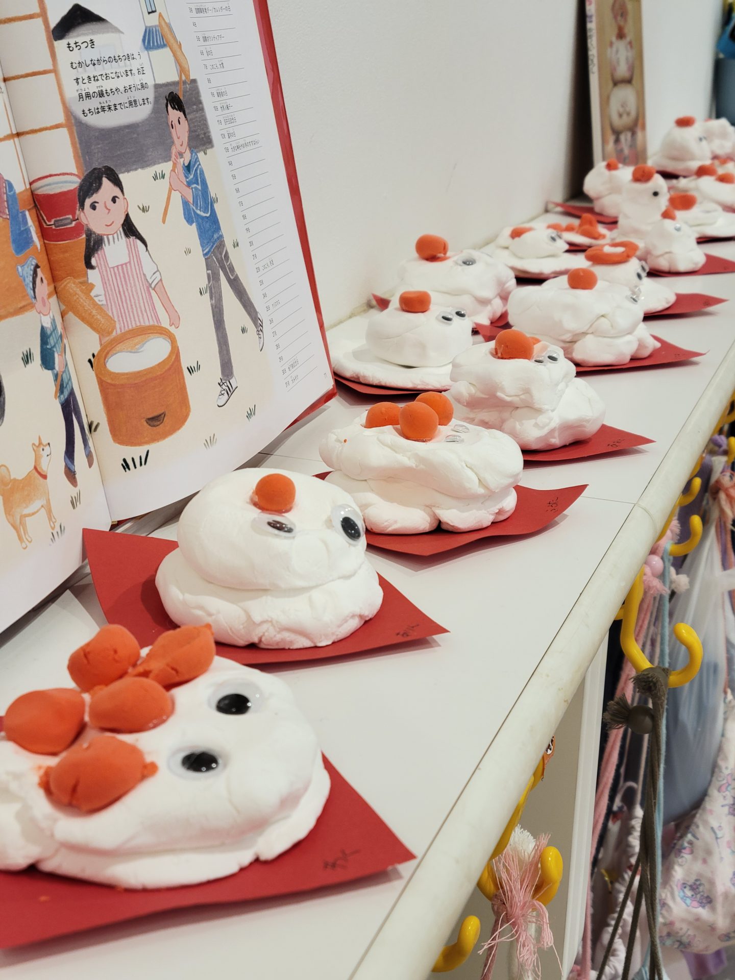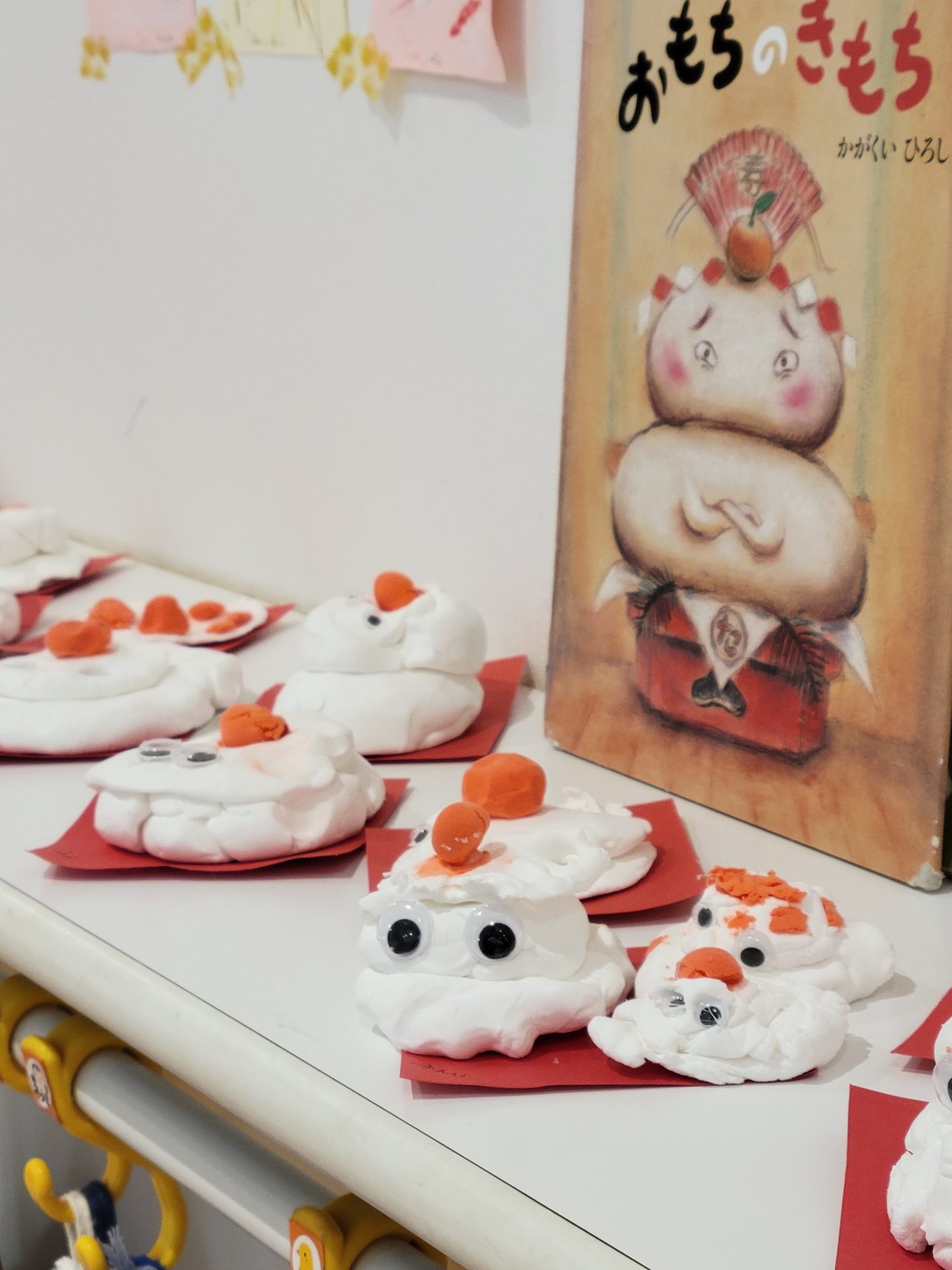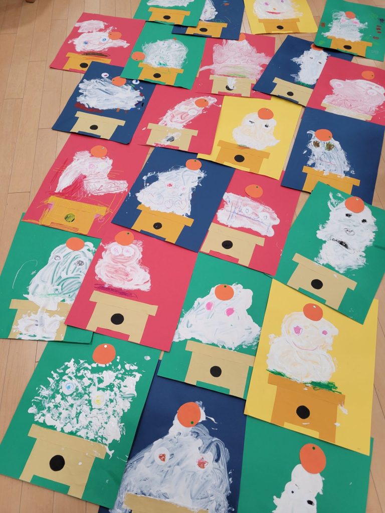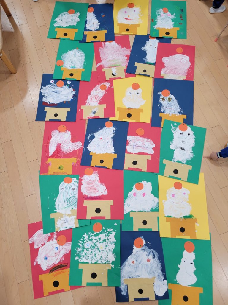 ふわふわ絵の具を使って描きました。「おもちのきもち」の絵本の世界観から、目玉もつきました。かがみもちくんは今にも動き出しそうです。