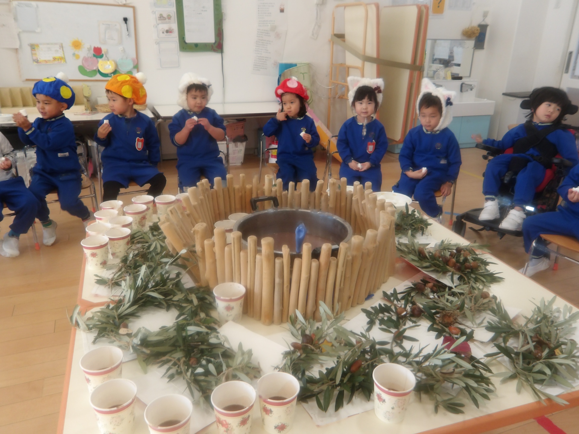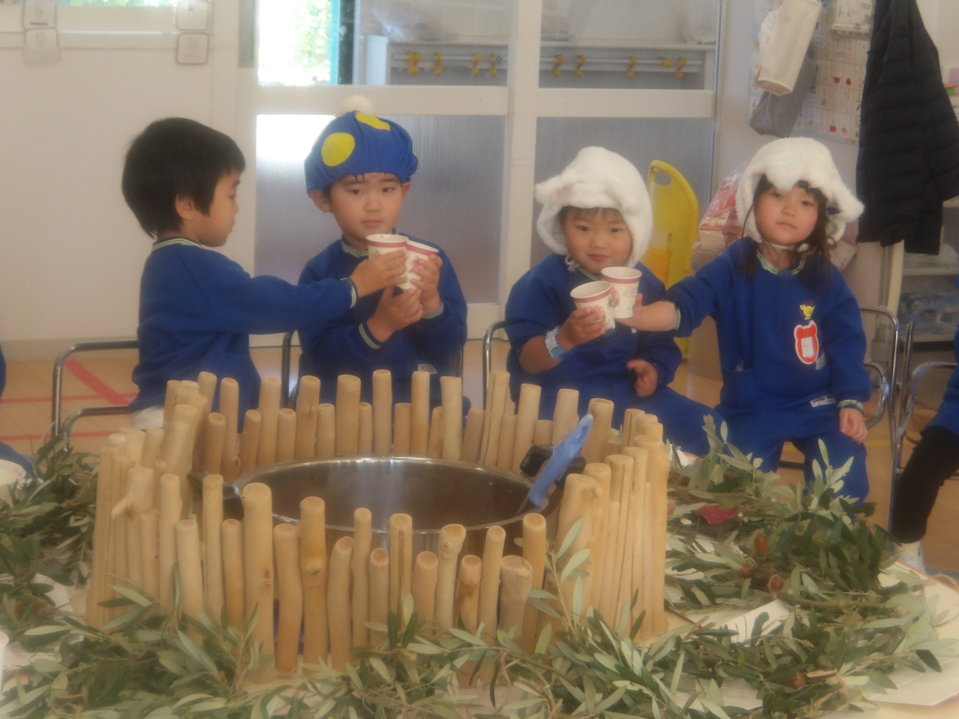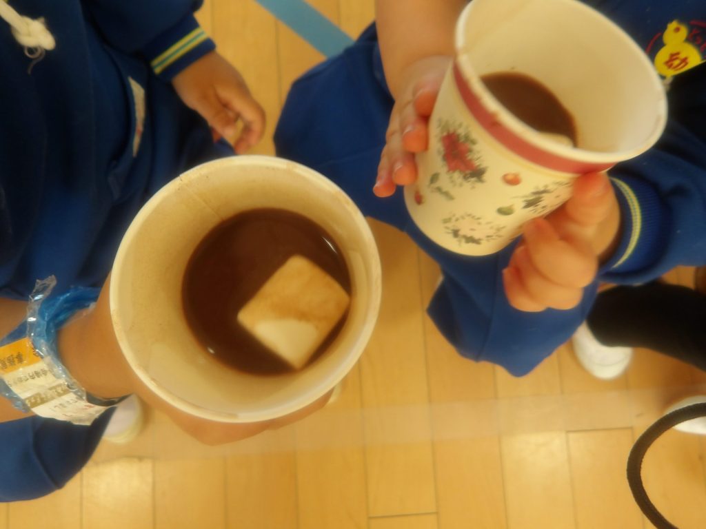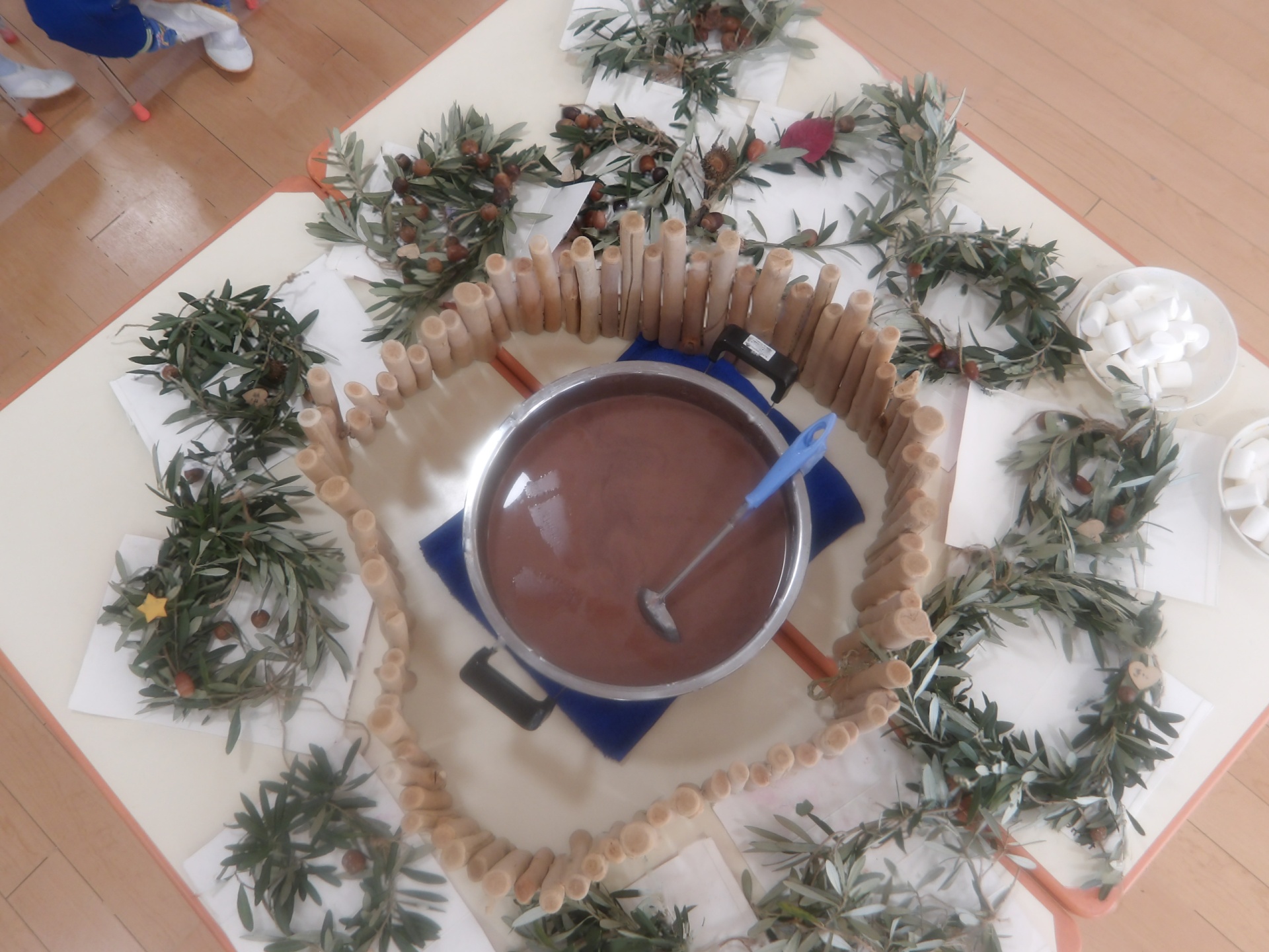 ③「おいしいものがたべたい!」ということで、クリスマスのスペシャルドリンク、スモアココアを飲みました。お鍋の周りには、みんなが作ったリースが並んで特別感たっぷり!豆乳で作ったあたたかいココアにマシュマロが溶けて、特別なお味♡おかわりも大人気でした。自分達で考えたことを進めていくのはやっぱり特別感があって楽しいです。発表会、がんばったね!