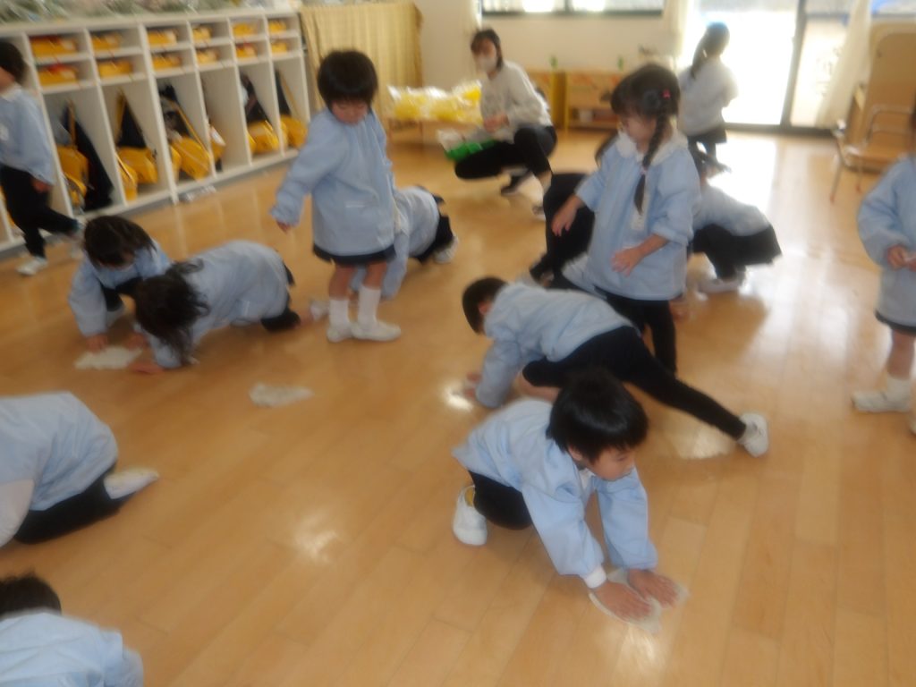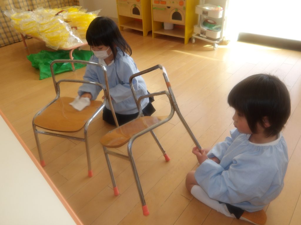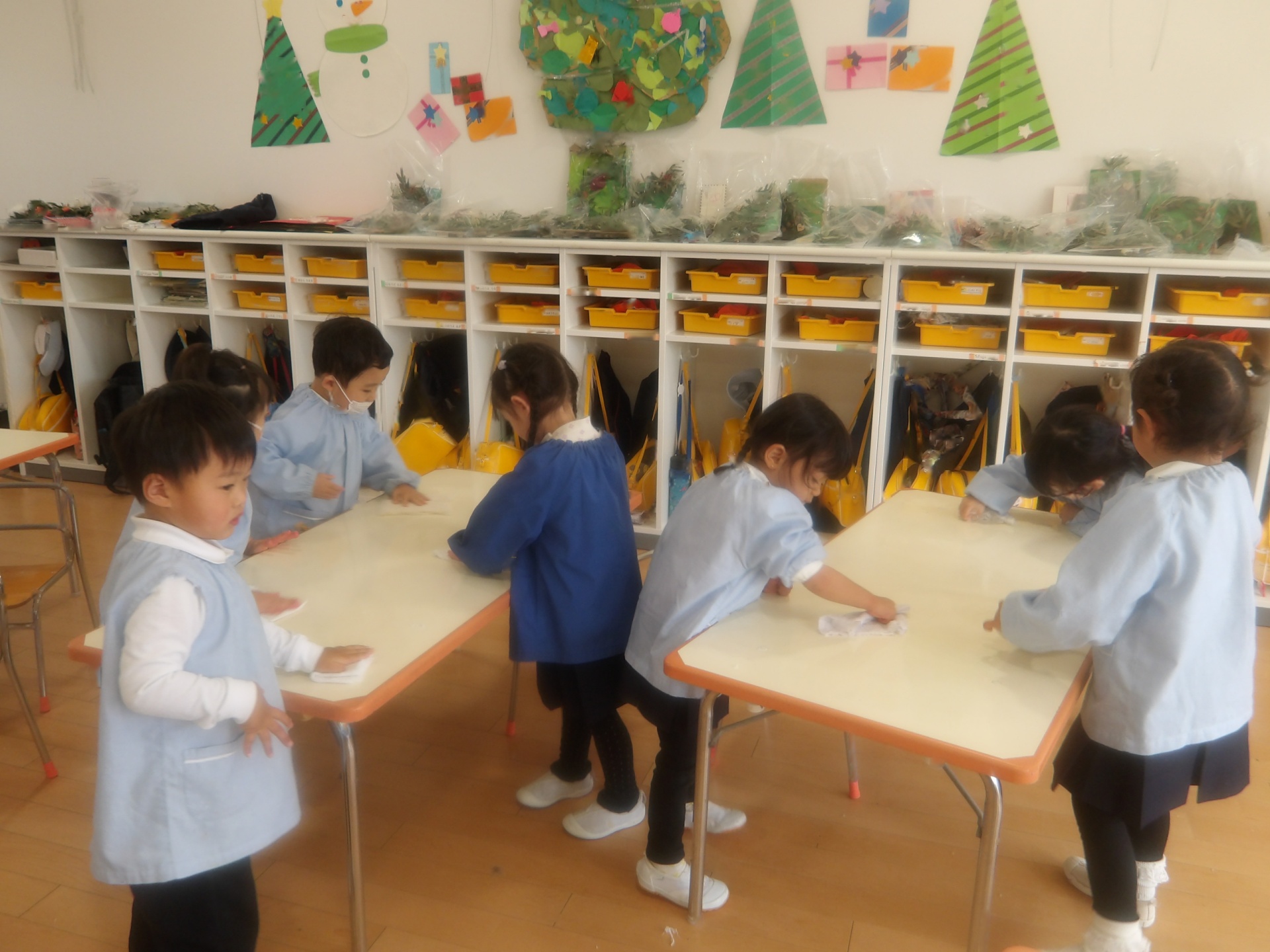 大掃除 気持ち良く新しい年を迎えられるよう、保育室の大掃除をしました。椅子や机を磨いたり、床拭きに挑戦してみたり、お道具箱やロッカーの整理整頓をしました。掃除してピカピカになると気持ちがいいですね。
