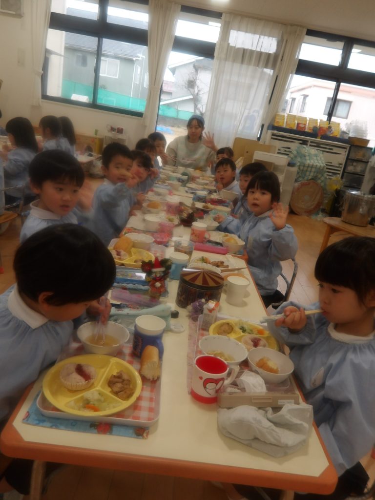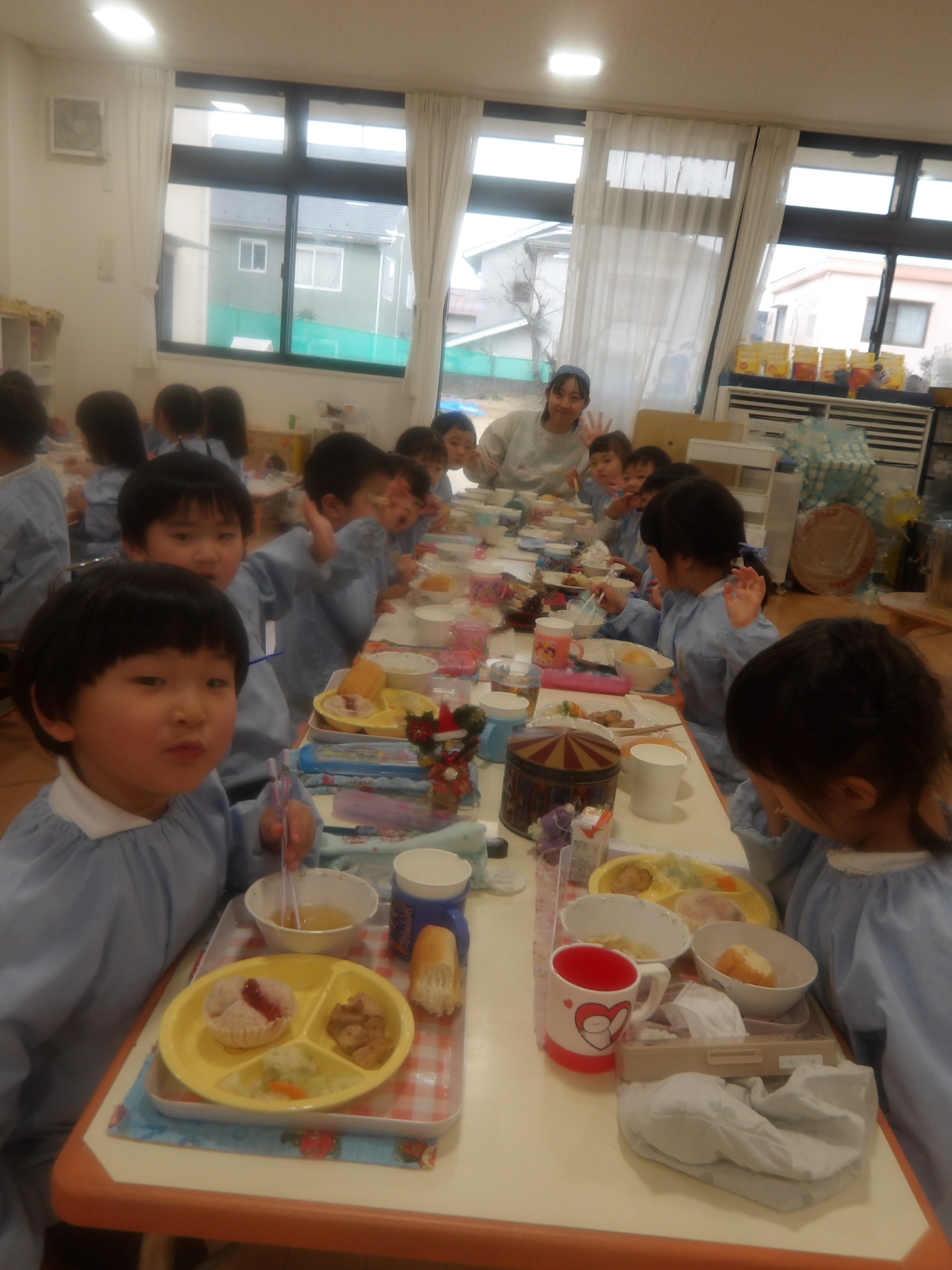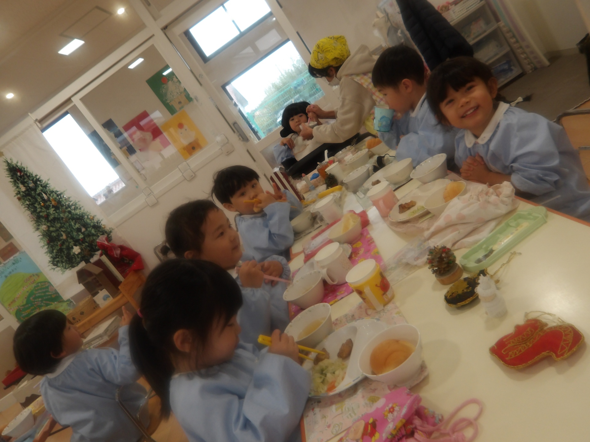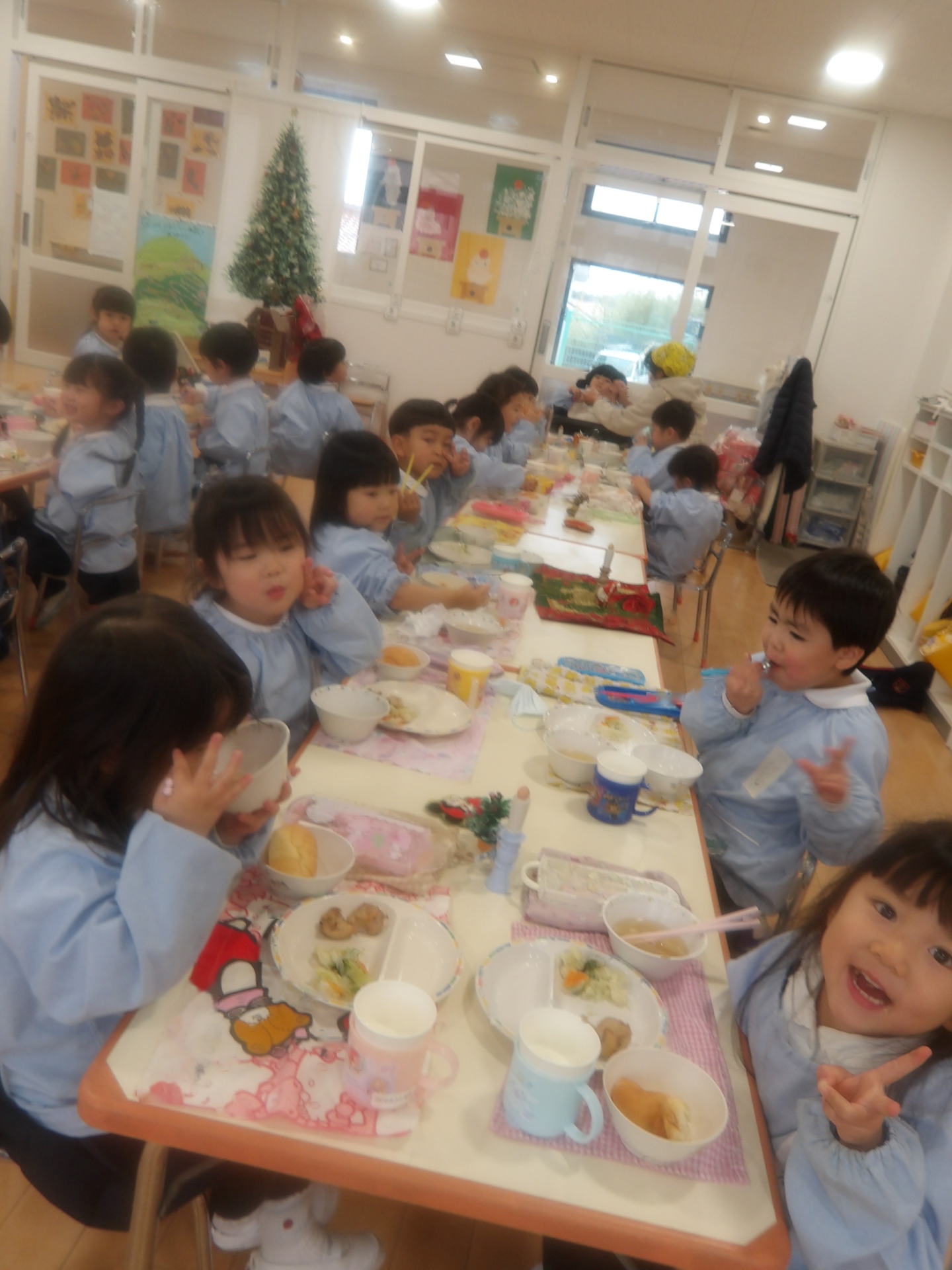 最後の給食はクリスマスメニュー!クリスマスデコレーションをしてパーティーっぽい雰囲気で楽しみました。このあとケーキも食べ、大満足です。