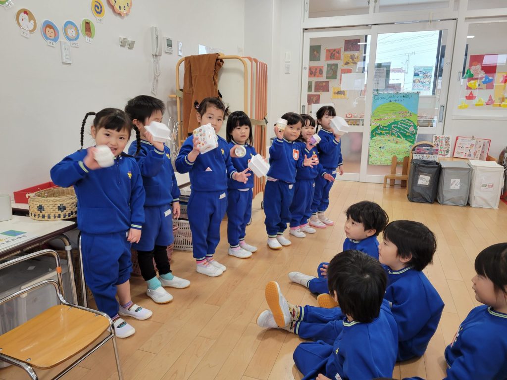 中に入れる材料を変えることで、音色が変わることに気付き、いろいろな材料を入れて楽しんでいます。今日はうさぎ組にいき、「雪だるまのチャチャチャ」の演奏を披露しました。