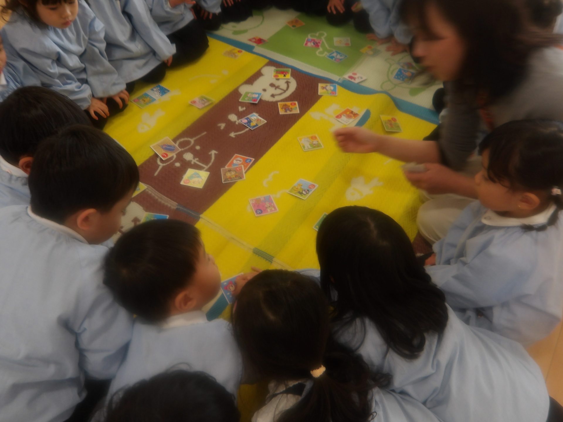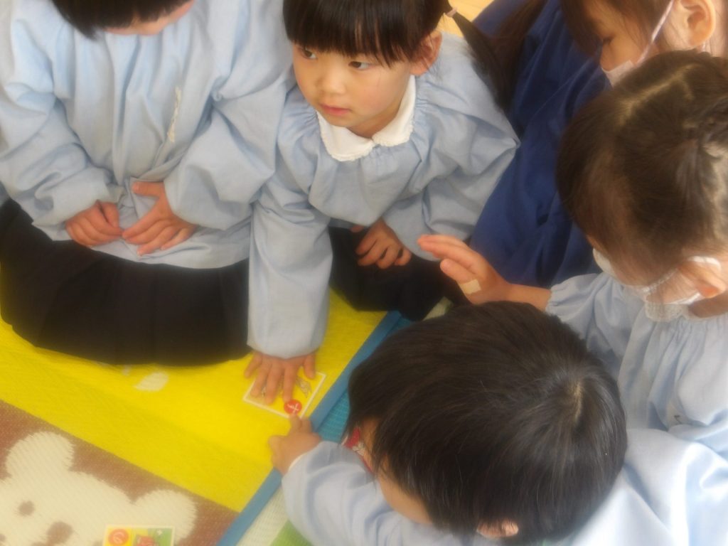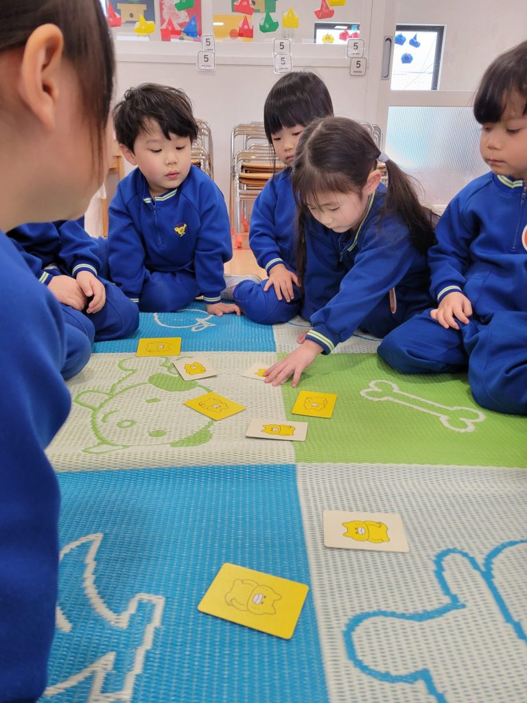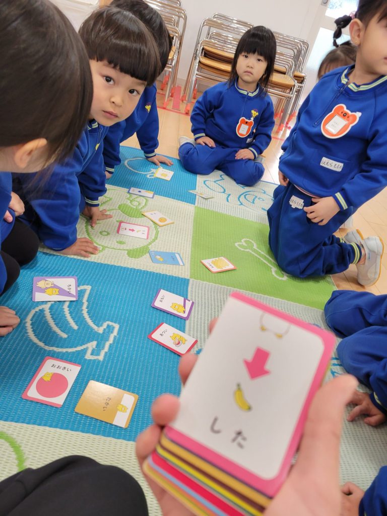 カルタ遊びから発展して、反対言葉の絵合わせカード遊びが始まりました。「はんたいこtば・・・?」と不思議そうな表情でしたが、だんだん仕組みが分かってきて楽しくなってきたようです。