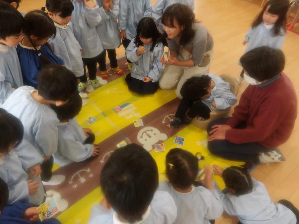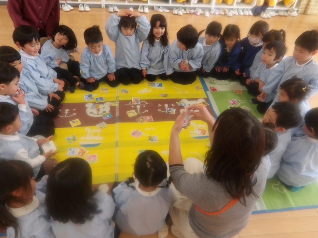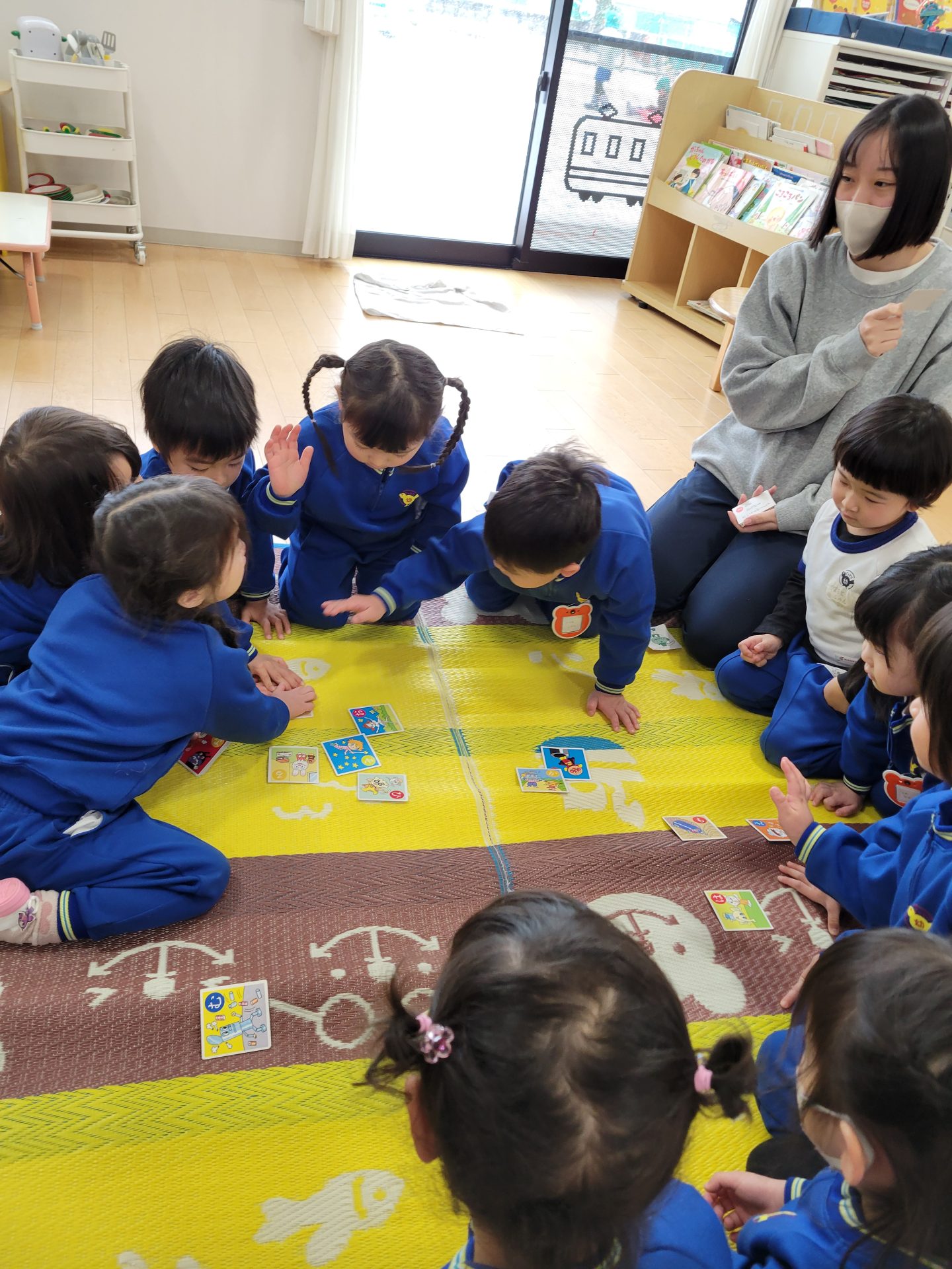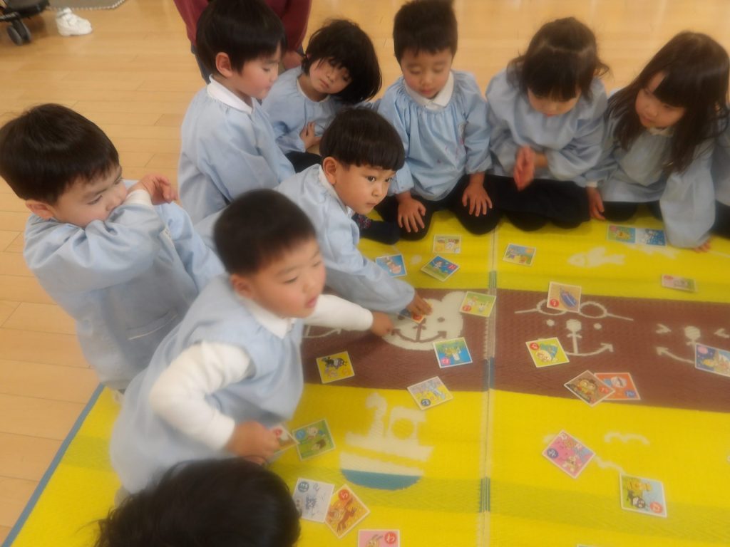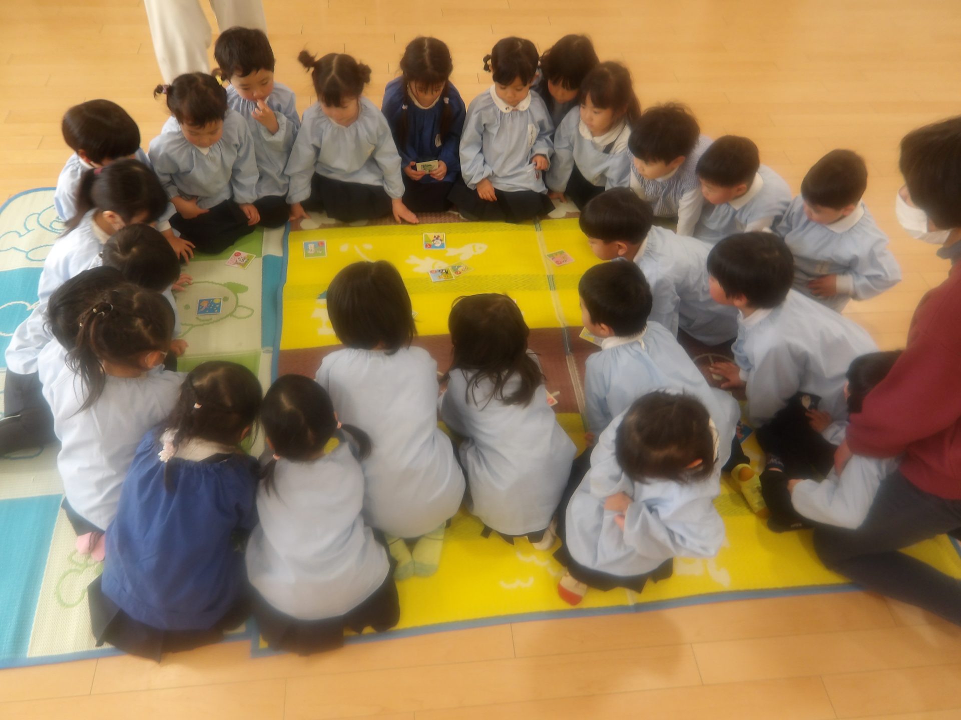 カルタ大会 みんなでアンパンマンかるたに挑戦!読まれる内容によ~く耳を澄まして、一致する絵札を探します。もうひらがなを読んでいるお友達もいてびっくりしました!