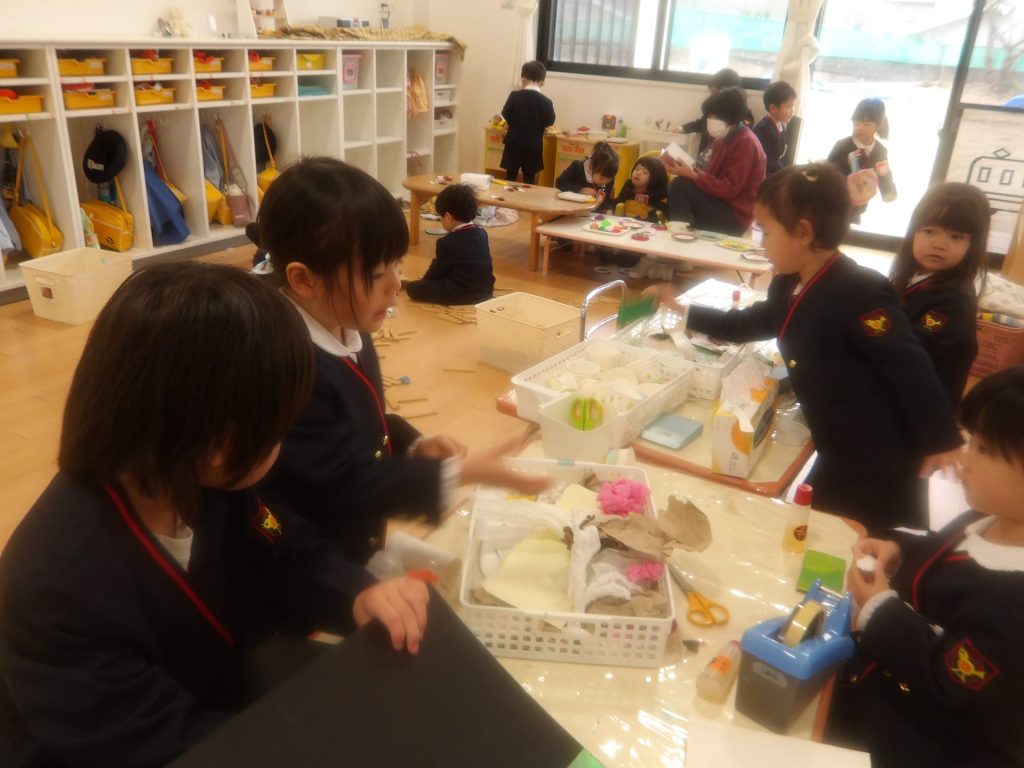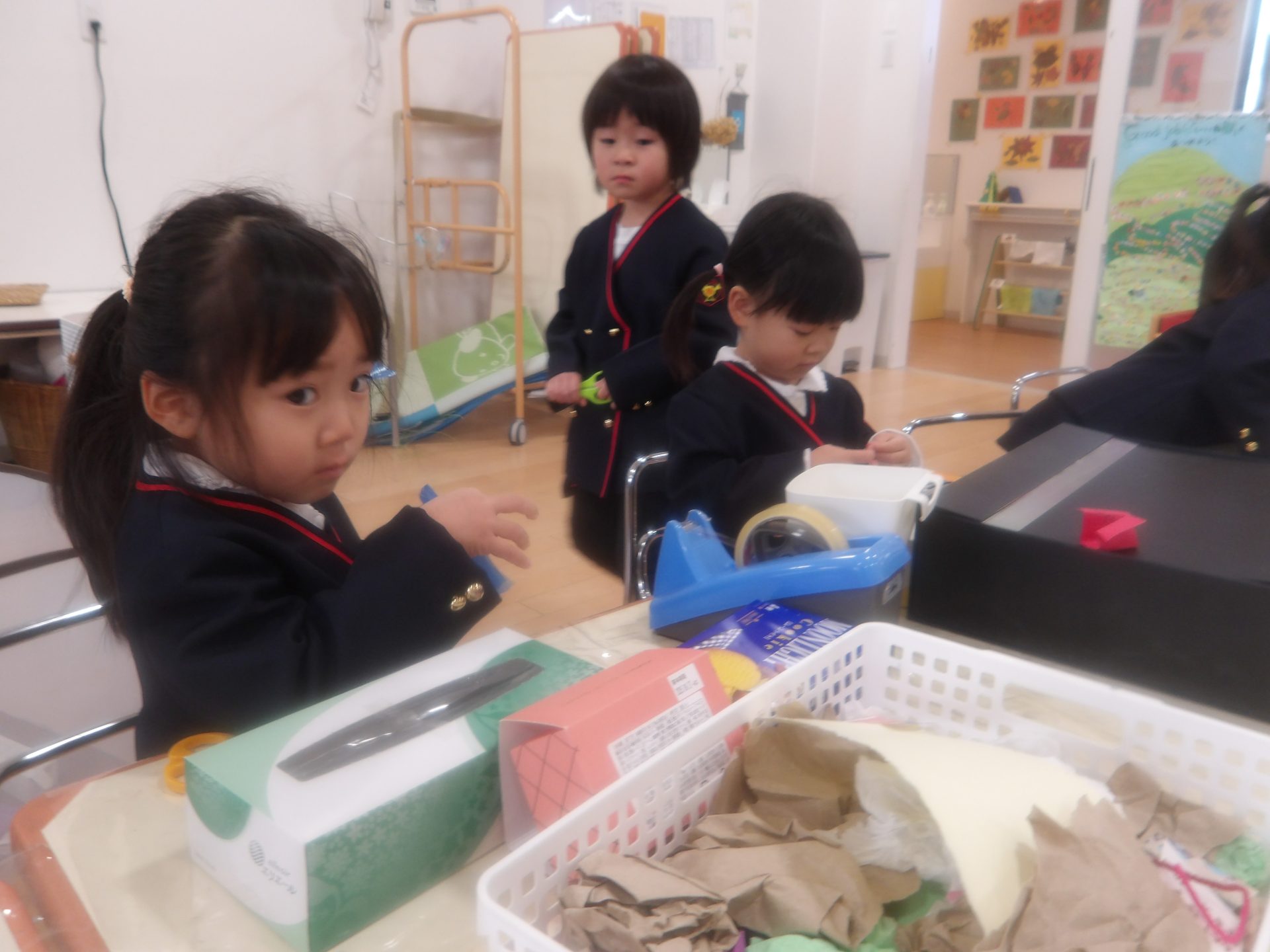 3学期は工作コーナーにリサイクル材が登場!みんな張り切って箱やカップを繋げて遊び始めました。いろいろな材料や道具を使ってみること自体が楽しい時期です。いろいろ大作をを持って帰られると思いますが、お子様の「できた!」の気持ちを受け止めていただけましたらと思います。