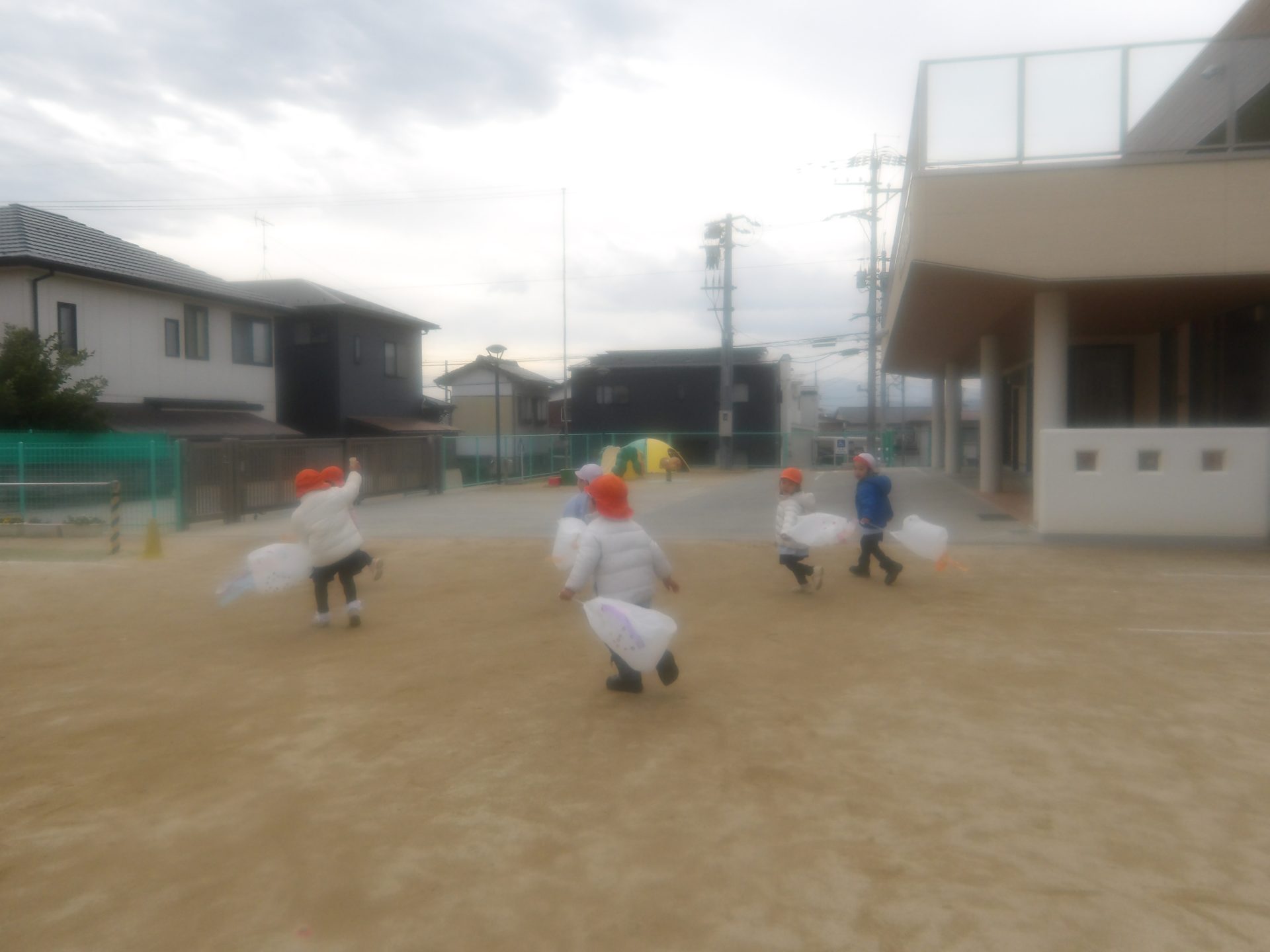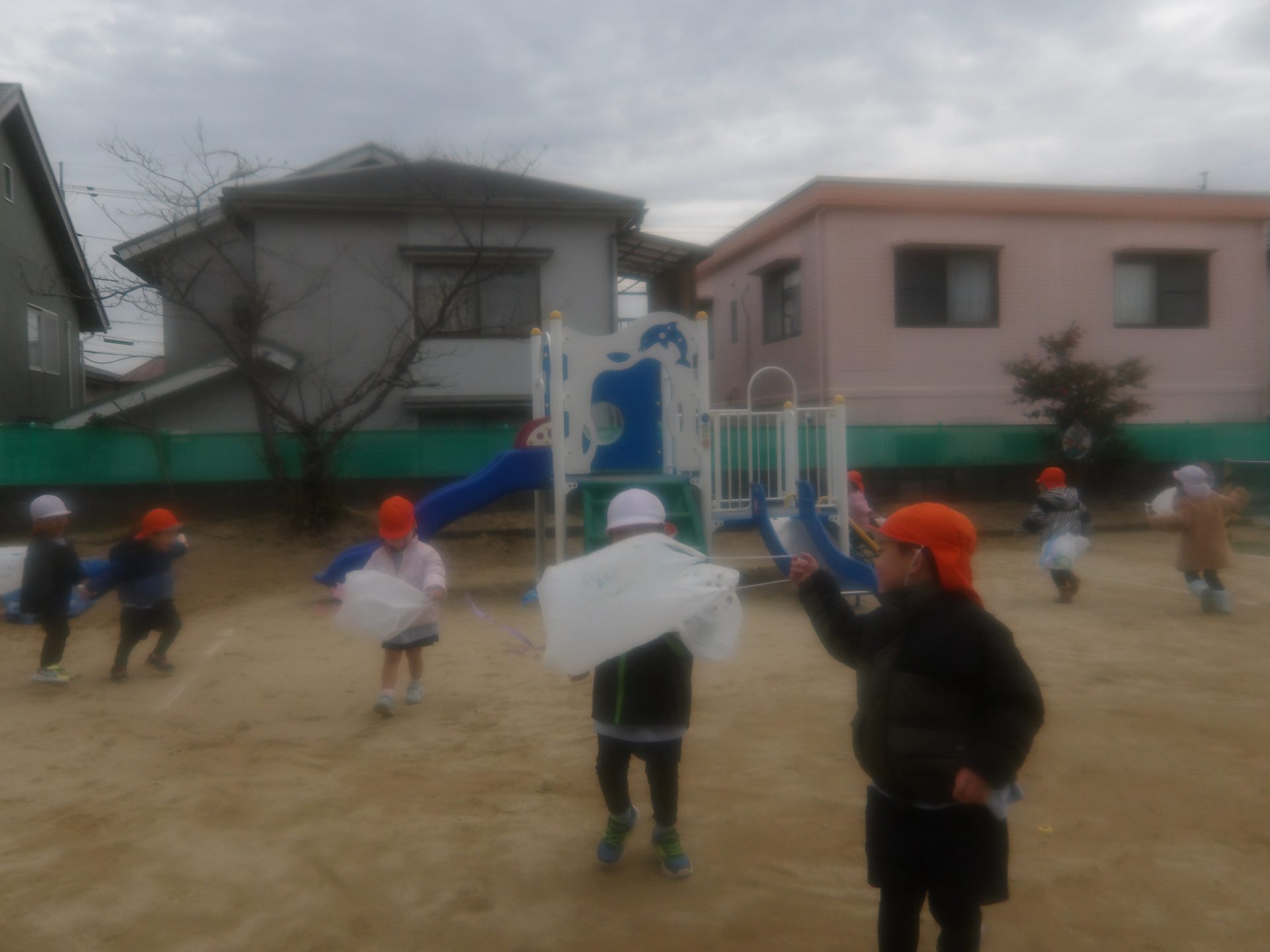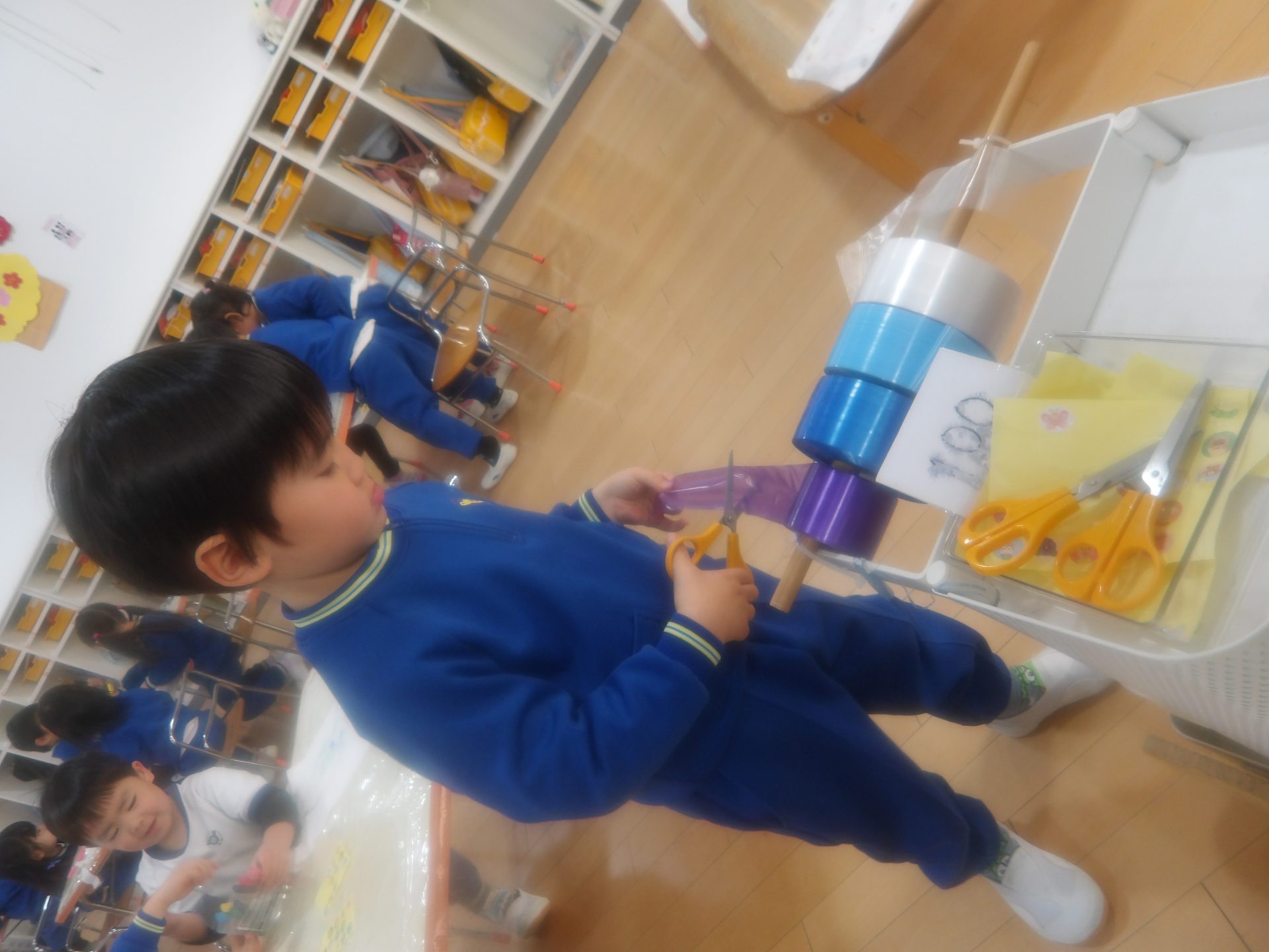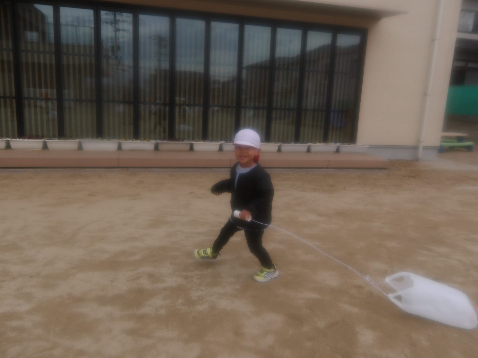 凧あげ遊びのはじまり!風を感じて大はしゃぎです。少し怖いお友達もいるようですが、風の弱い日には安心して楽しむ事ができました。凧の持ち手にトイレットペーパーの芯がいる!ということで、たくさん持ってきていただきありがとうございました。皆様のご協力の元、お気に入りの凧になりました。