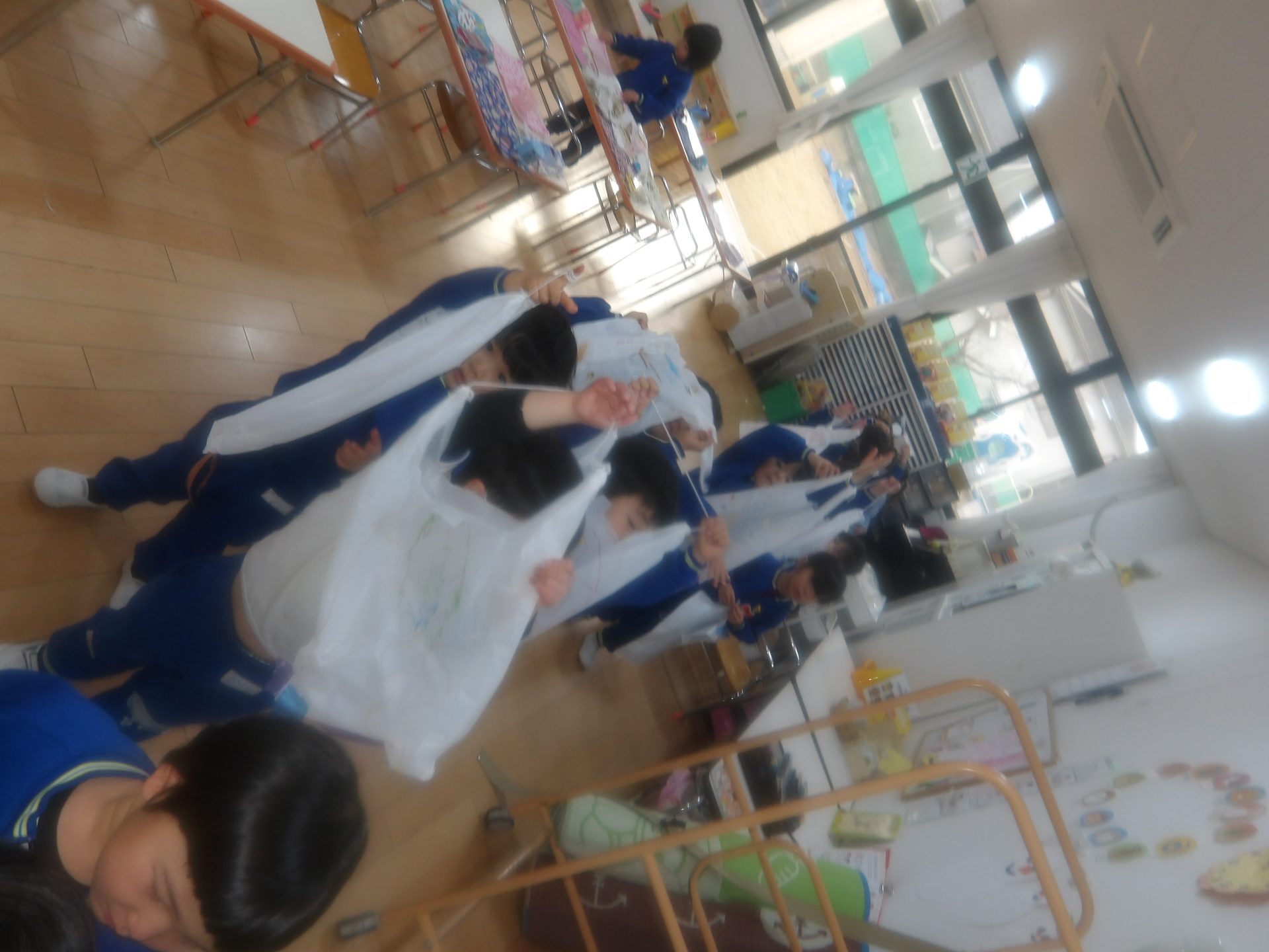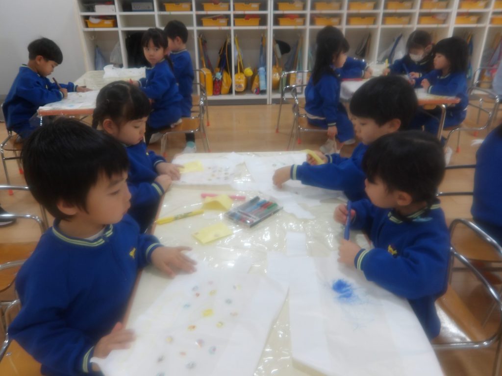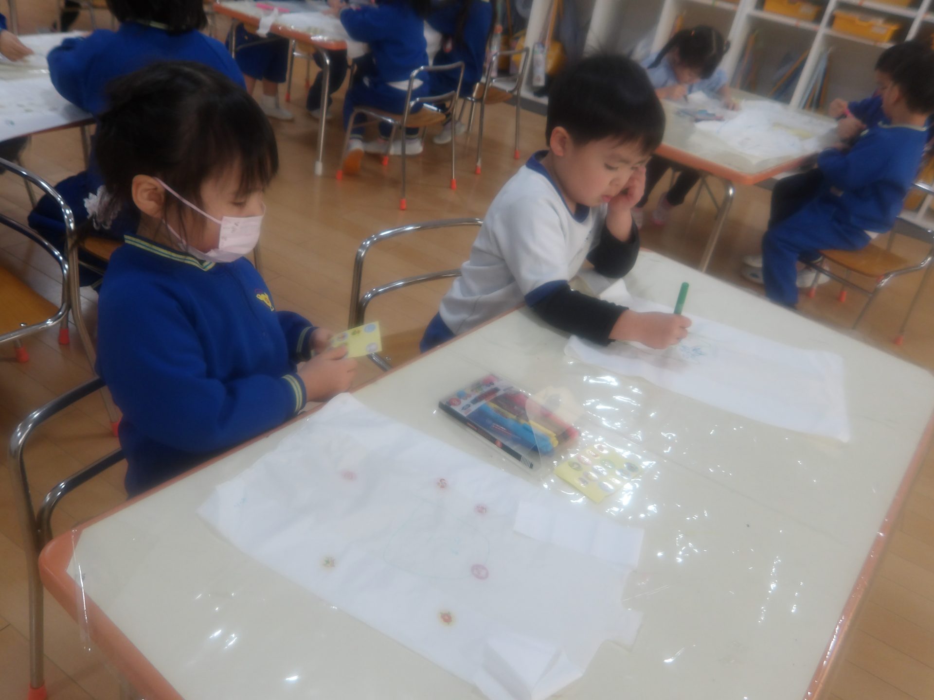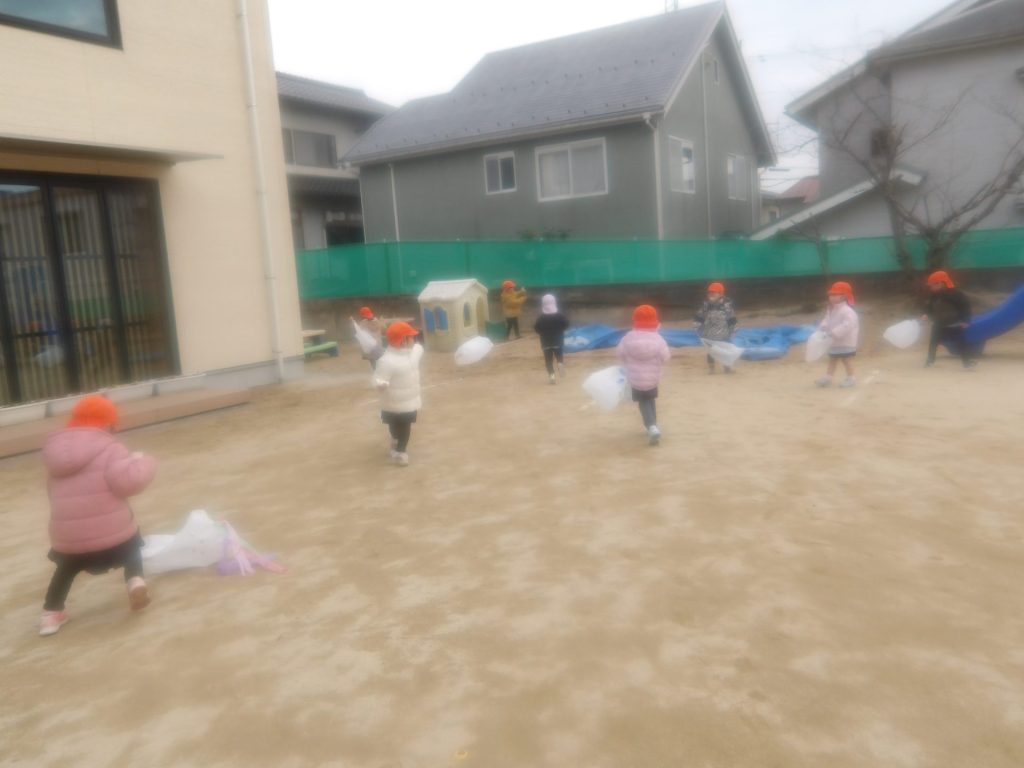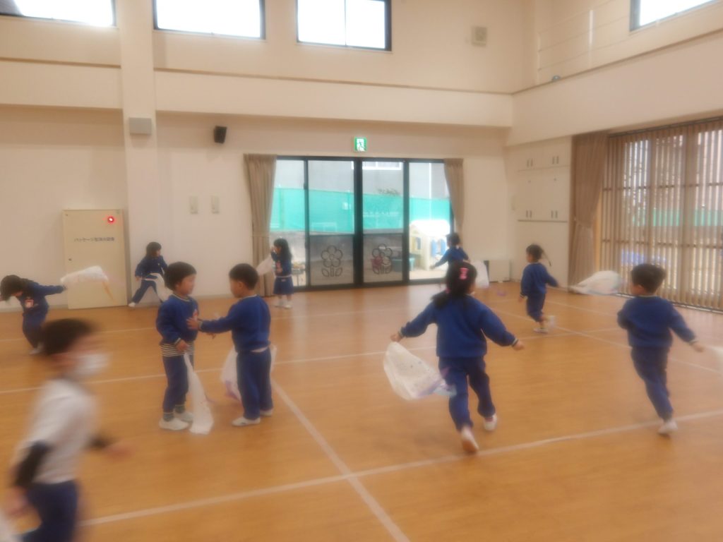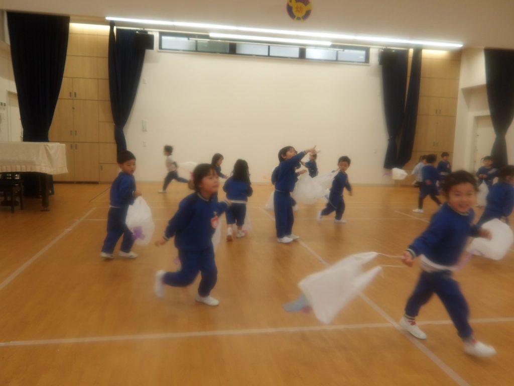 凧あげ遊びのはじまり!風を感じて大はしゃぎです。少し怖いお友達もいるようですが、風の弱い日には安心して楽しむ事ができました。凧の持ち手にトイレットペーパーの芯がいる!ということで、たくさん持ってきていただきありがとうございました。皆様のご協力の元、お気に入りの凧になりました。