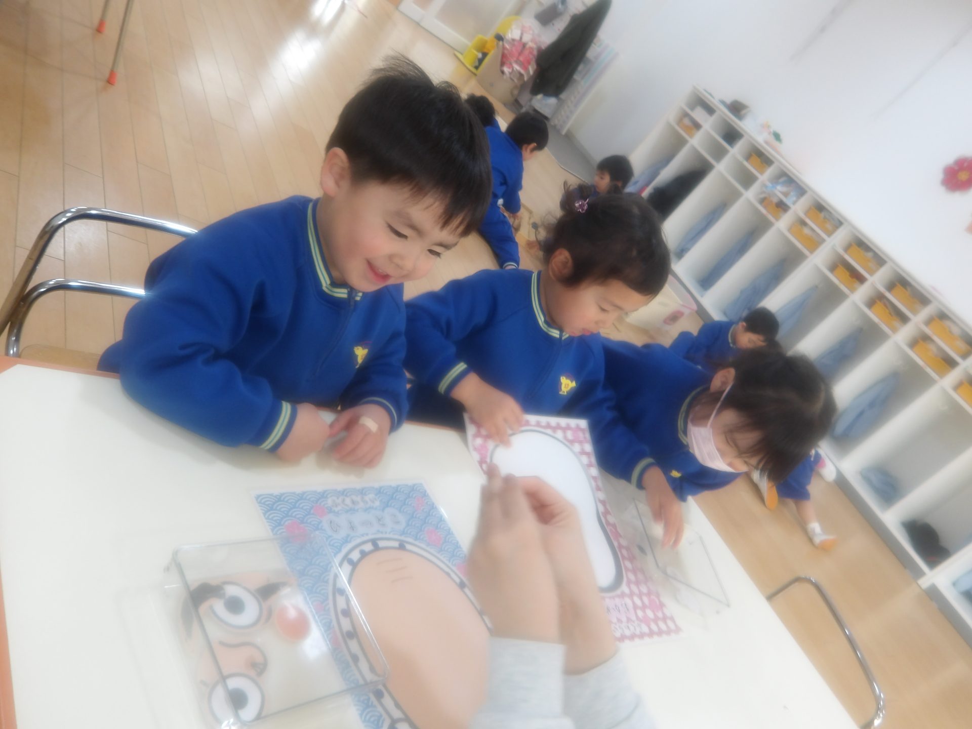 1月はお正月遊びを楽しんでいます。福笑いコーナーは自分でおもしろい位置に並べたり、手で目隠ししながら楽しんでいます。