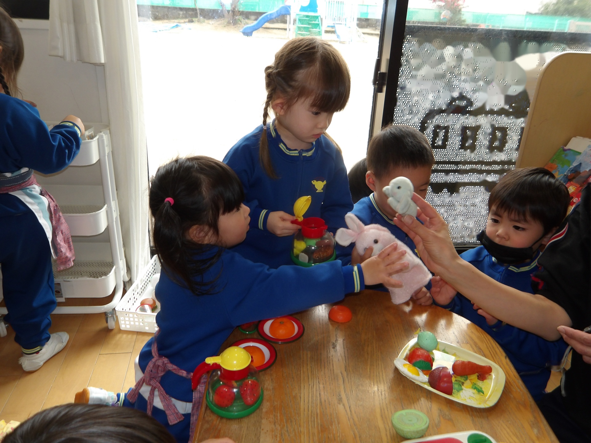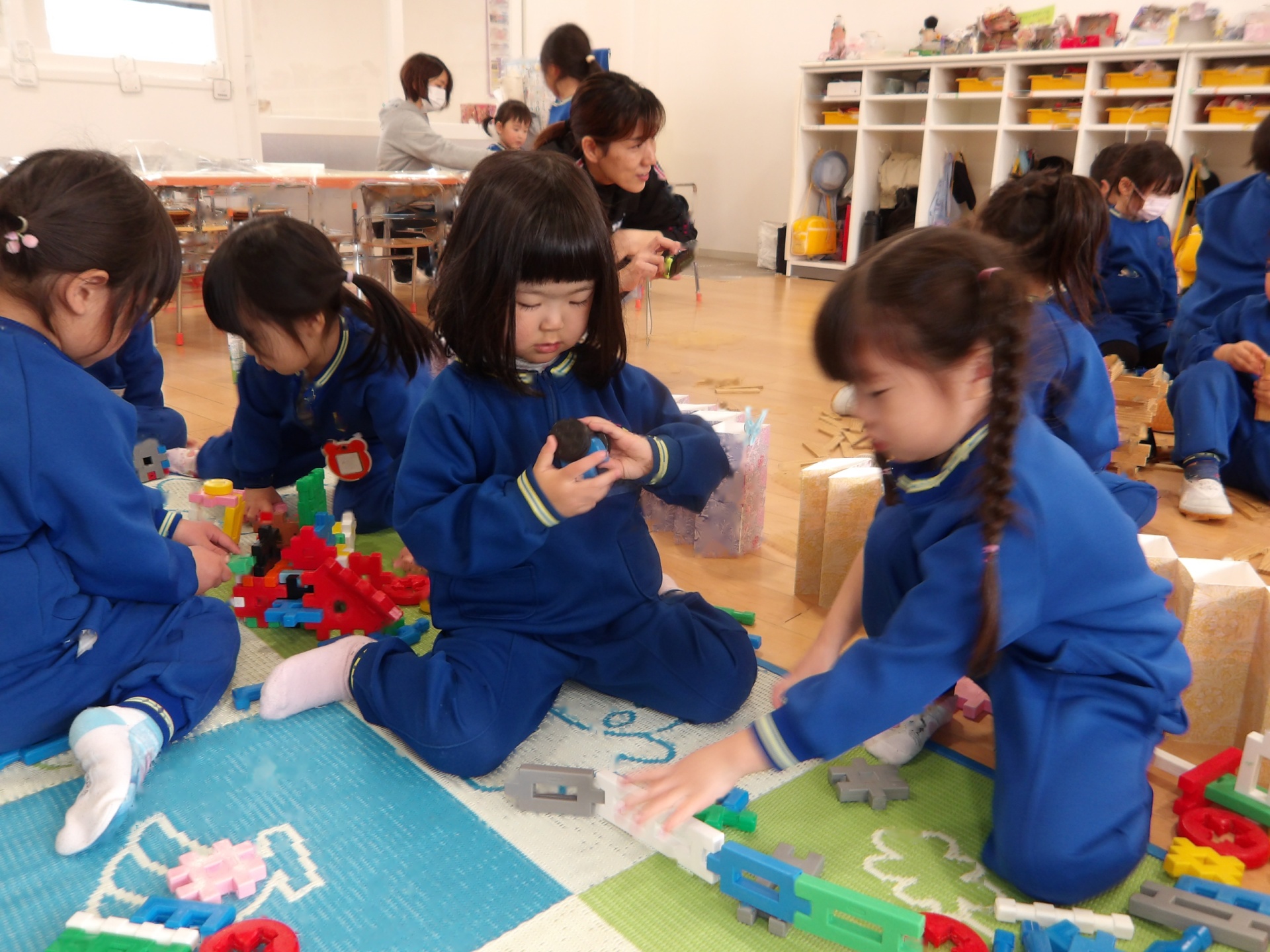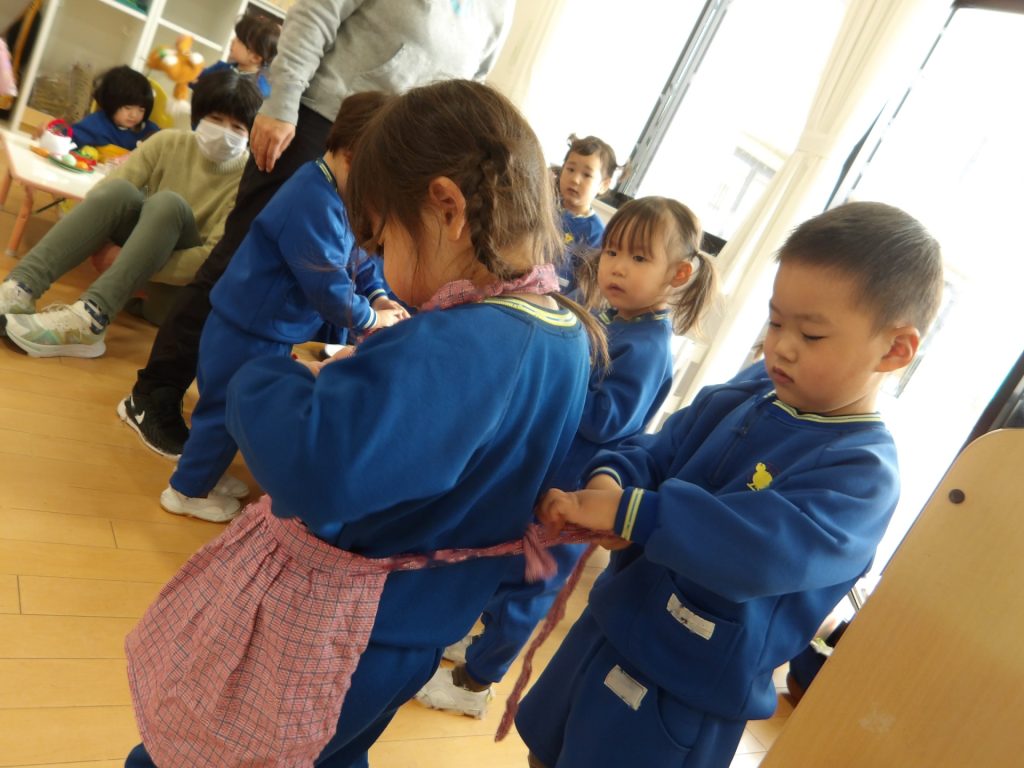 まだまだ緊張気味で、なかなか一緒に遊ぶ勇気を出せない友達もいますが、エプロンをまいてあげたり、欲しいものを作ってあげたり、優しく関わろうと張り切っています。年下の友達と関わる中で、お兄さん・お姉さんになった実感が湧いてきているようですよ。