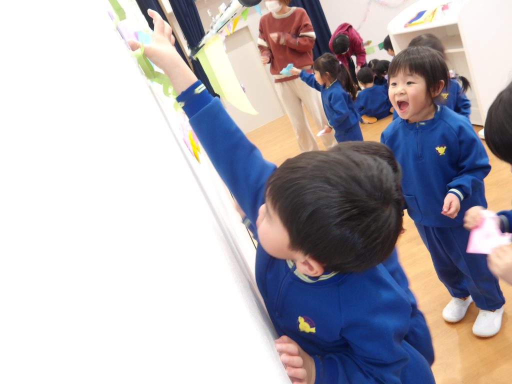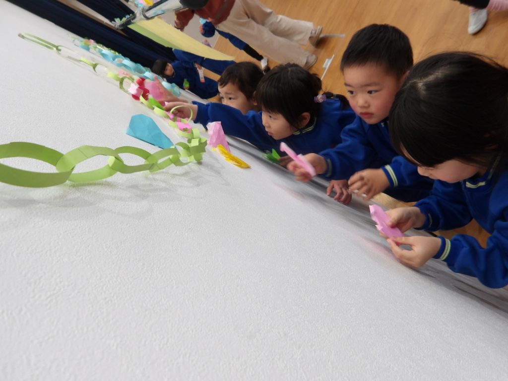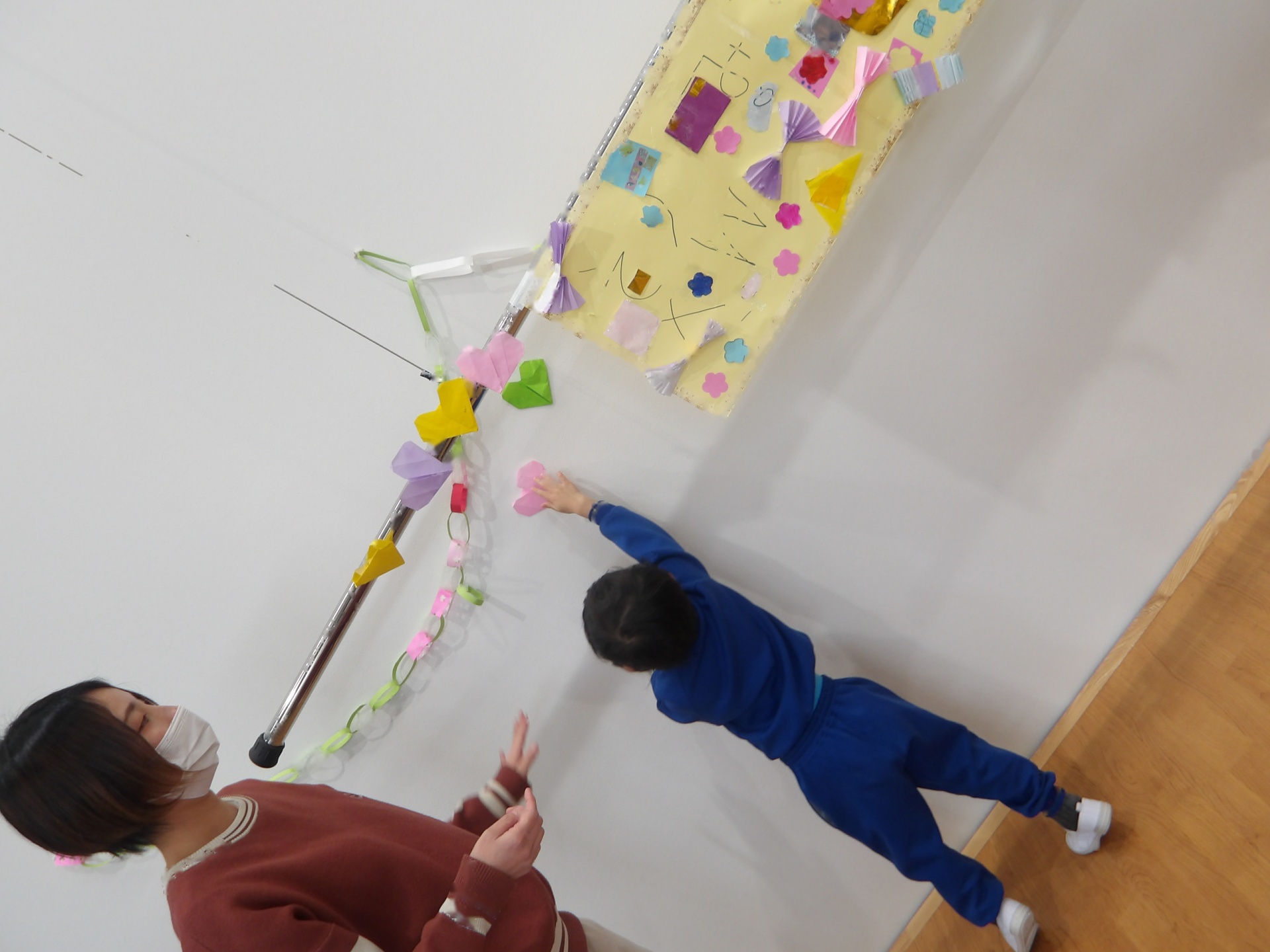 3月10日のおわかれ会に向け、年長さんを驚かせようと秘密で会場の飾りつけをしました。他にも「ありがとうの花」の歌のプレゼントを練習したり、プレゼント作りなどをしました。