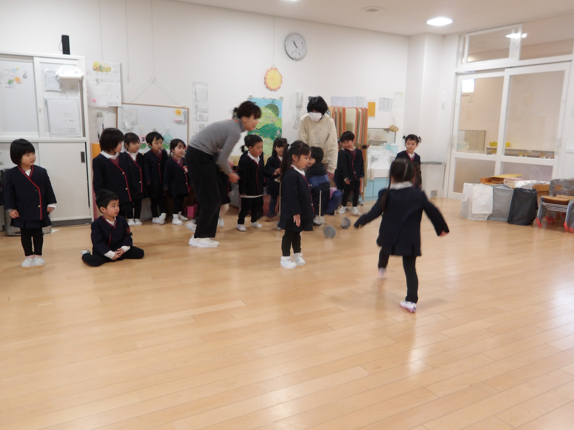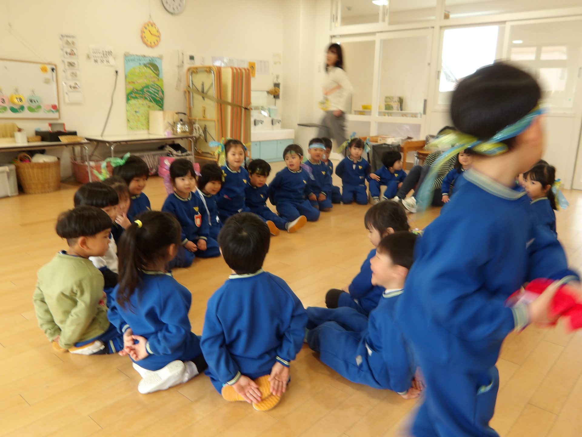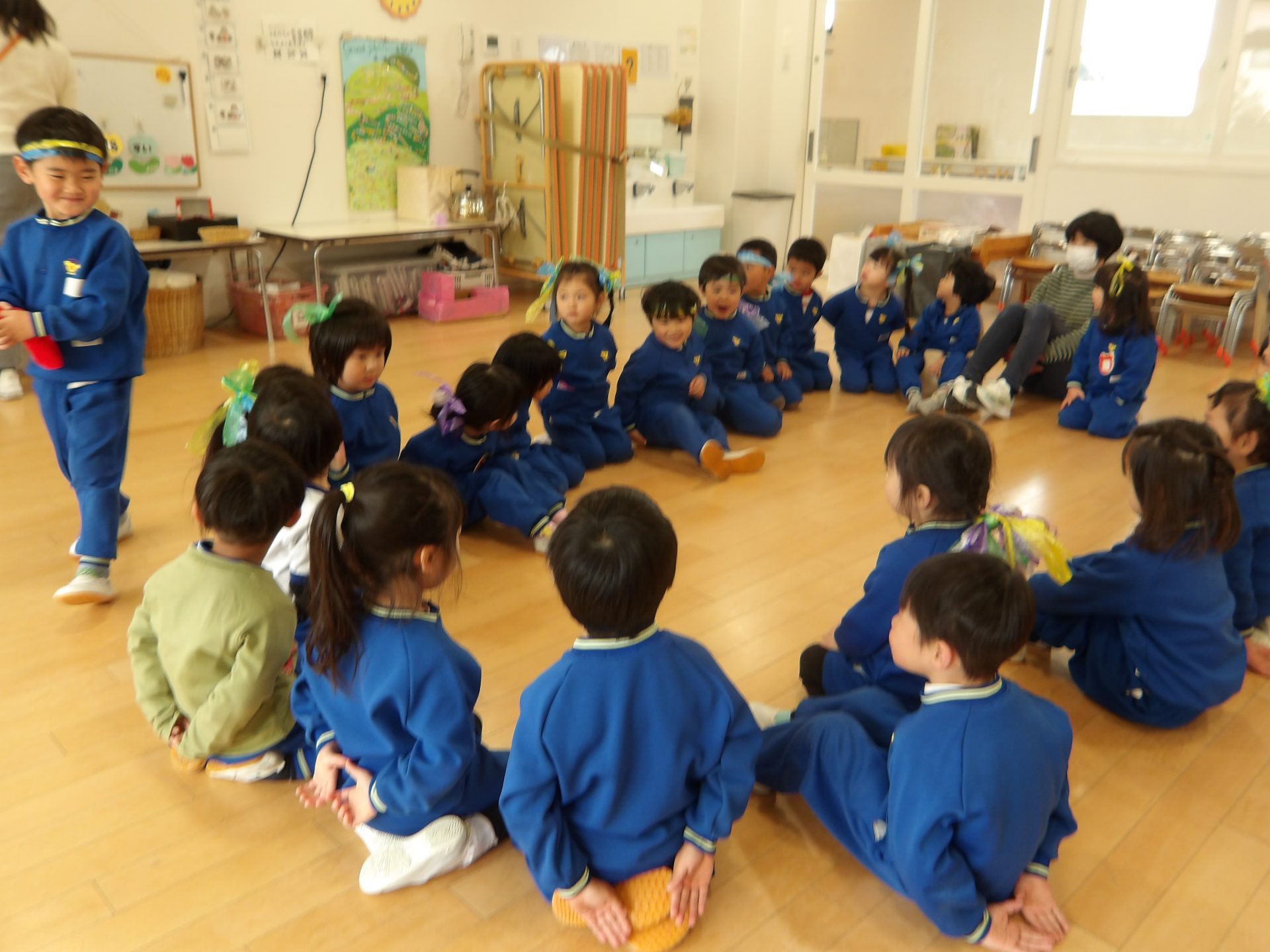 ゲーム大会では、2日間かけてハンカチ落としとだるまさんが転んだを楽しみました。ルールを守って遊ぶのも、すっかり上手になりました。
