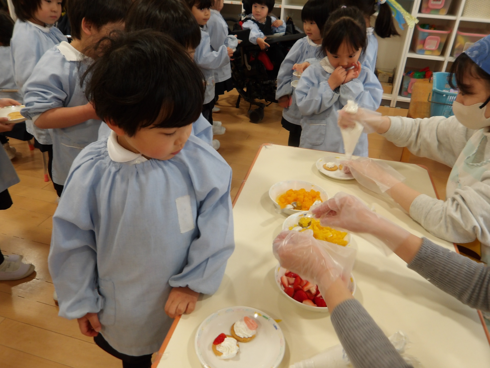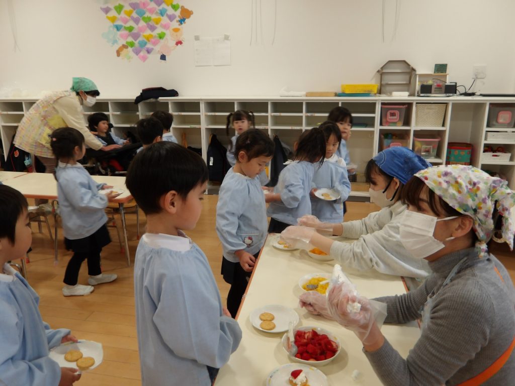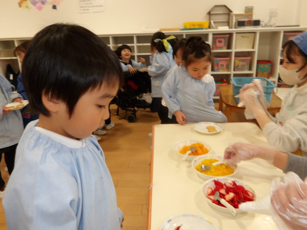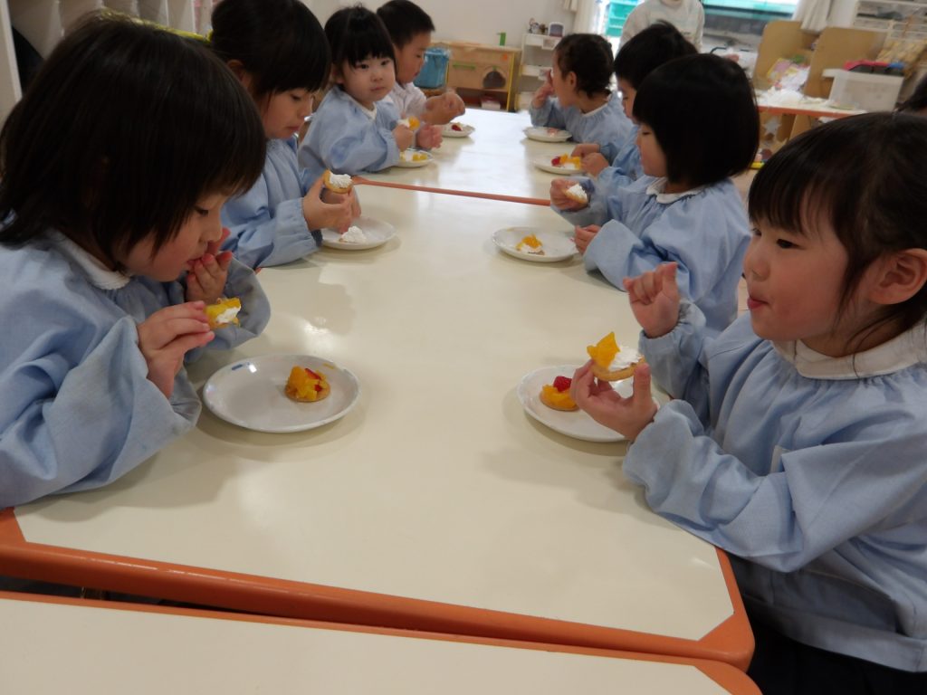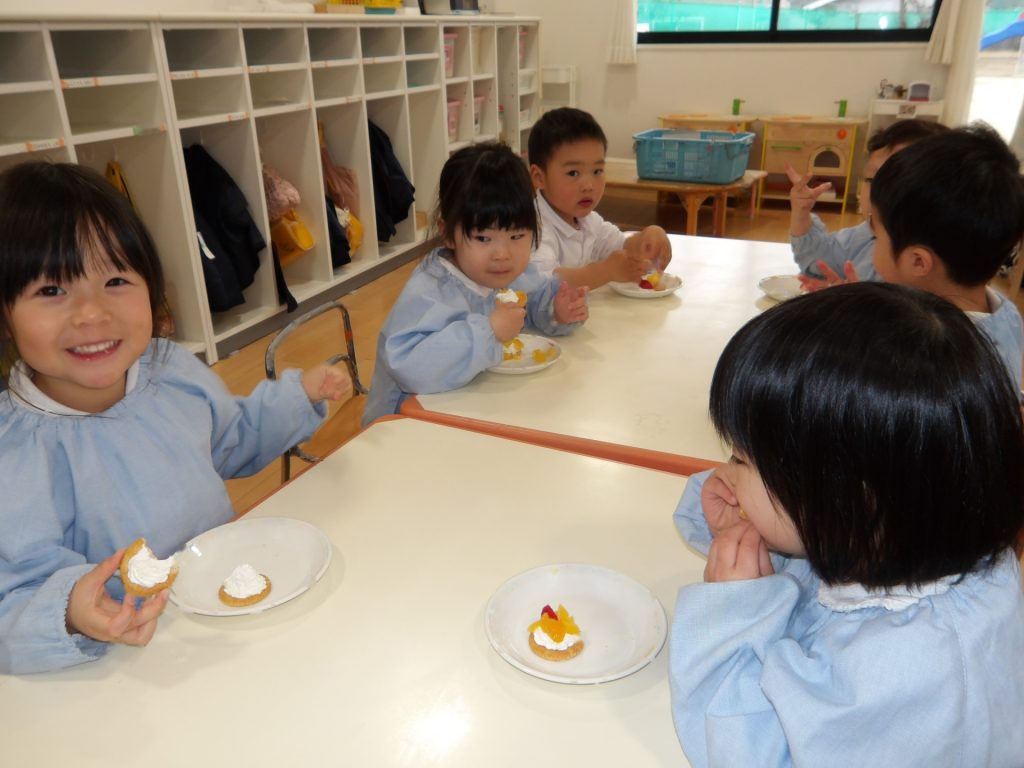ビスケットにクリームやフルーツを乗せて、特別なおやつにして楽しみました。お店屋さんスタイルで、希望のオーダーを伺いました。好きな物だけ乗せるので、みんな頭を悩ませていました。