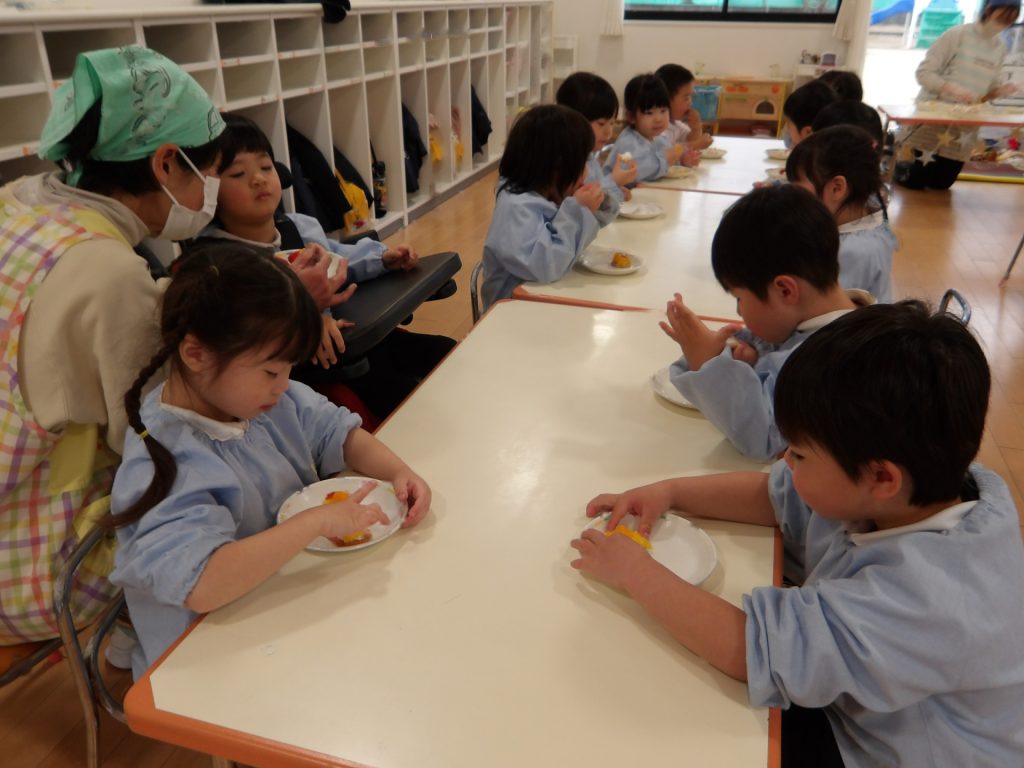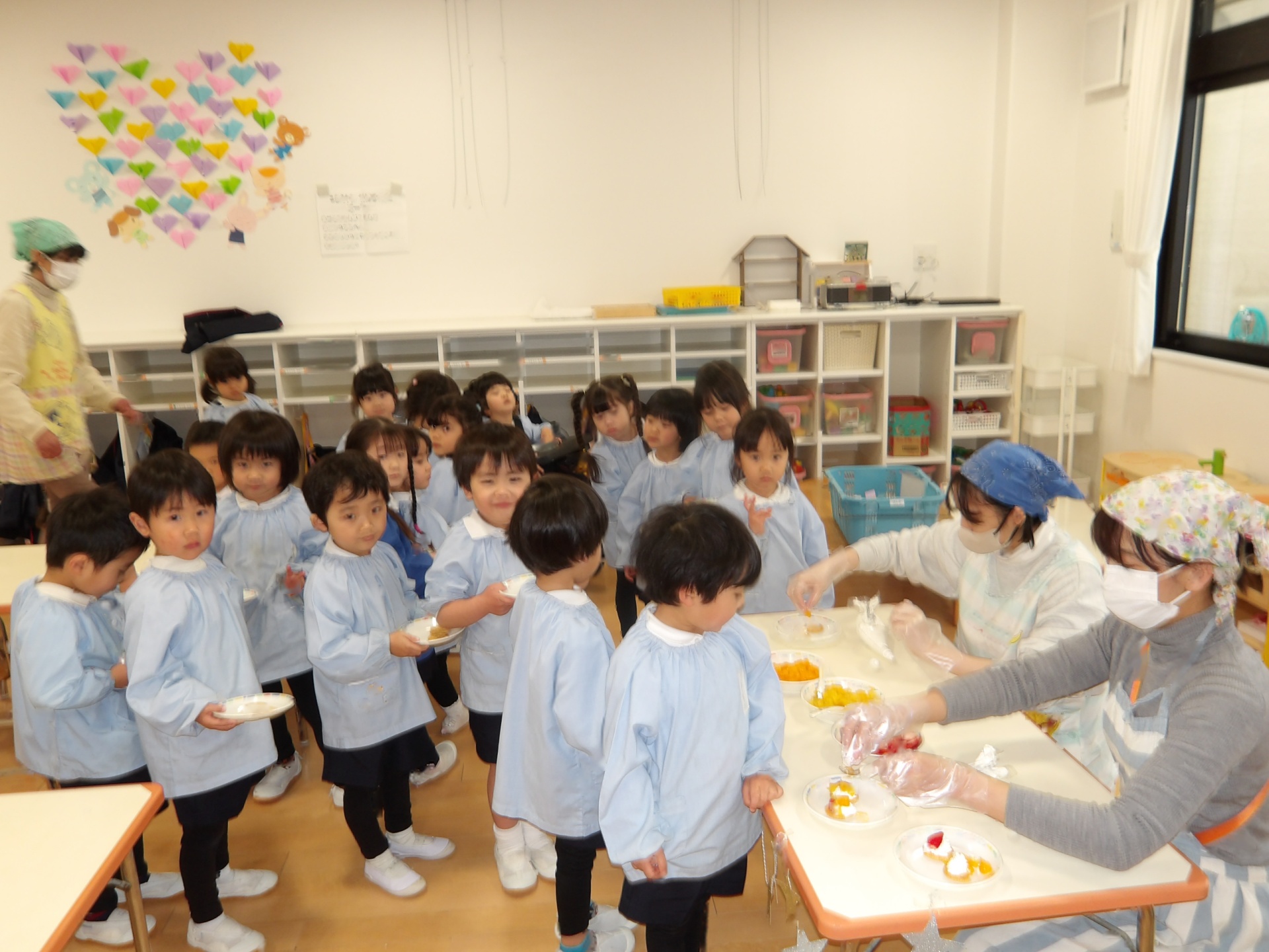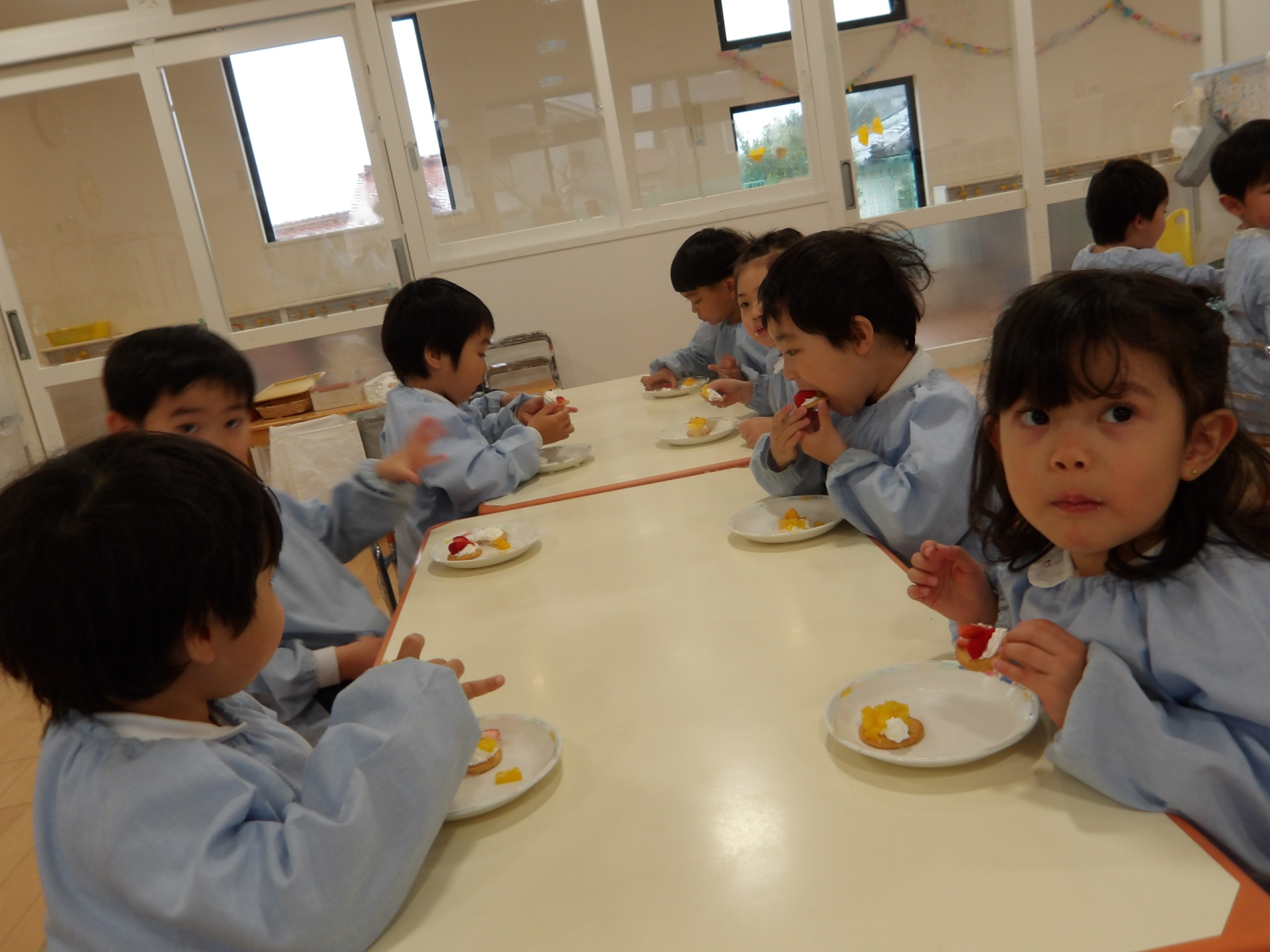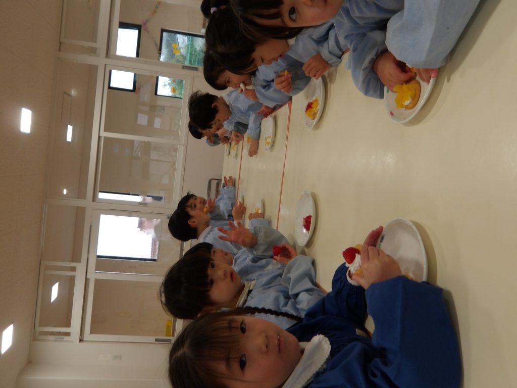 ビスケットにクリームやフルーツを乗せて、特別なおやつにして楽しみました。お店屋さんスタイルで、希望のオーダーを伺いました。好きな物だけ乗せるので、みんな頭を悩ませていました。