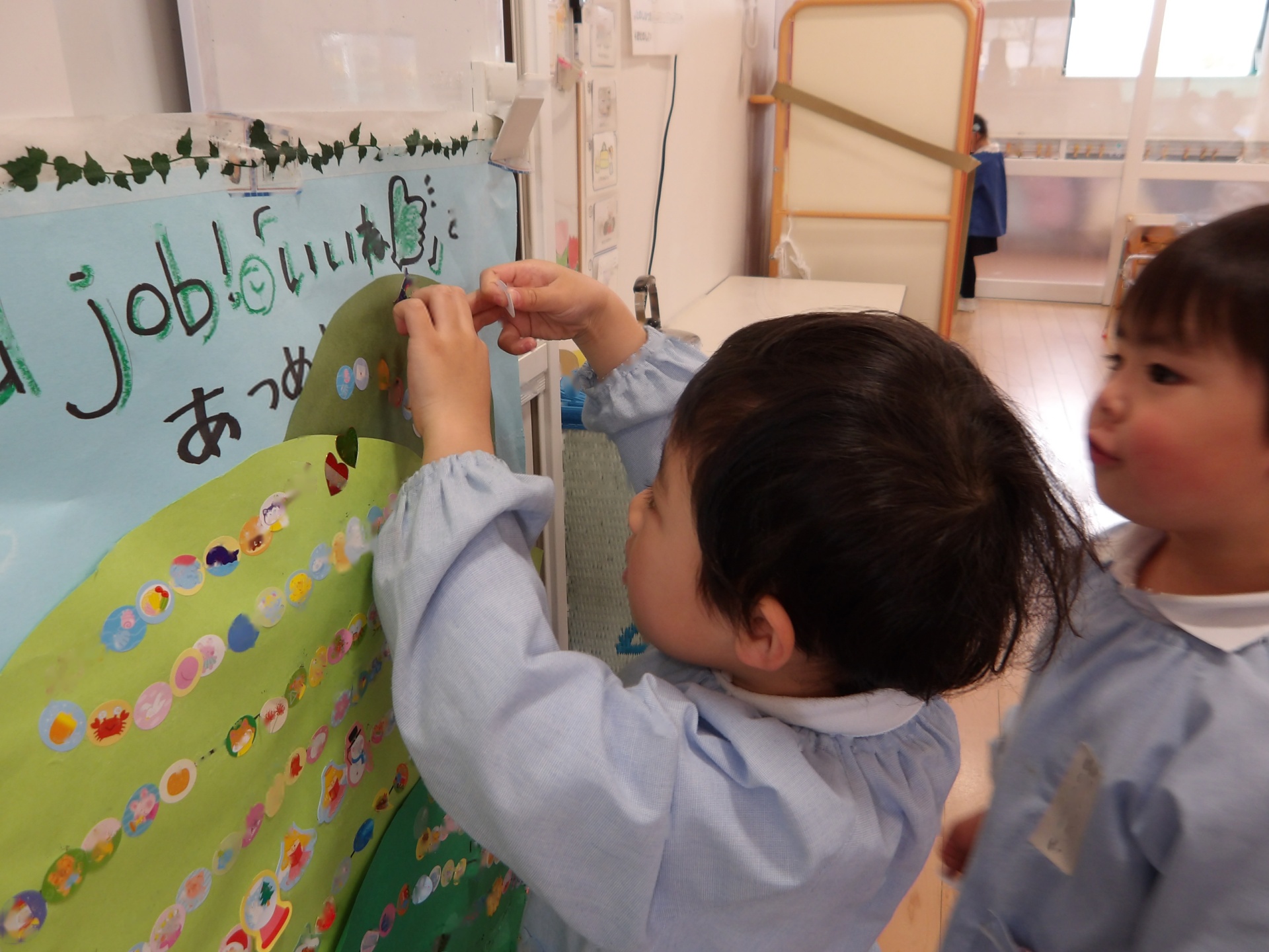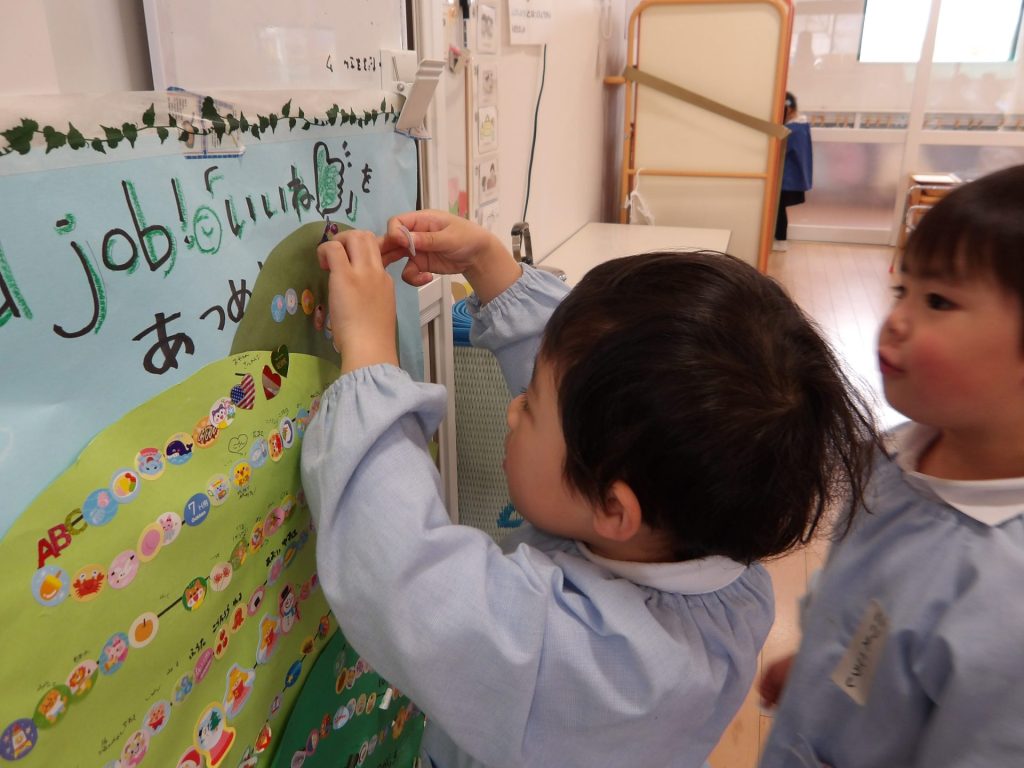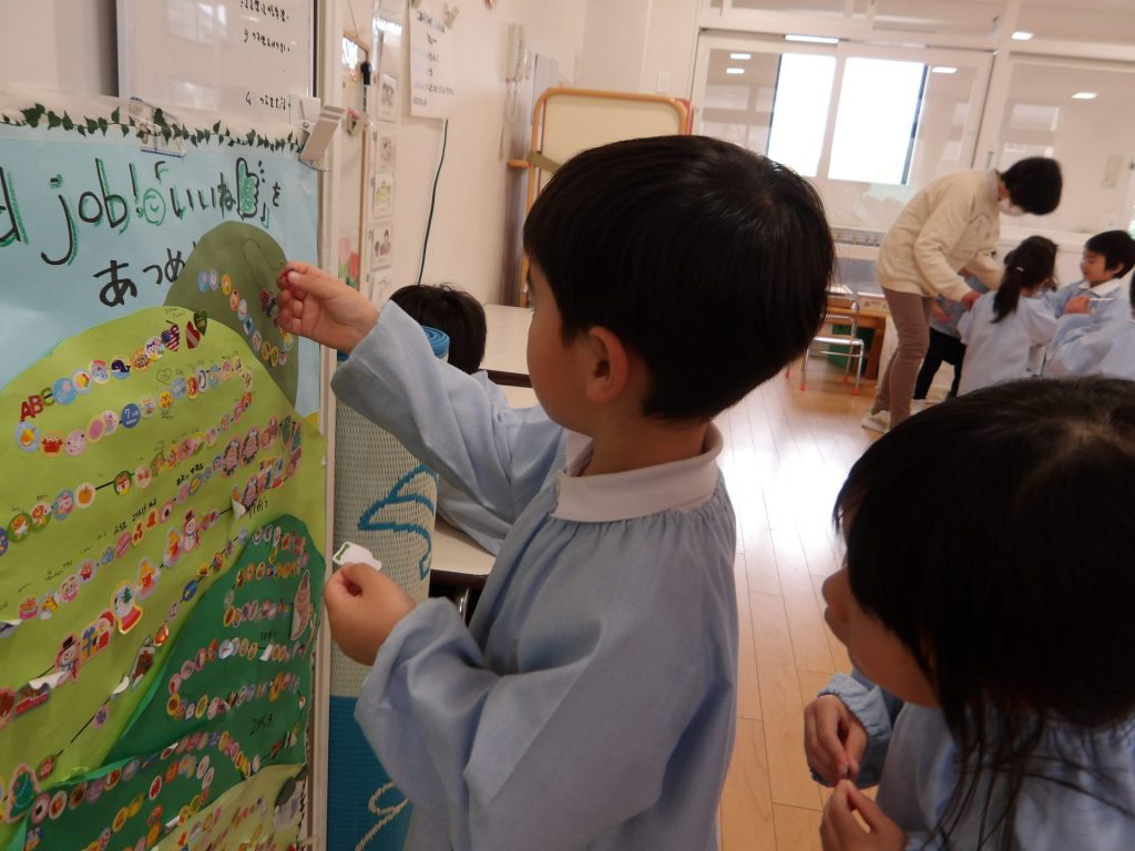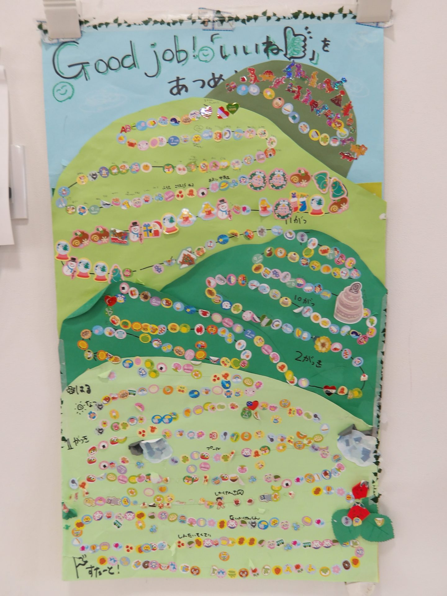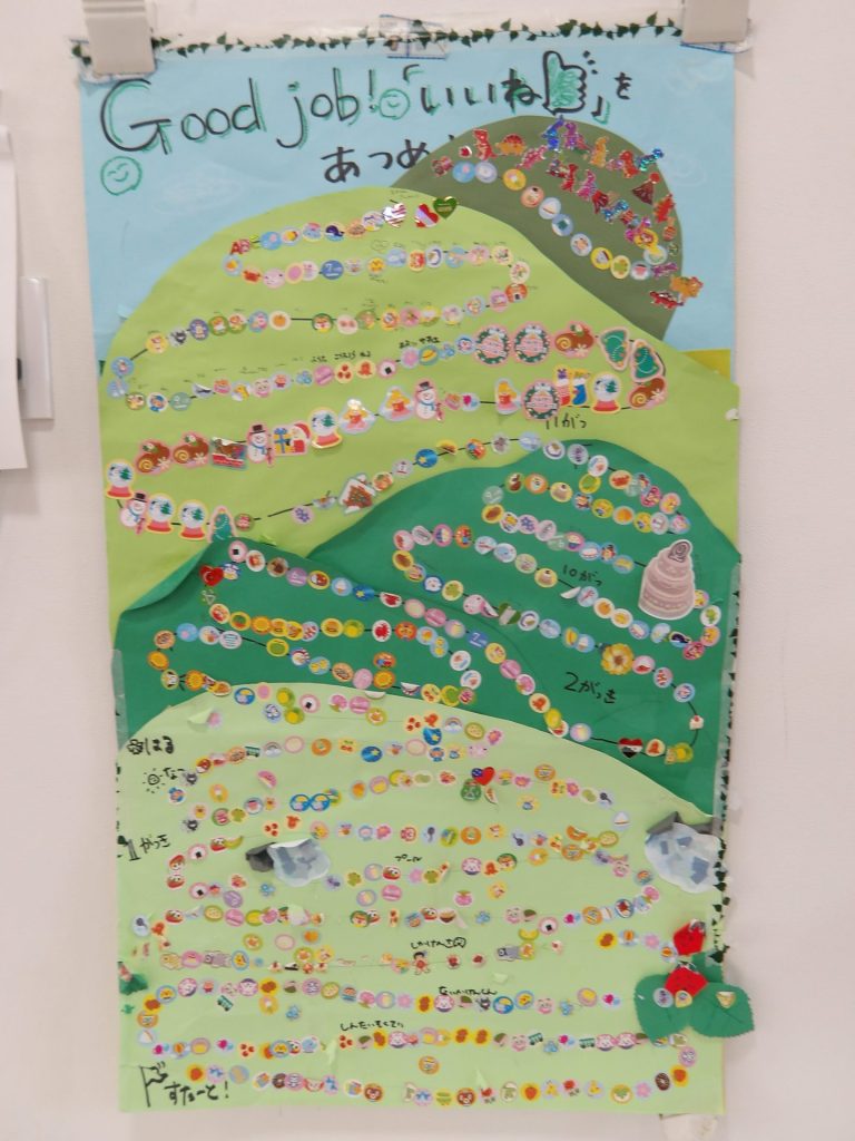 見つけたシールを貼ると…1年間集めた「いいね!」が山頂に到達しました。みんながすてきだった瞬間、頑張った瞬間が目に見える形でこんなに集まり、子ども達も嬉しそうです。