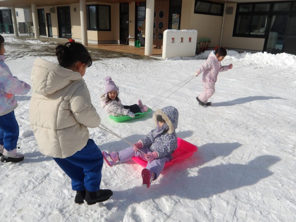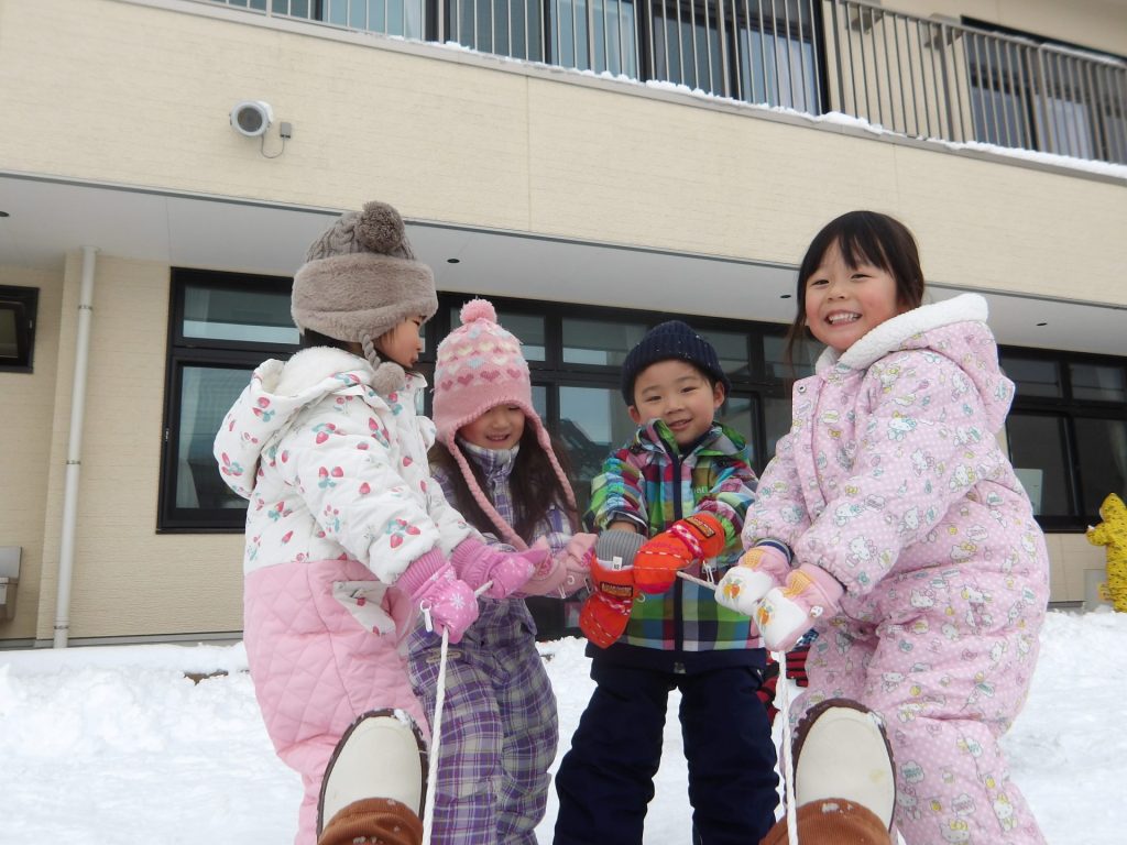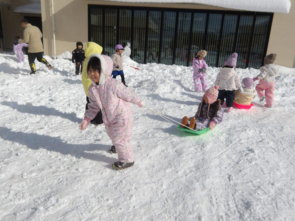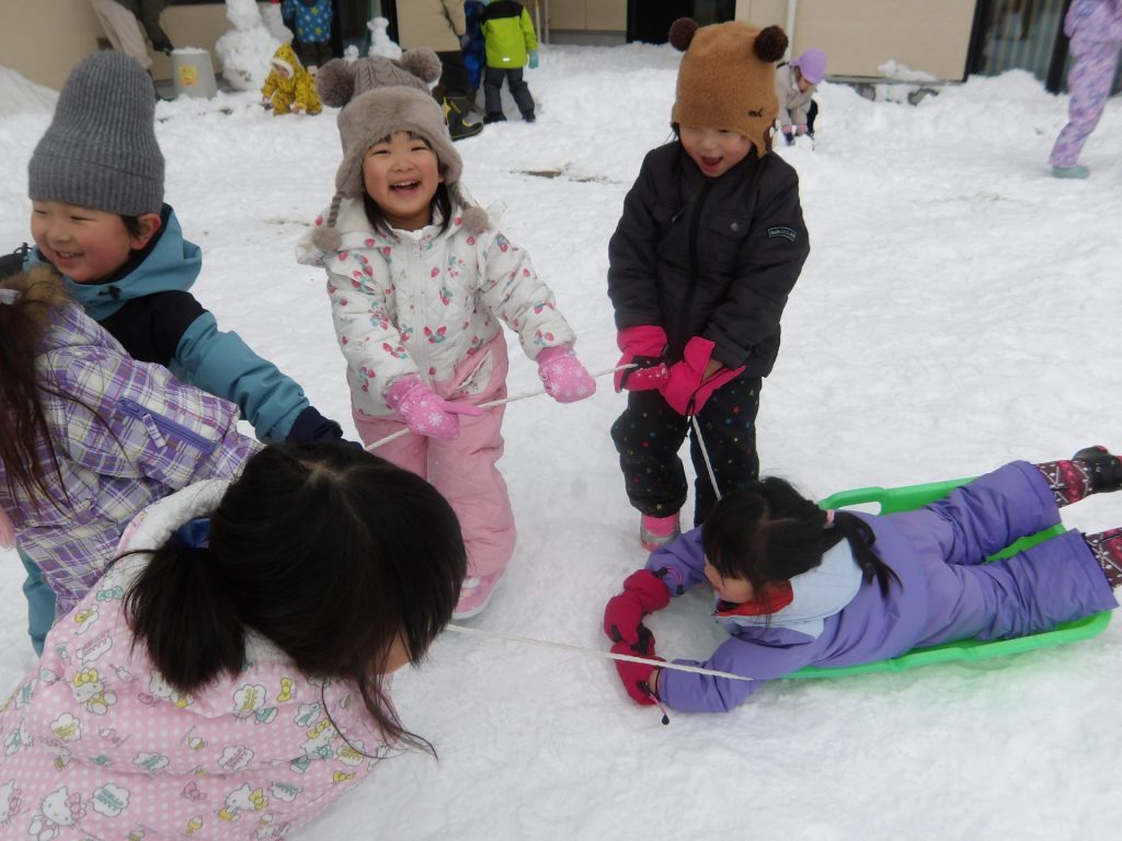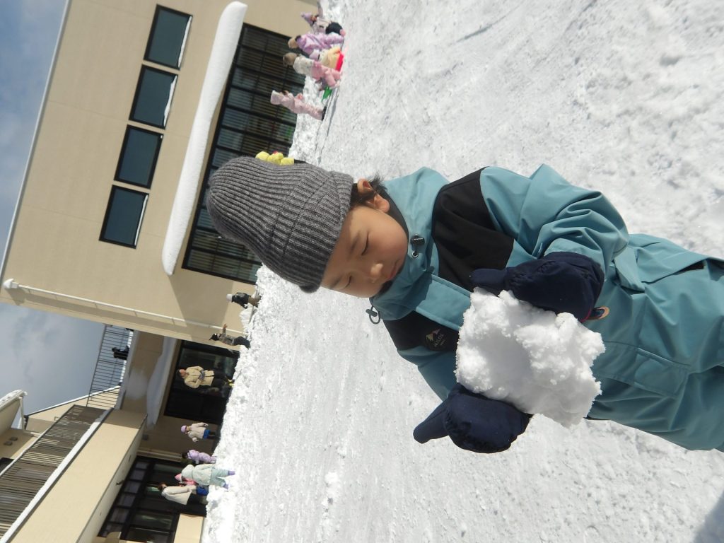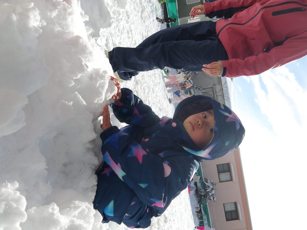 今月はお正月遊びや鬼ごっこ、工作、楽器作りなどいろいろ楽しんでいますが、なんといっても冬の醍醐味は雪遊び!