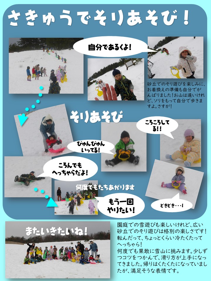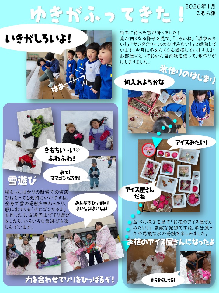 雪や氷で遊んだ様子をまとめましたので、ご覧ください。保育室前にも掲示しています。