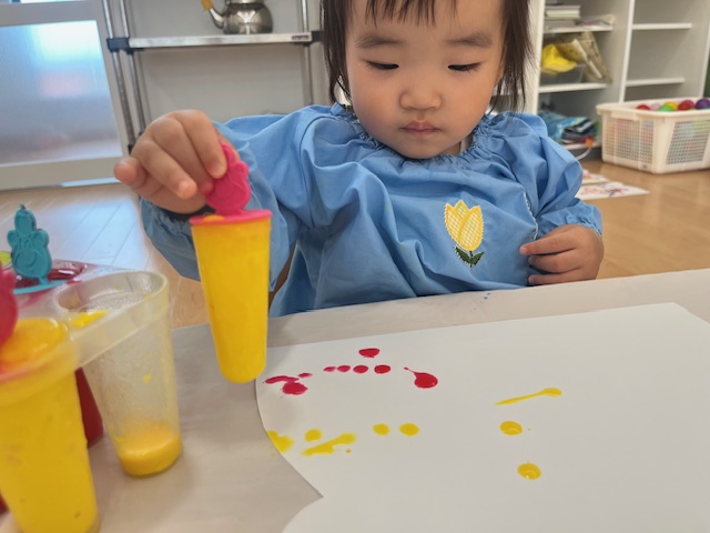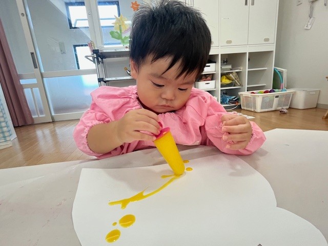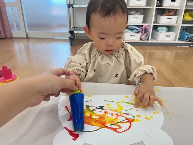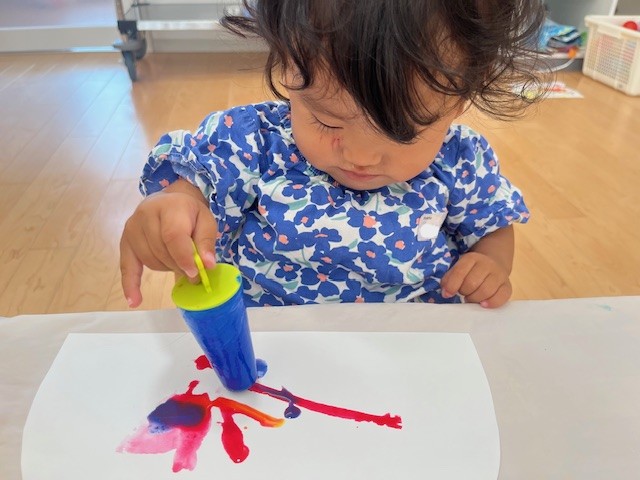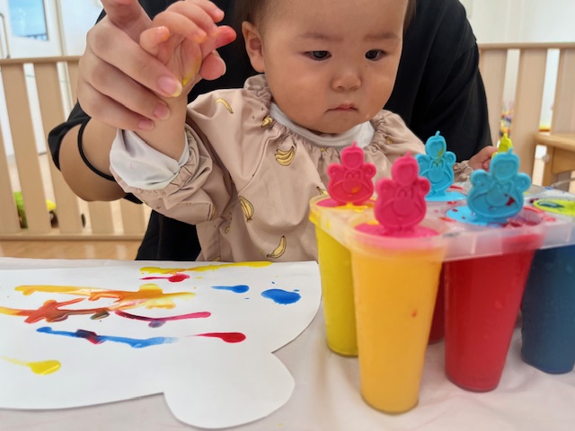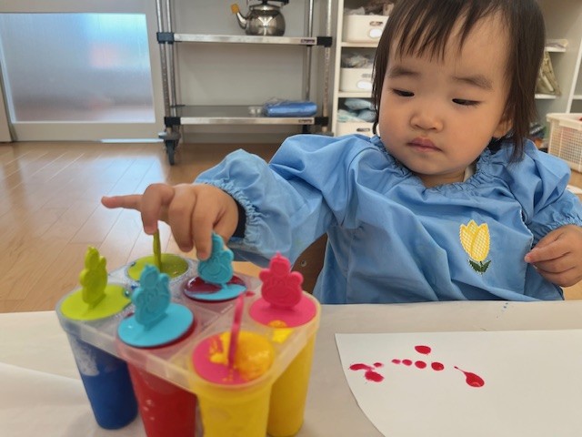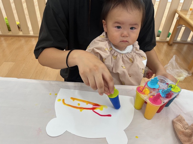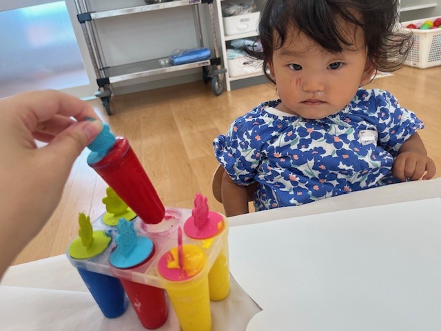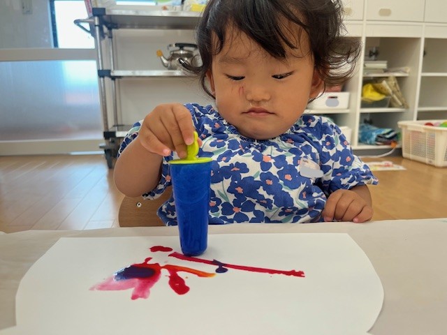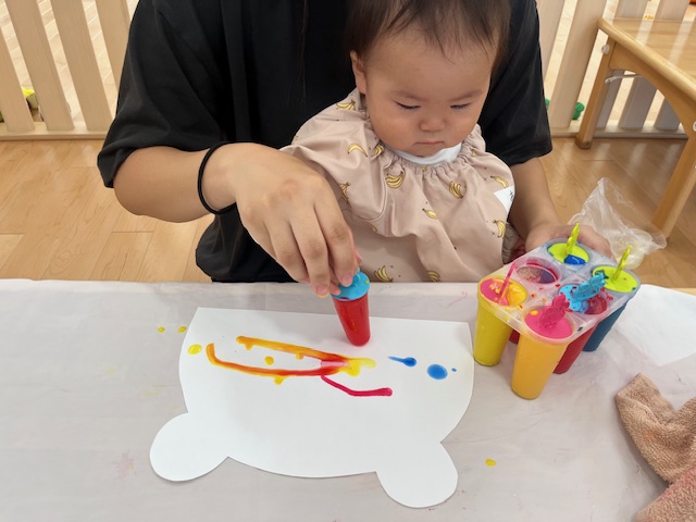 渡すと不思議そうで氷の部分を触って「冷たい!」とびっくり。思ってたのと違って驚いていましたが画用紙に色がつくと笑顔で描かれていましたよ