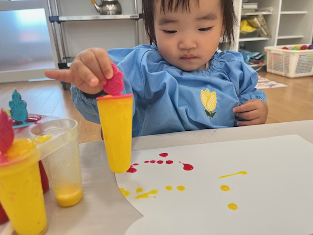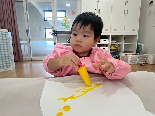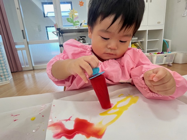 手に絵の具をぬりぬり・・・なんだこれは。という表情の子どもたち。
