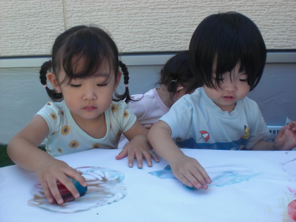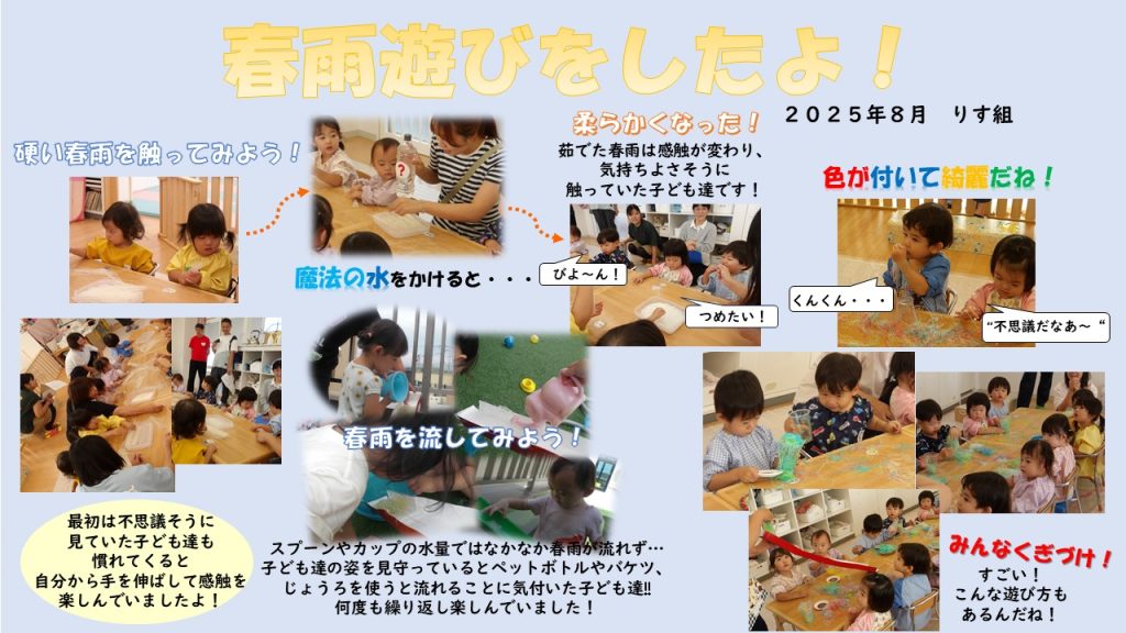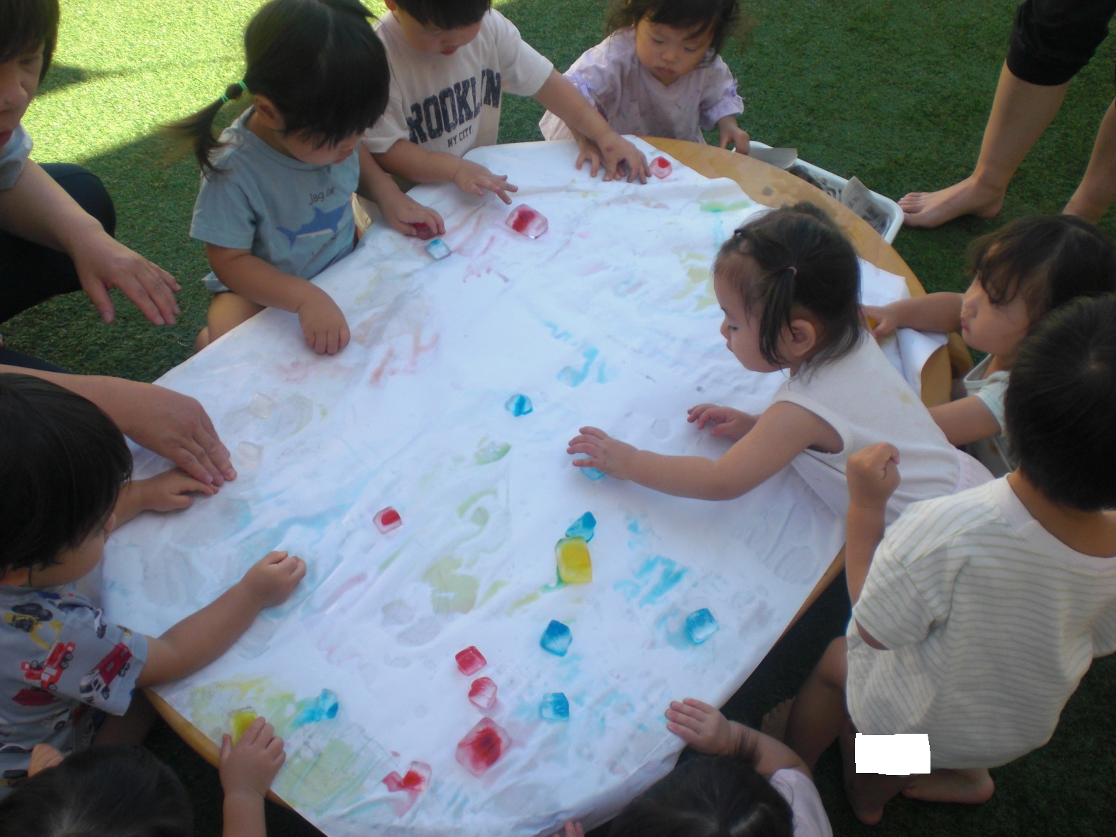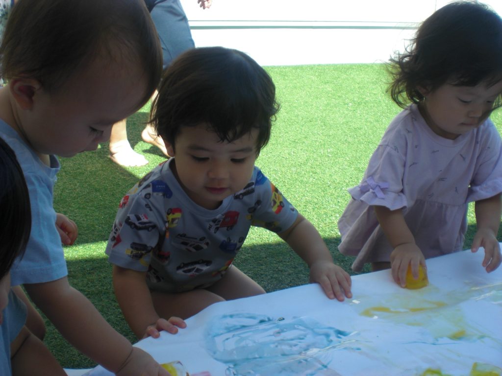 「ちゅめたいね!」と感触を楽しんだり、「きいろ!」と色に喜んでいる姿も見られました。