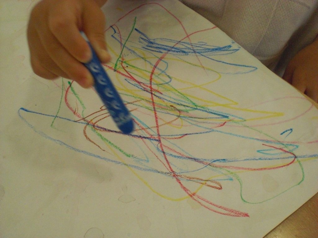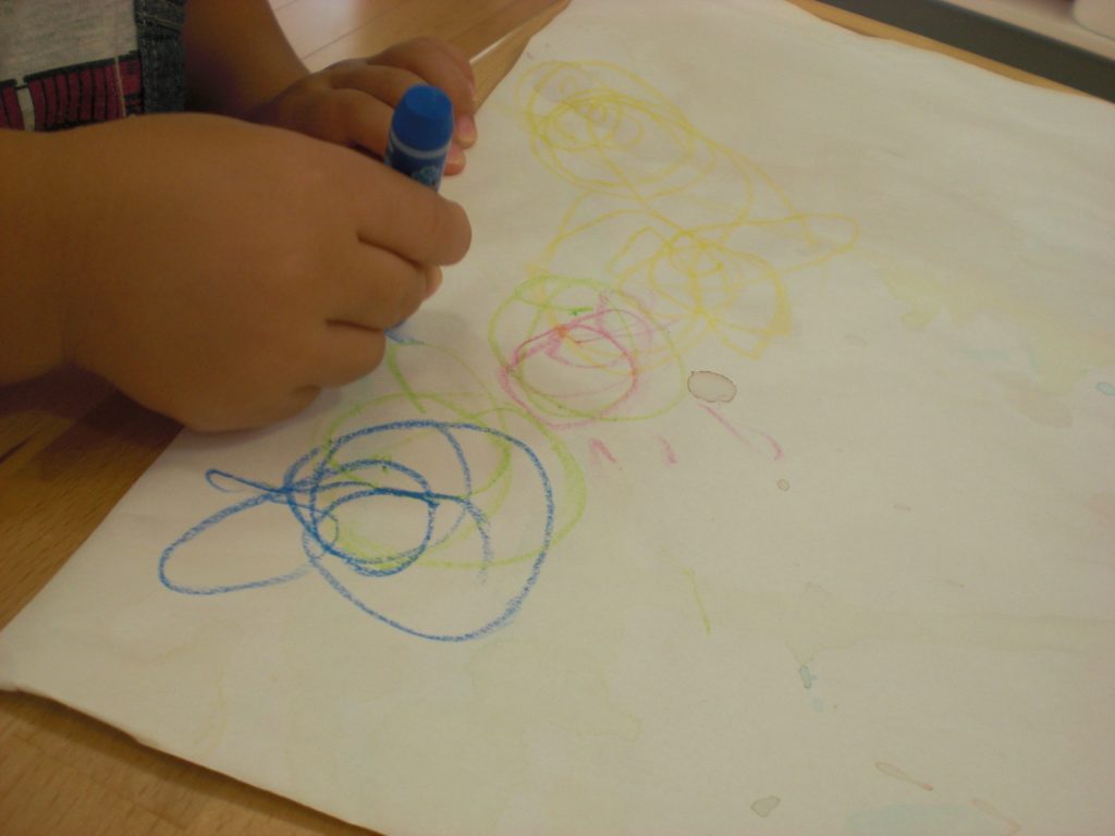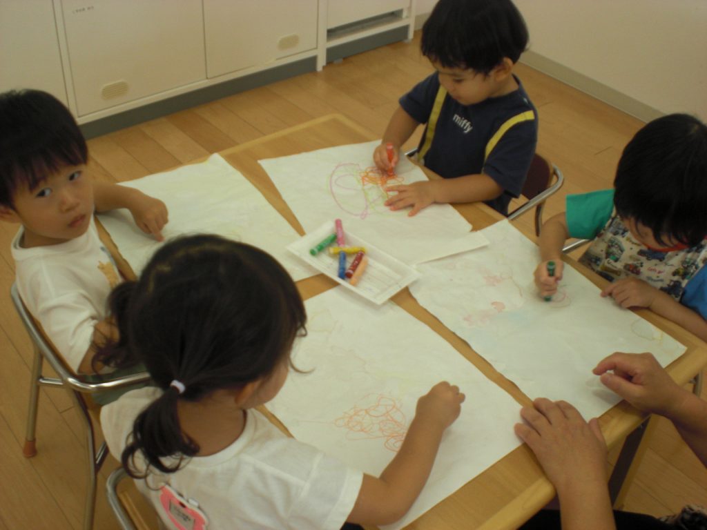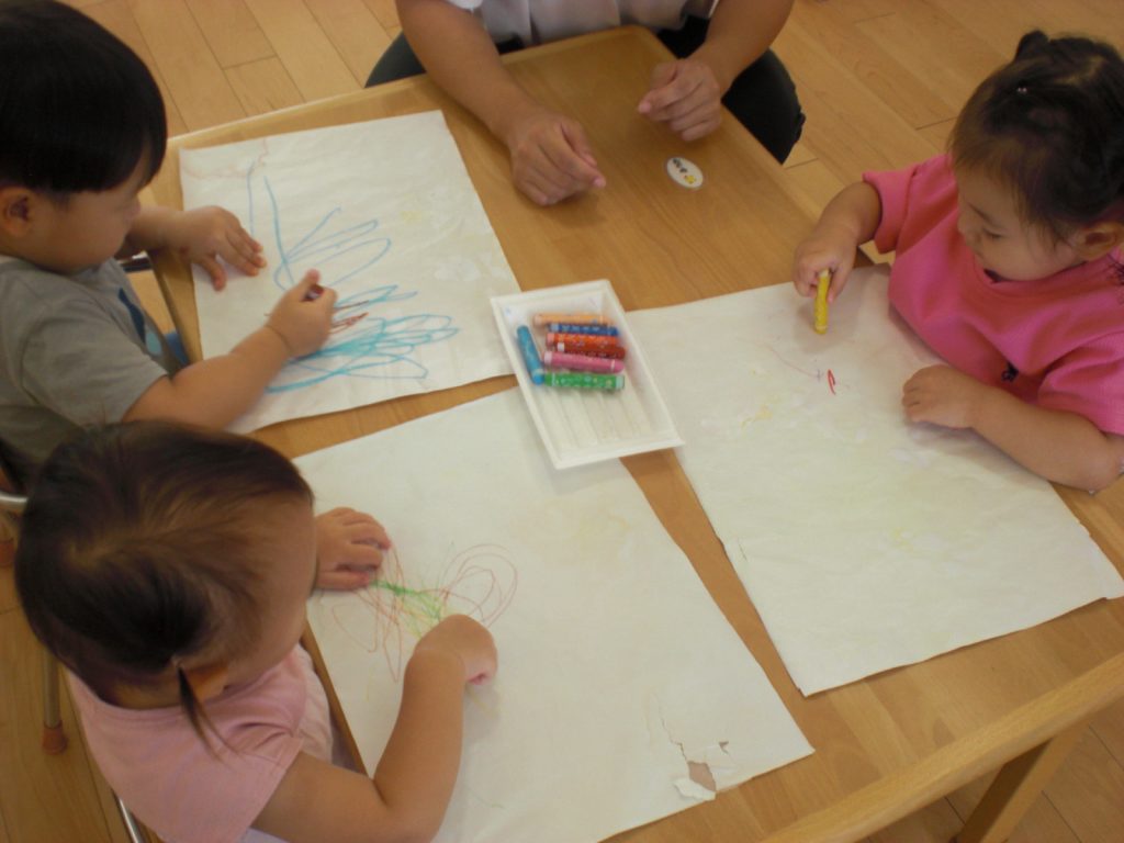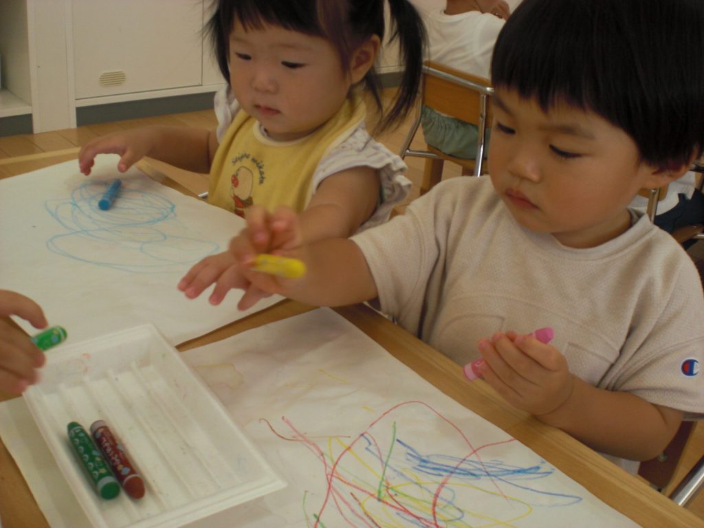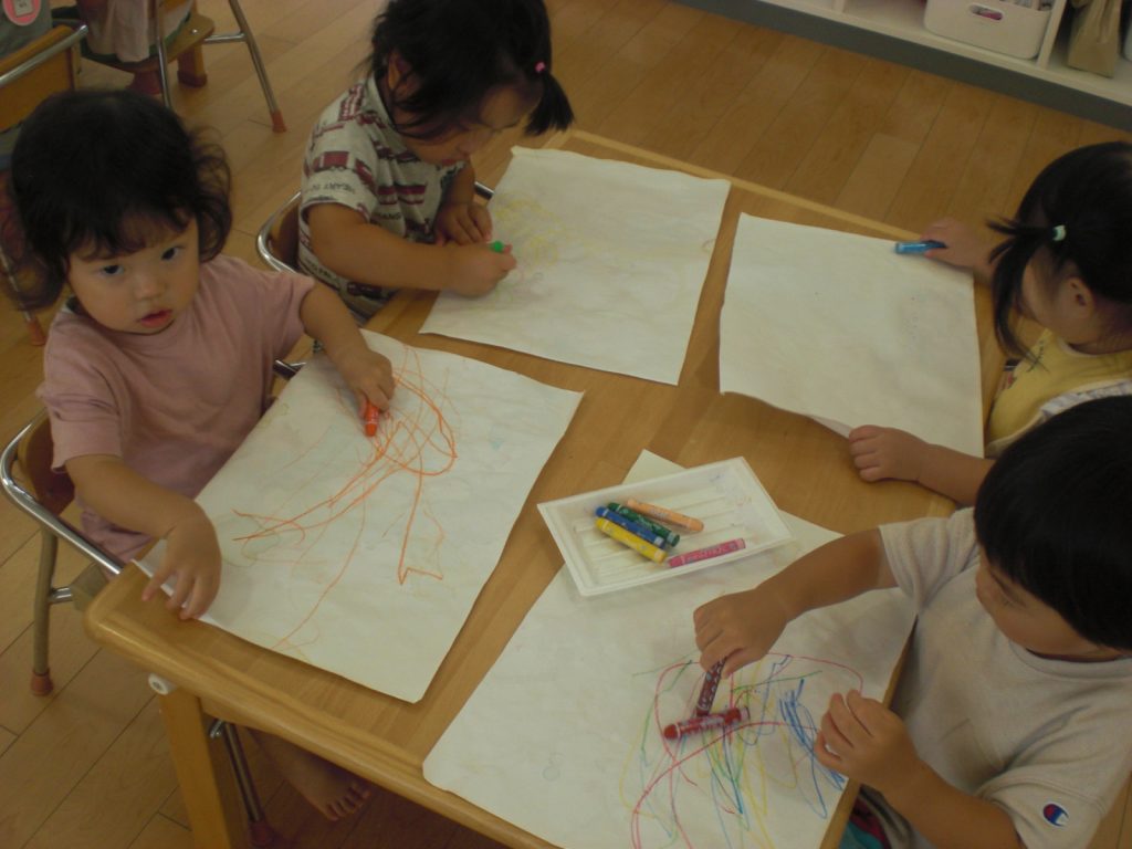 伸び伸びと好きな色のクレヨンを選んで描きました。