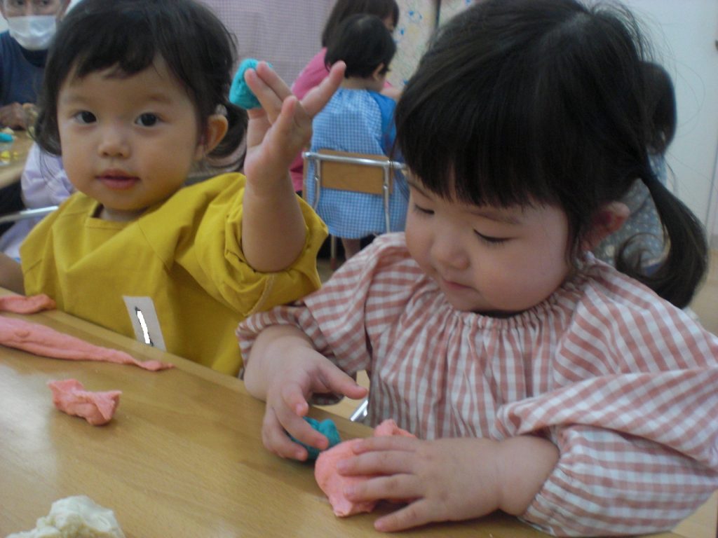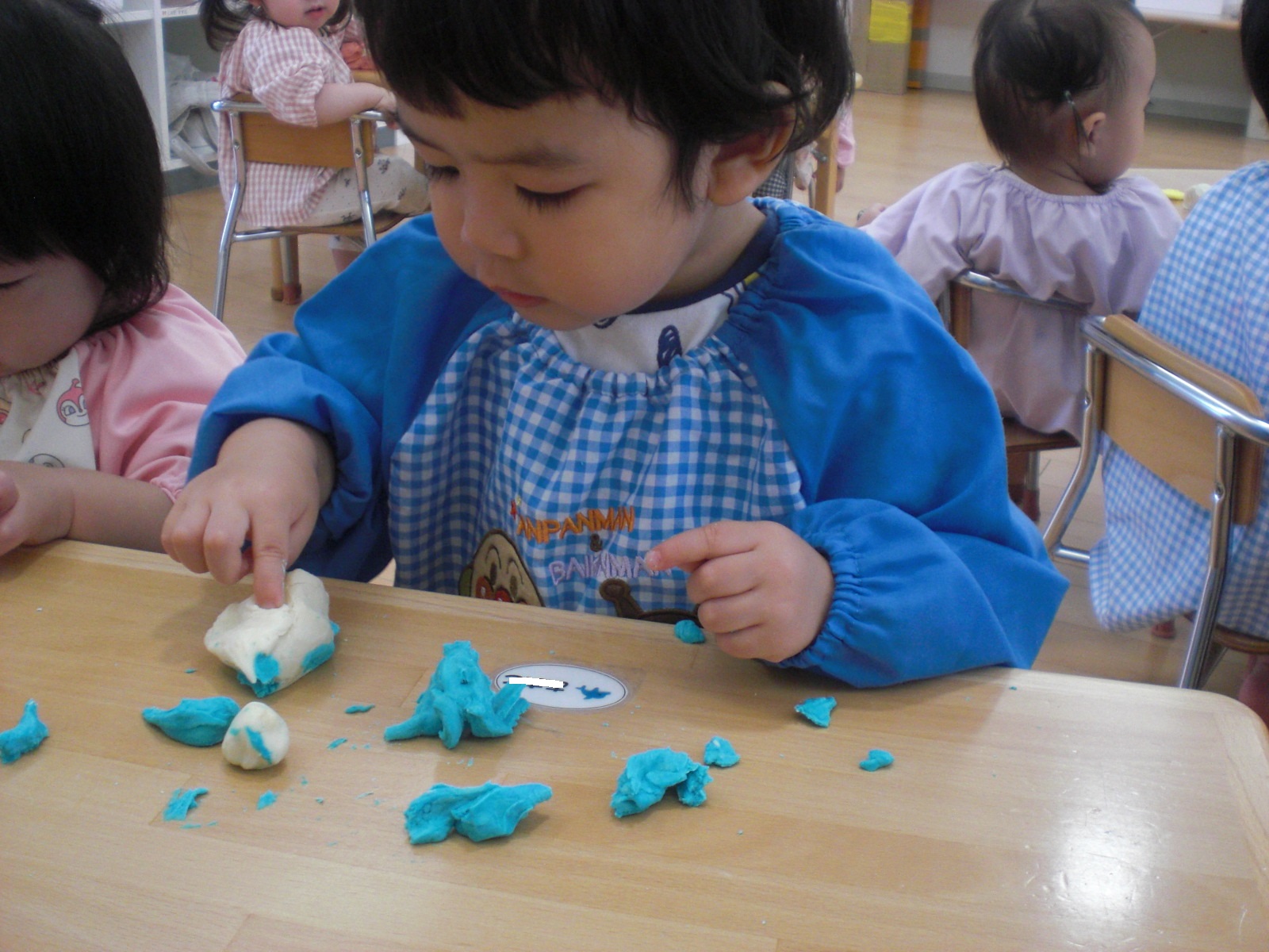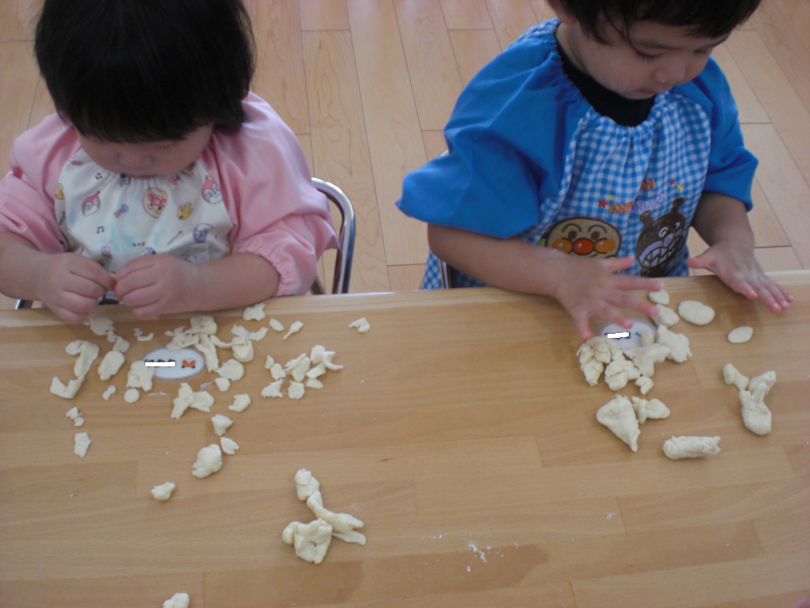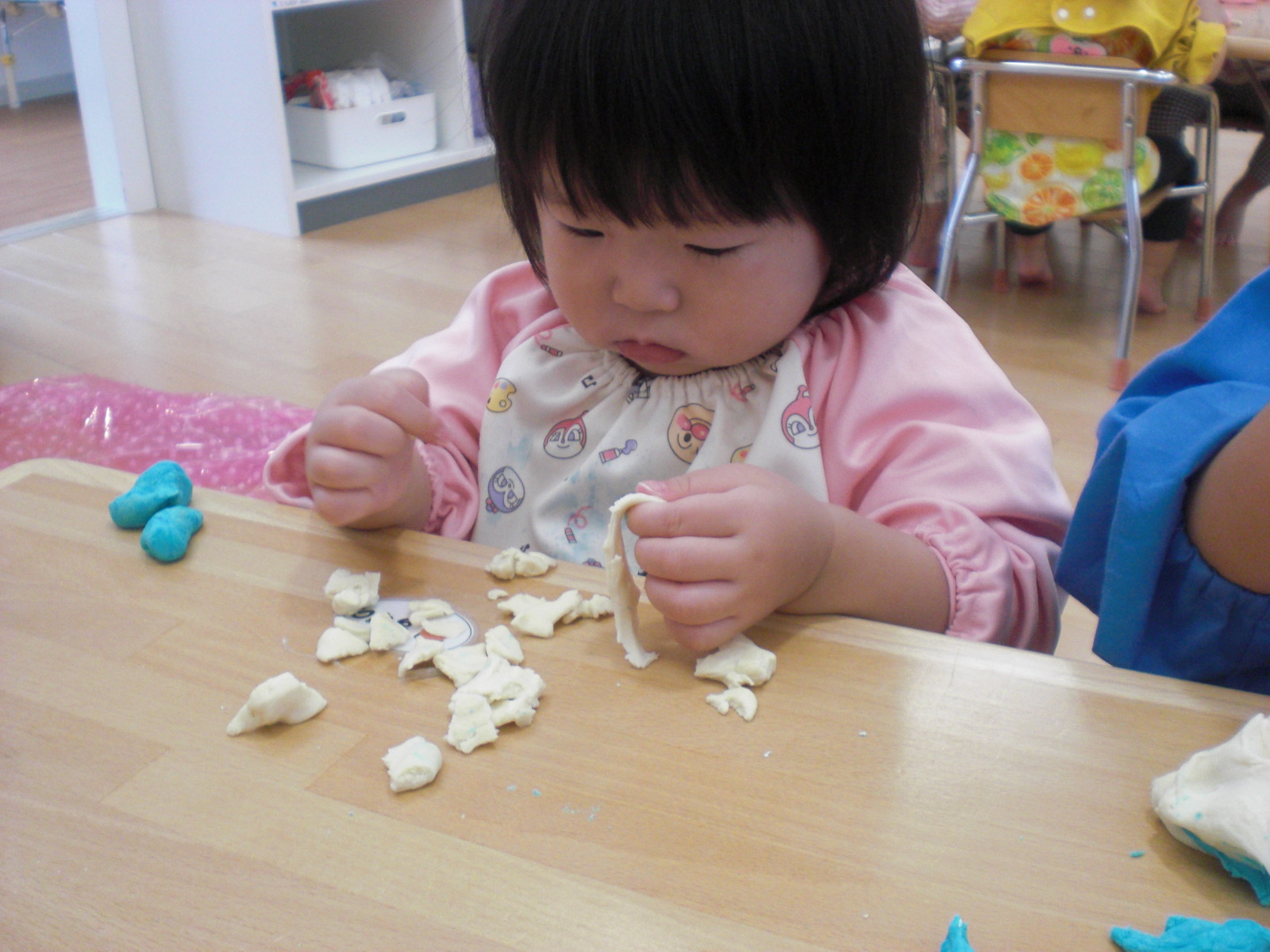 もちもちの感触を指を触って楽しんでいたり、伸ばしたり、ちぎったりして遊んでいましたよ。