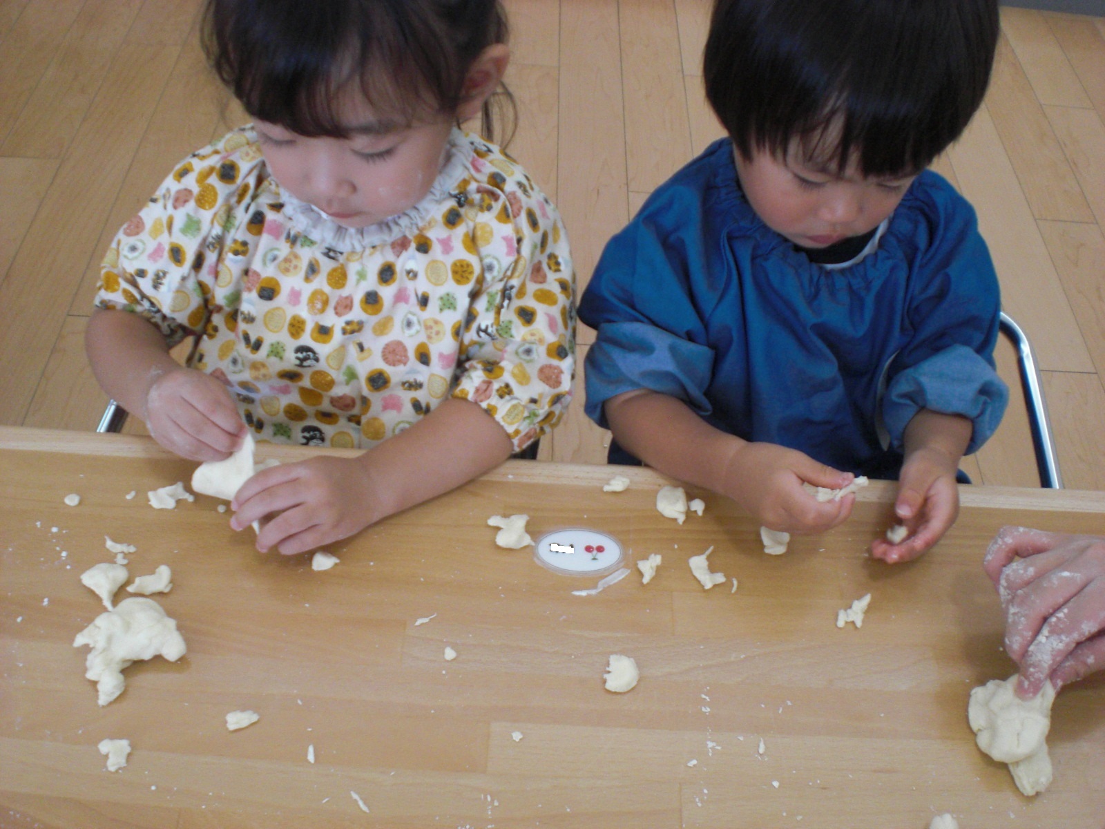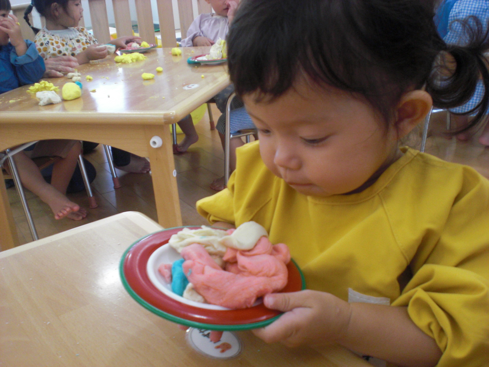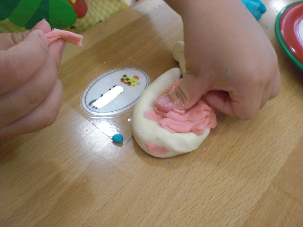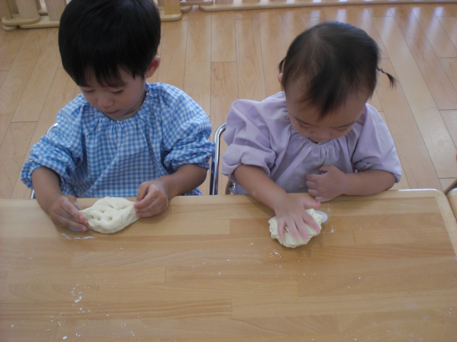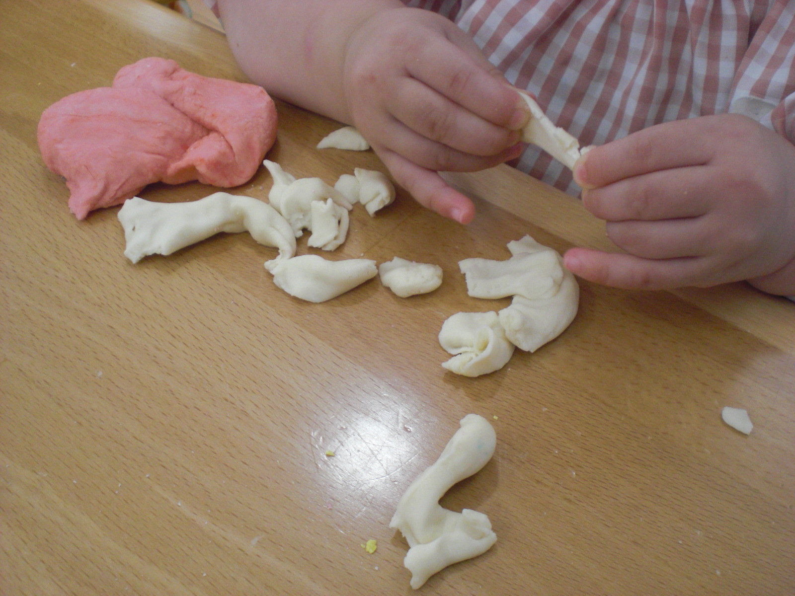 もちもちの感触を指を触って楽しんでいたり、伸ばしたり、ちぎったりして遊んでいましたよ。