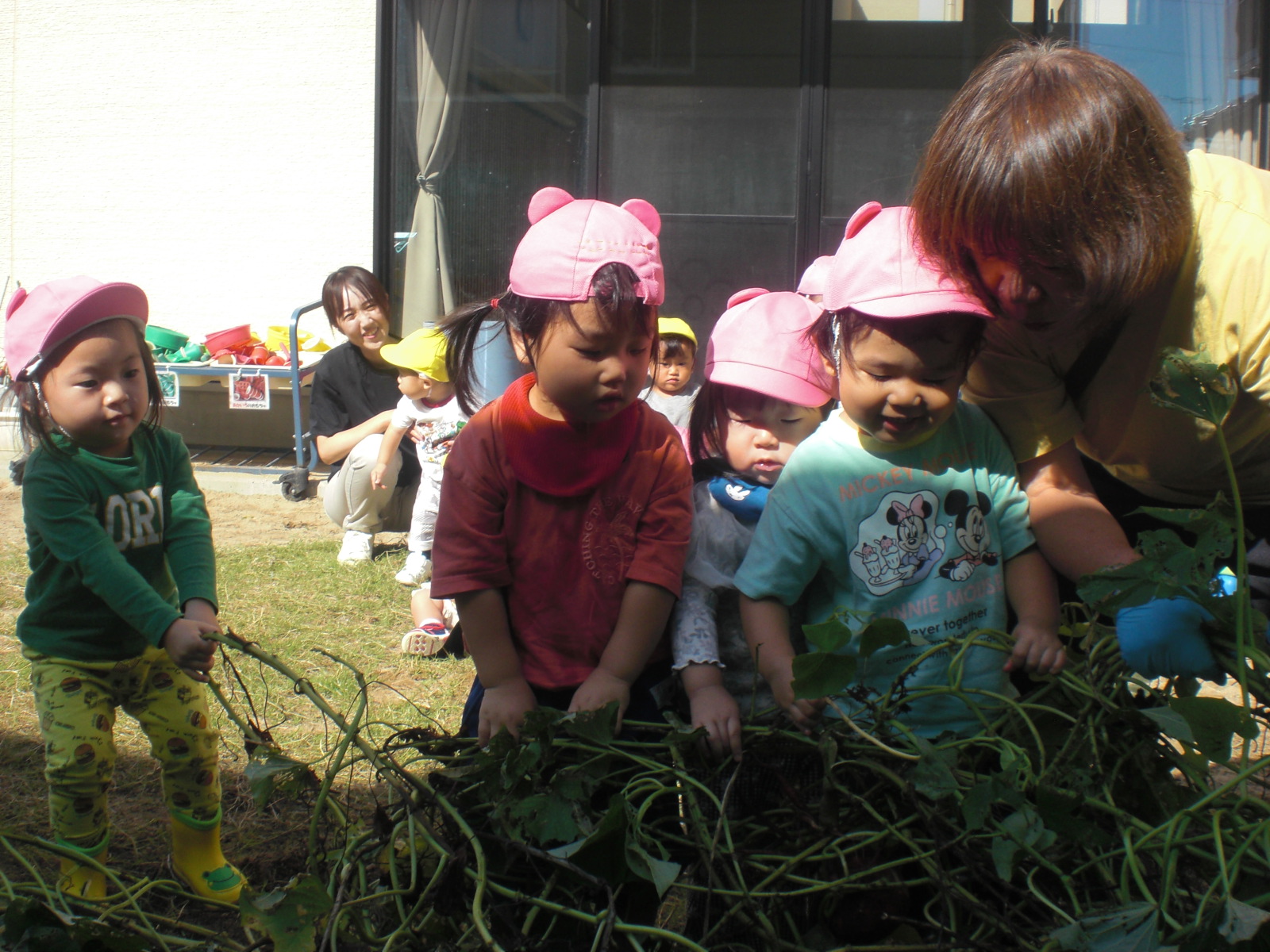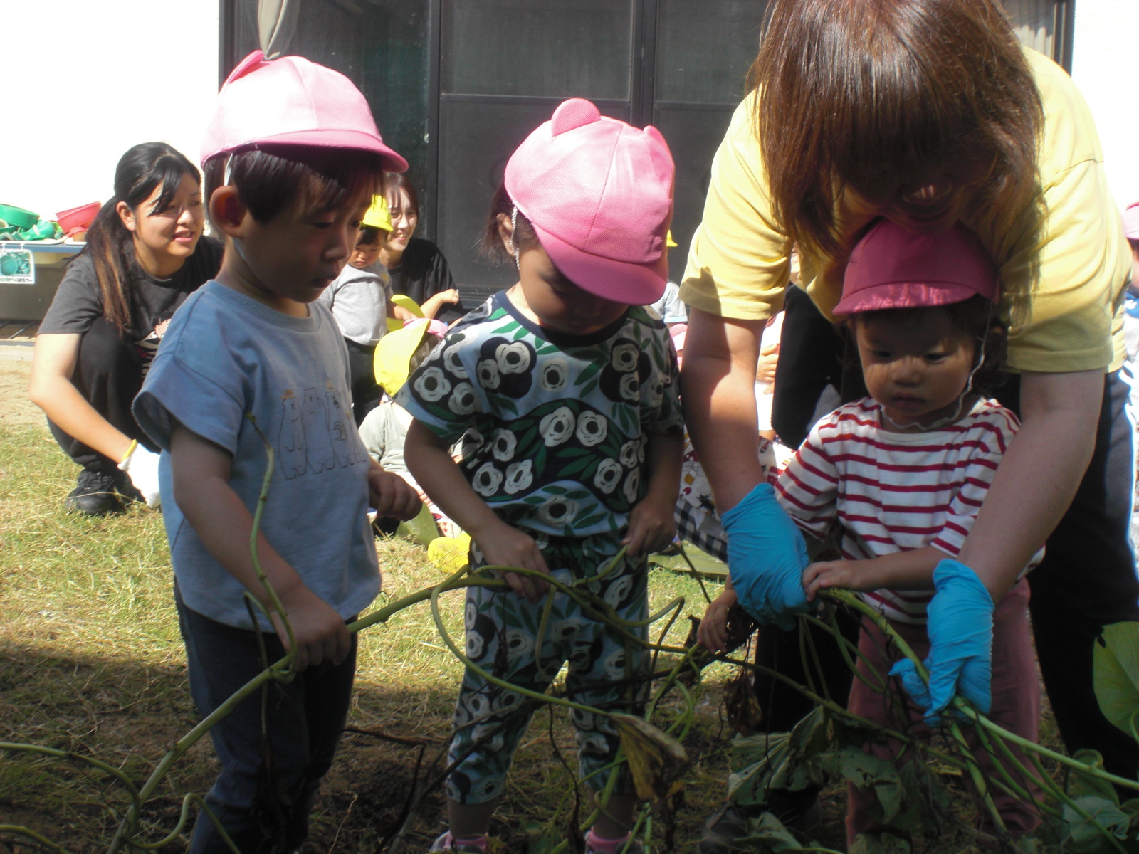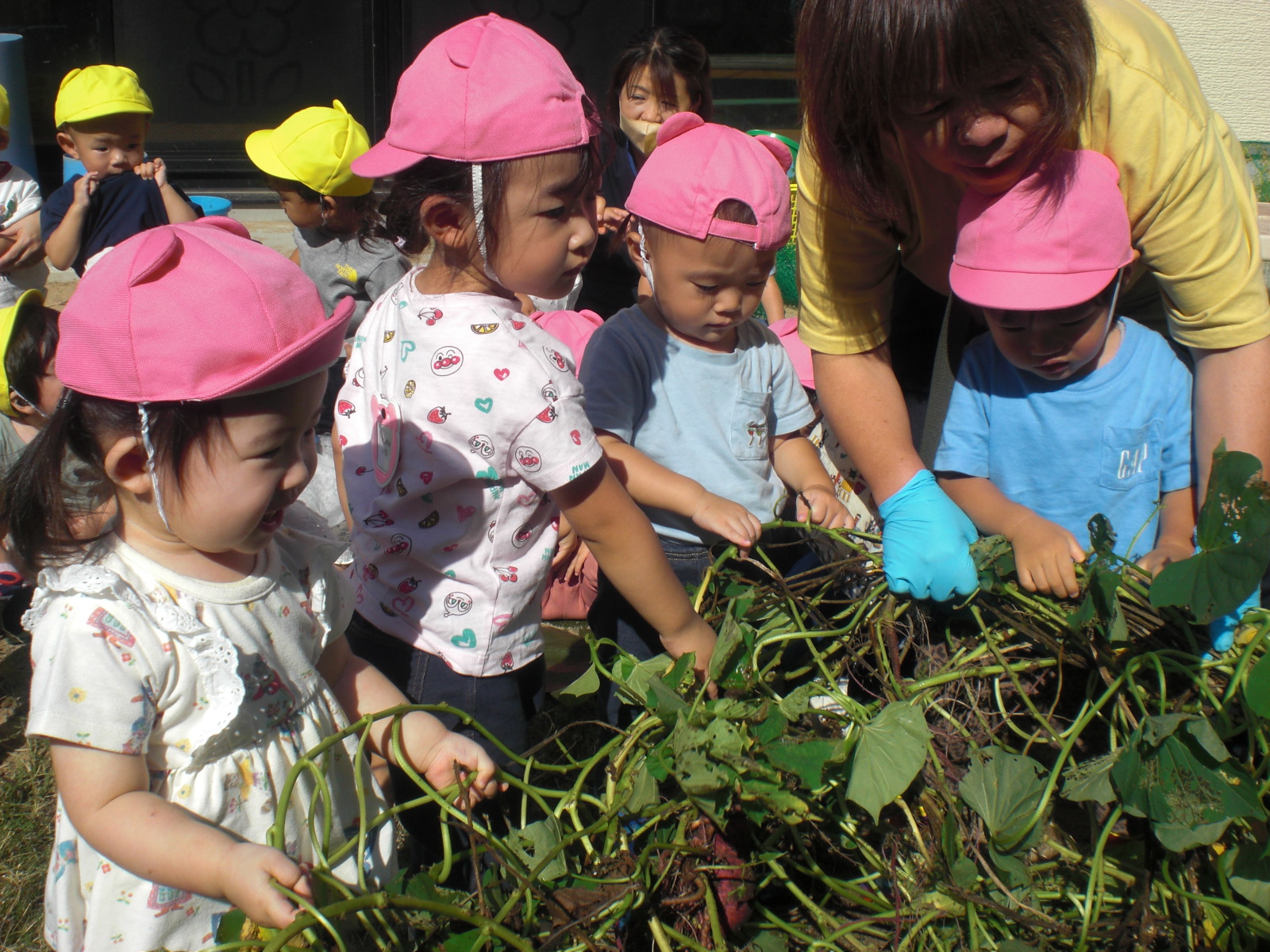 ひよこ組さんと一緒にお芋掘りをしました。5月に植えた芋苗がこんなに大きくなりました!