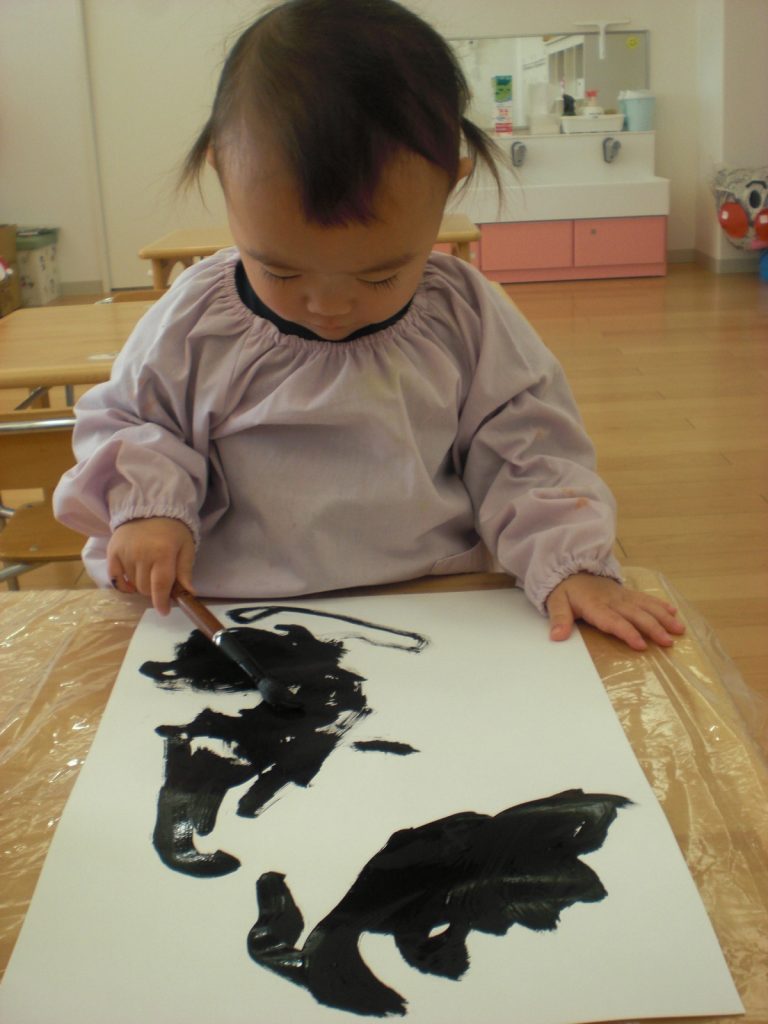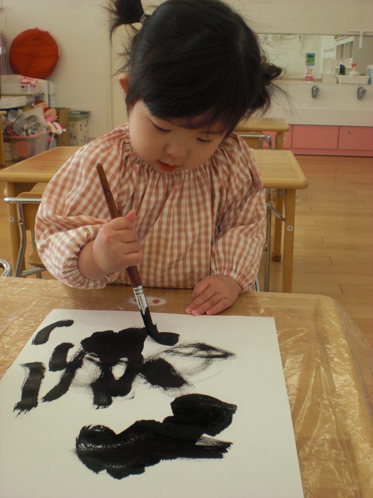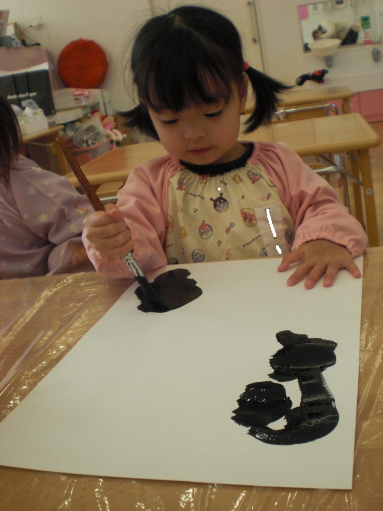 書き初めの様子です!初めての筆に挑戦し、伸び伸びと書きました!