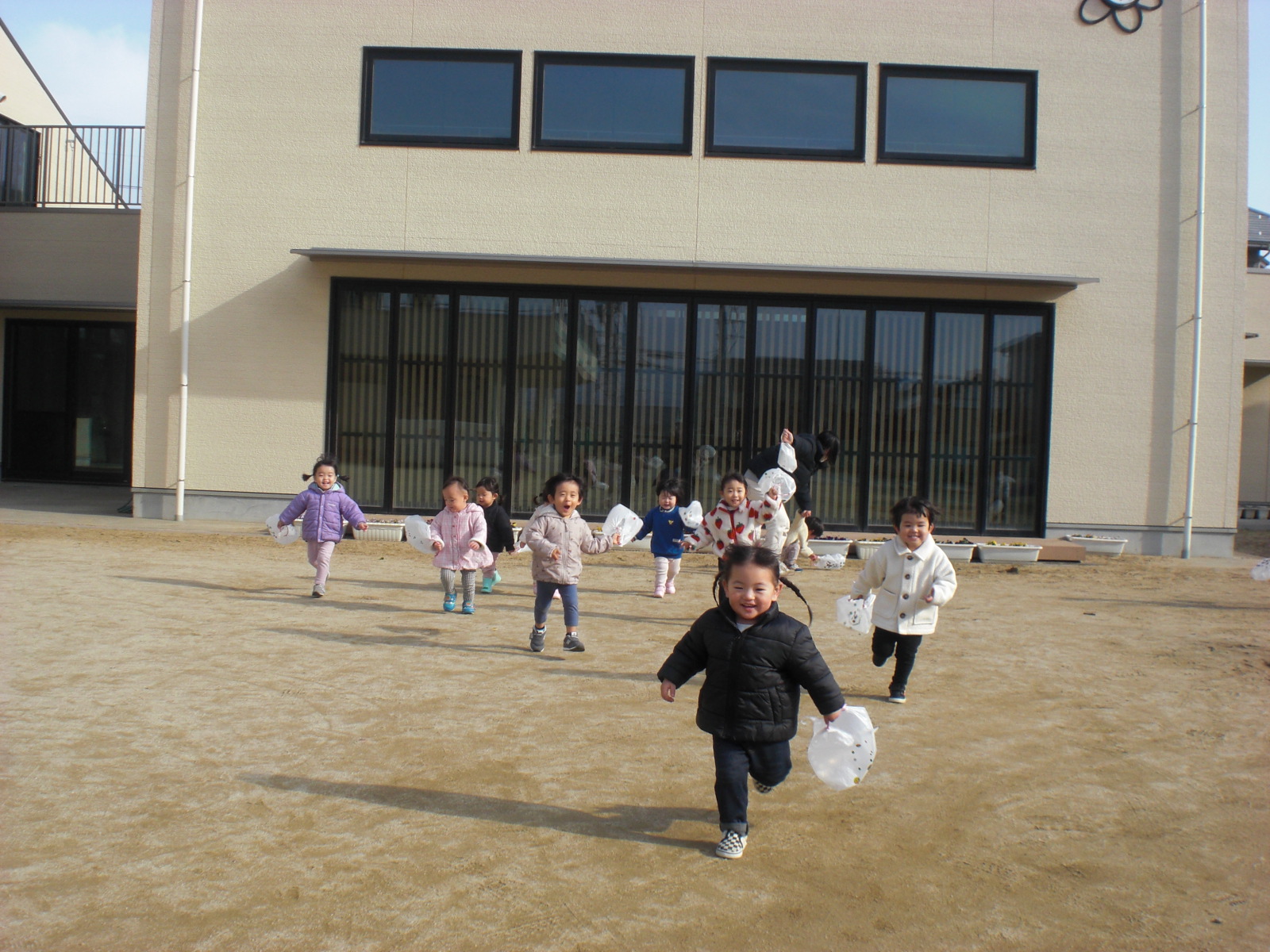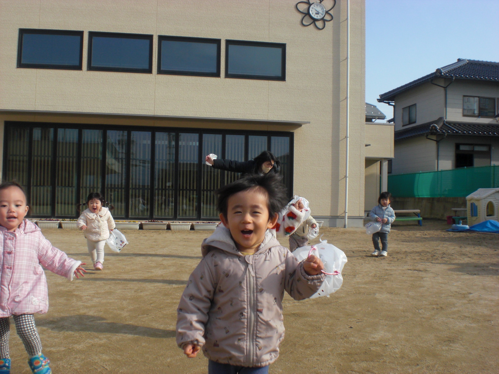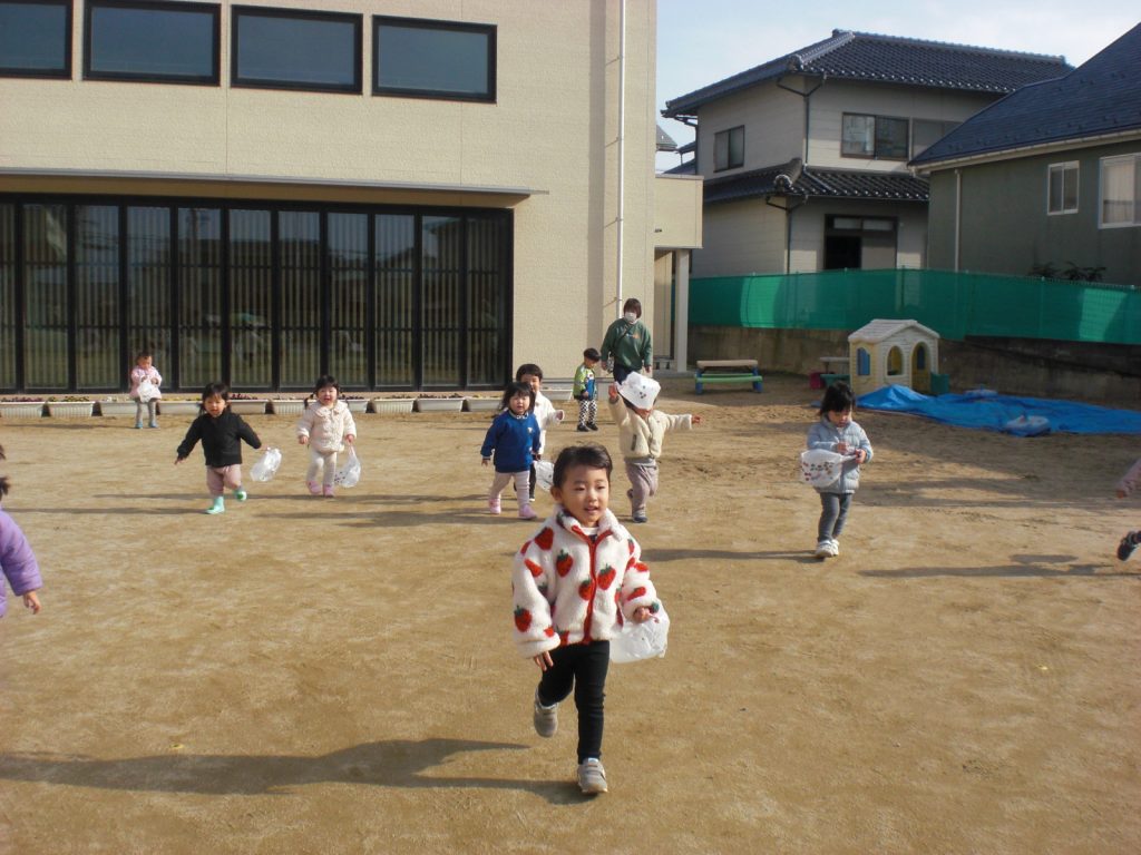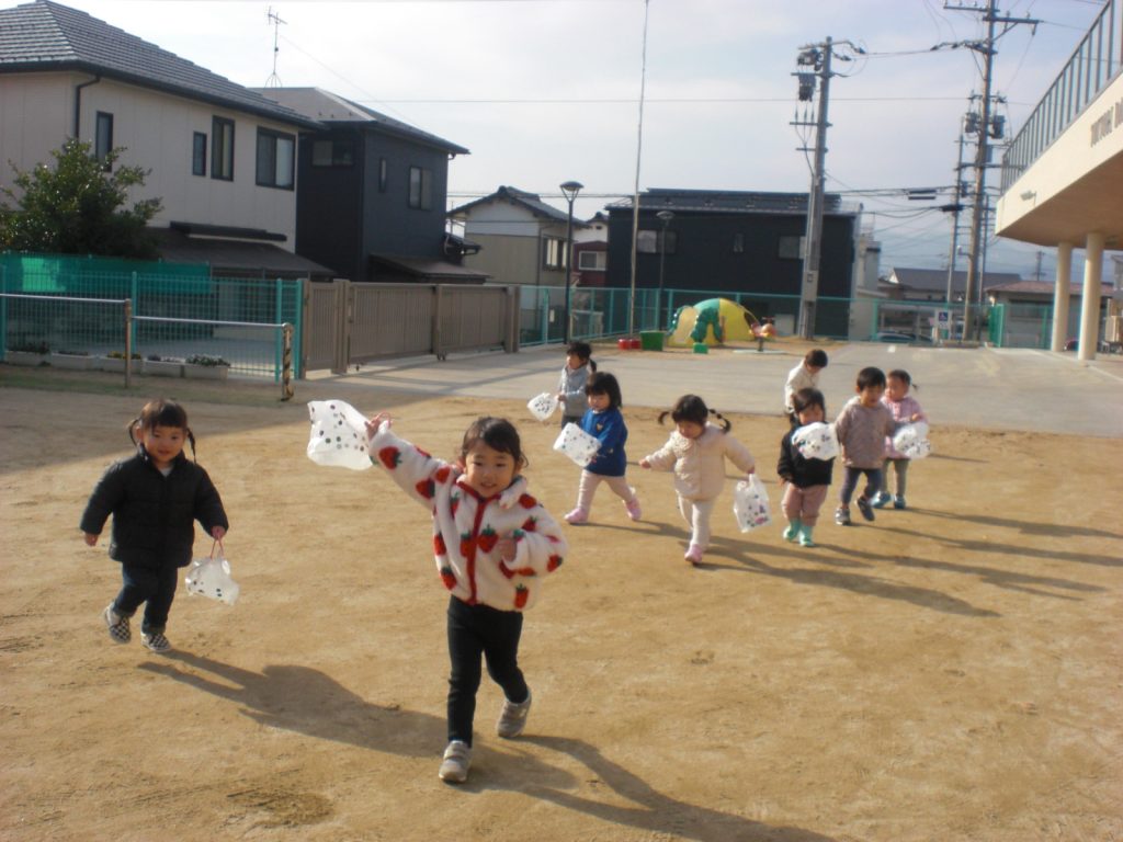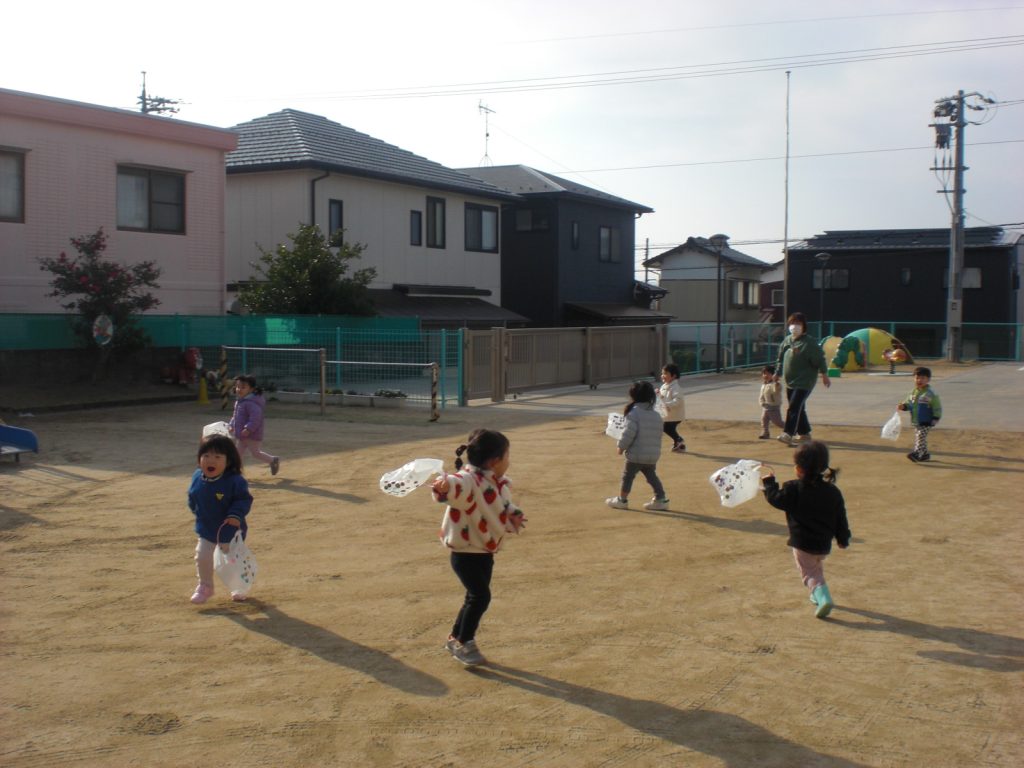 ビニール袋で作った凧を持って園庭で遊びました。喜んで走っていた子ども達でしたよ♪