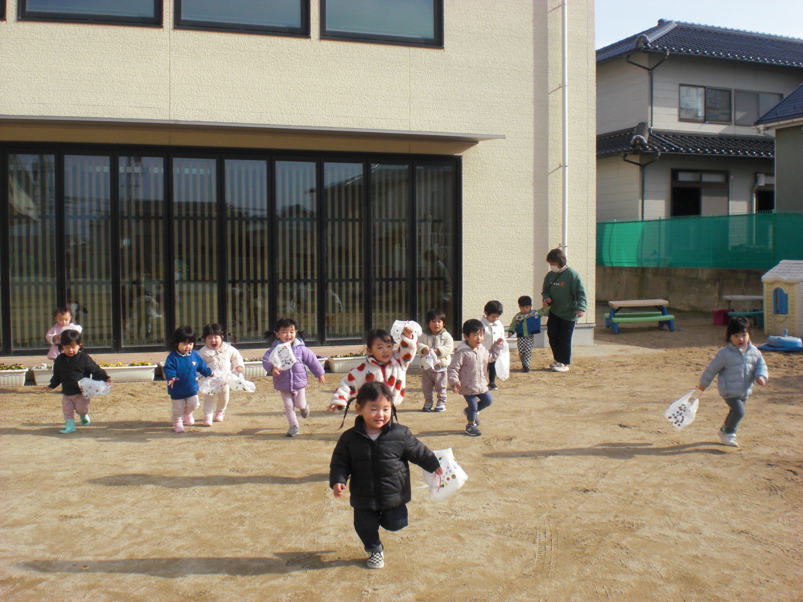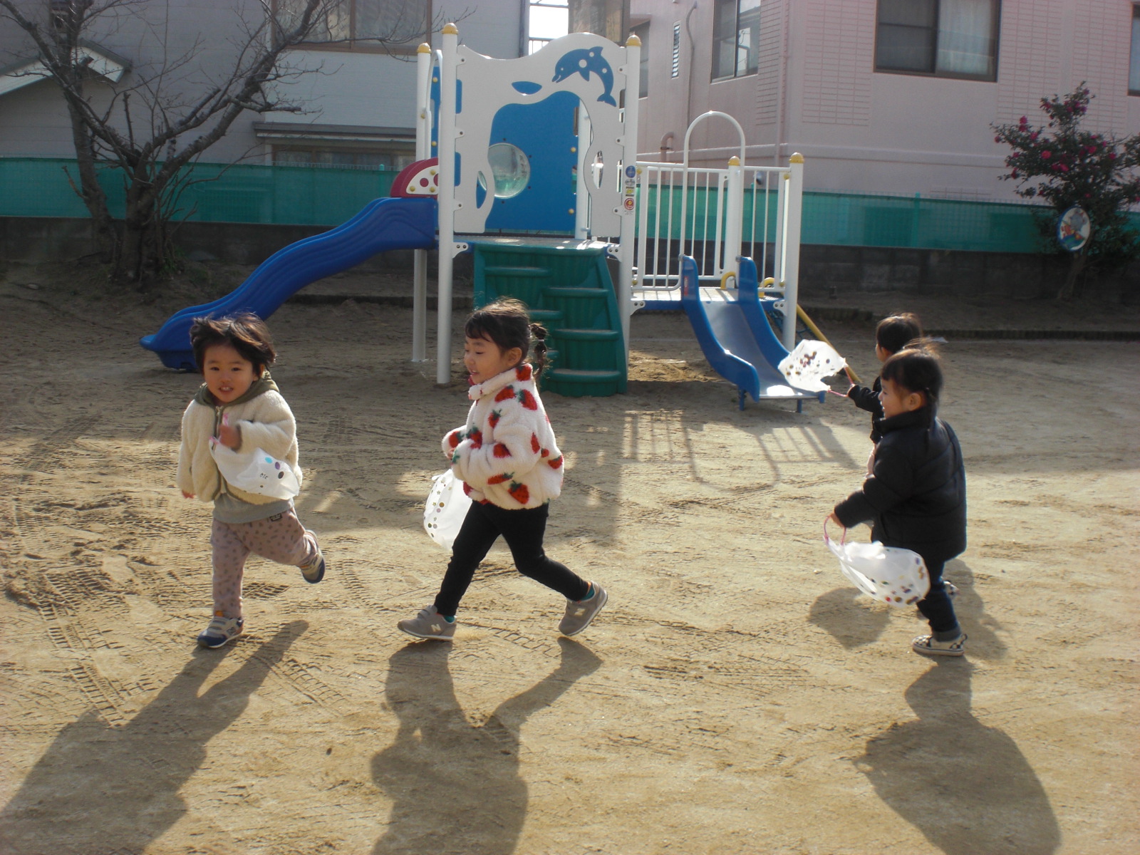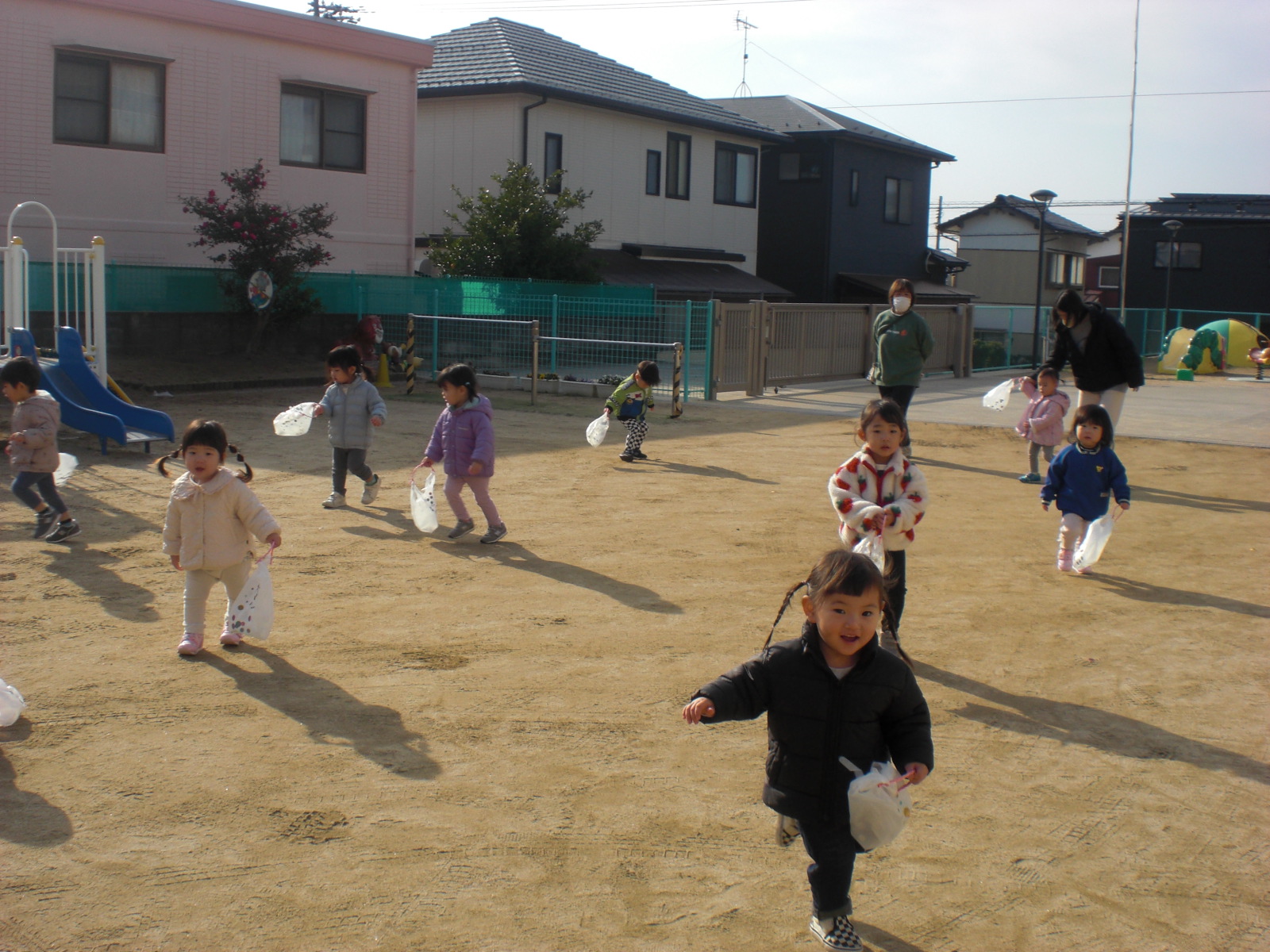 ビニール袋で作った凧を持って園庭で遊びました。喜んで走っていた子ども達でしたよ♪