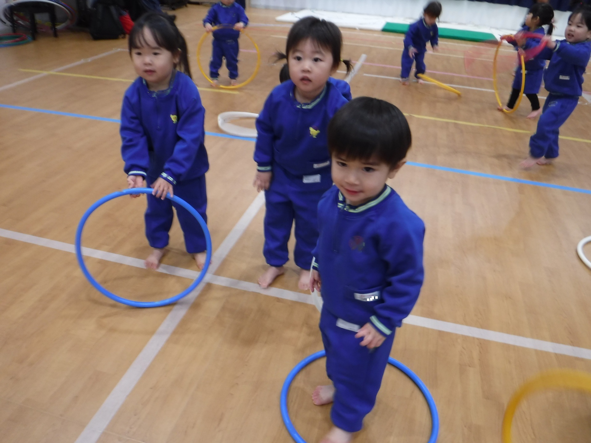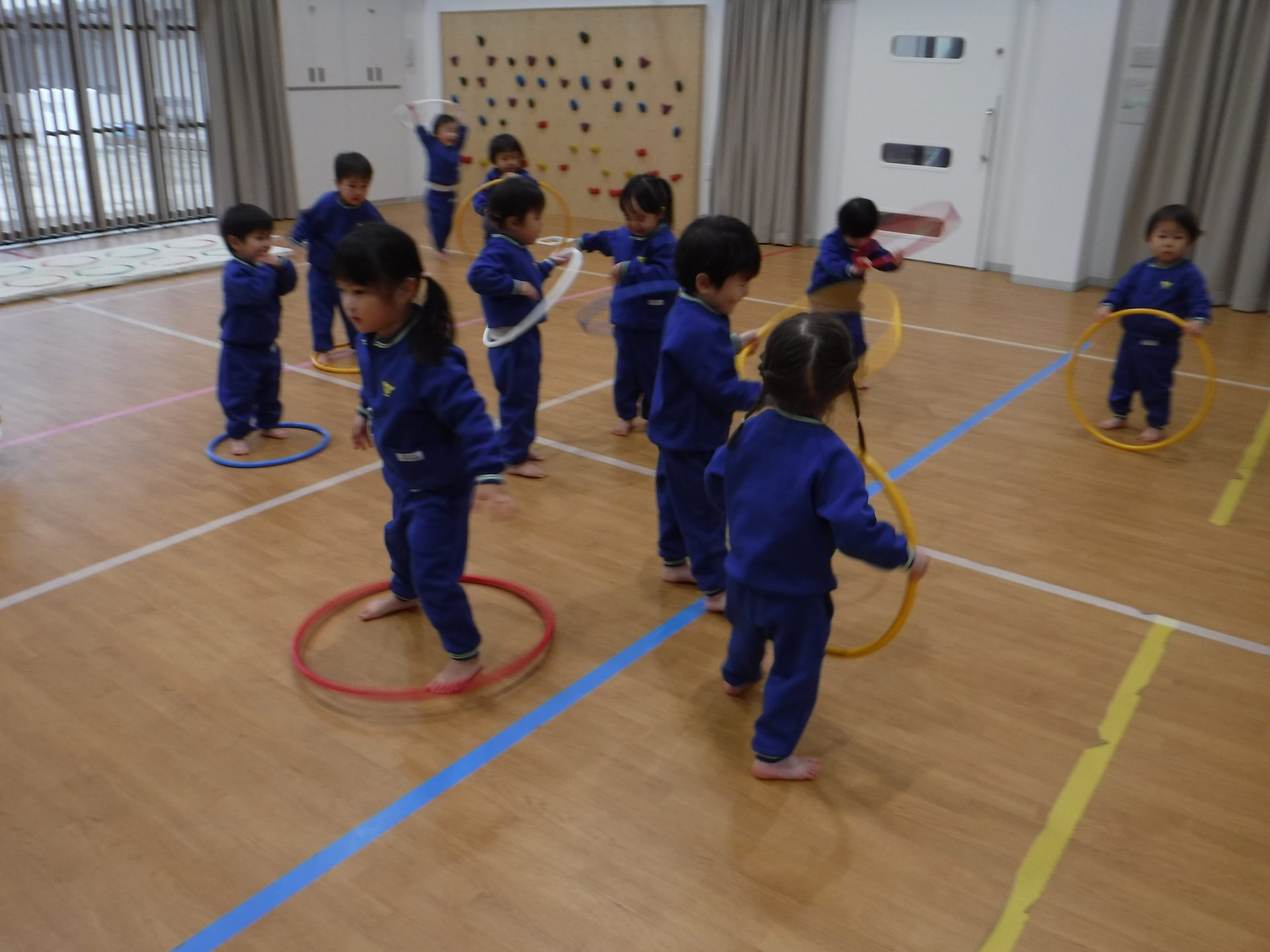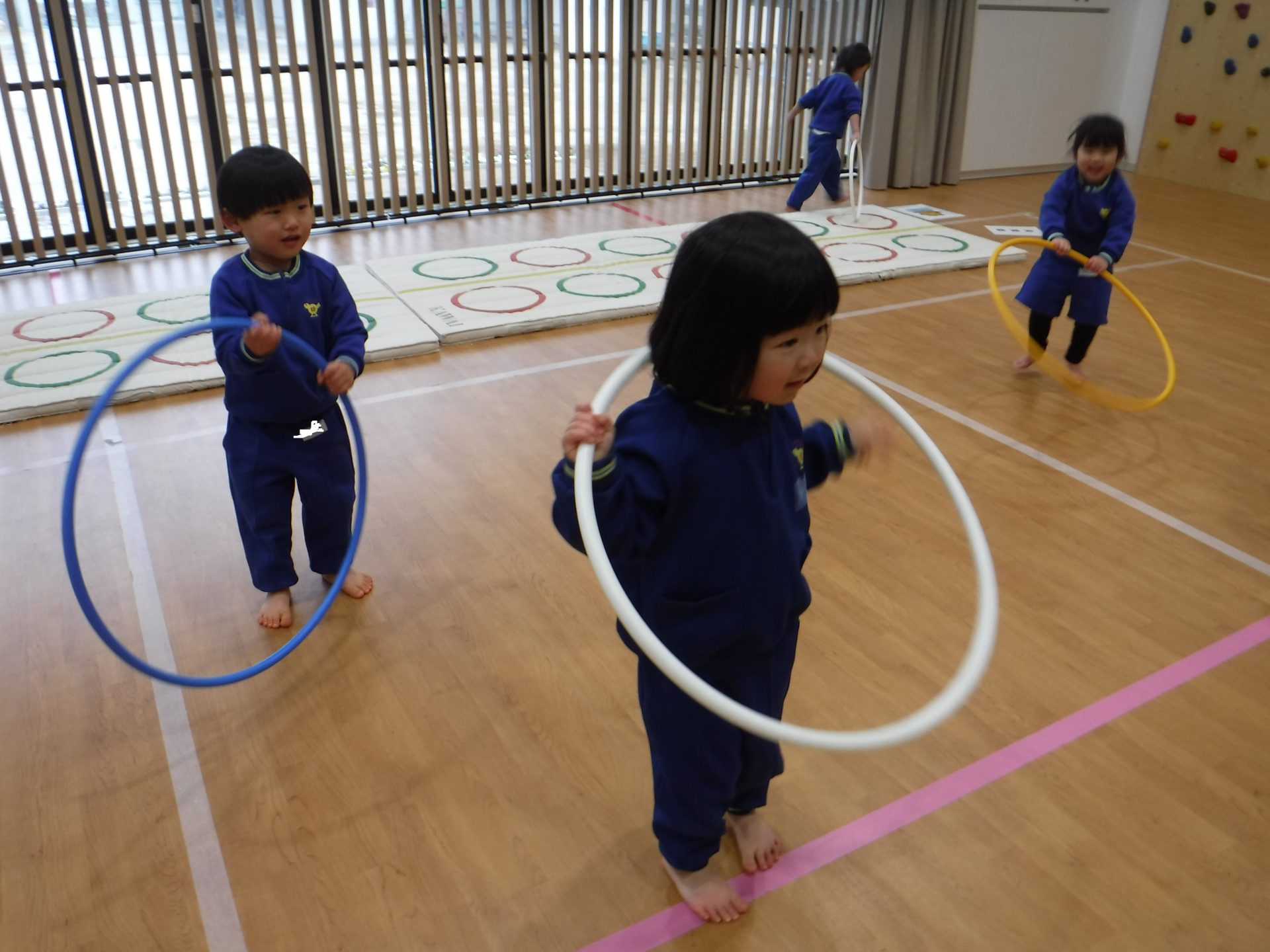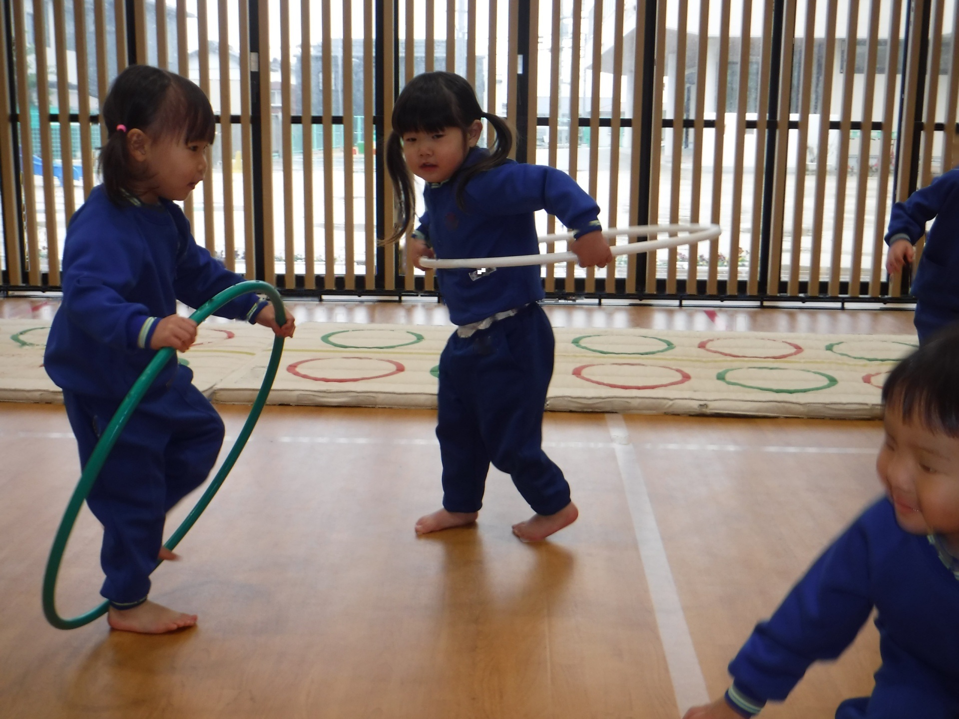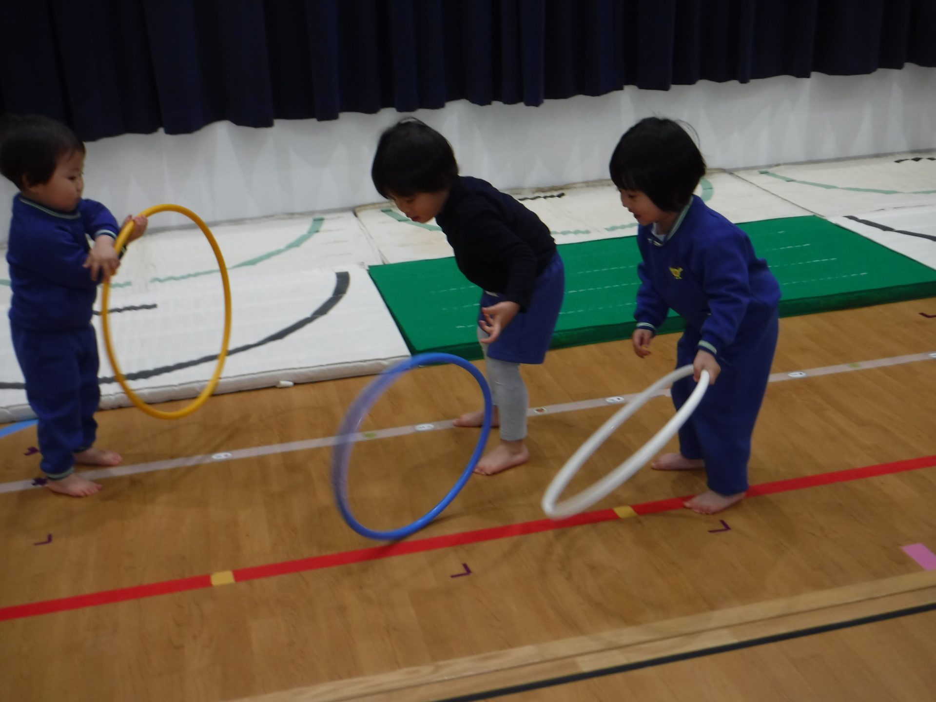 一人一つフープをもらい、回したり転がしたり、自由に遊びます。