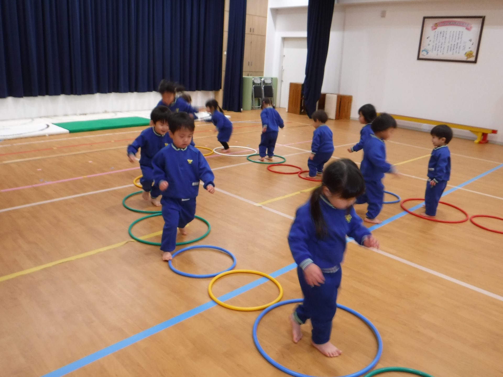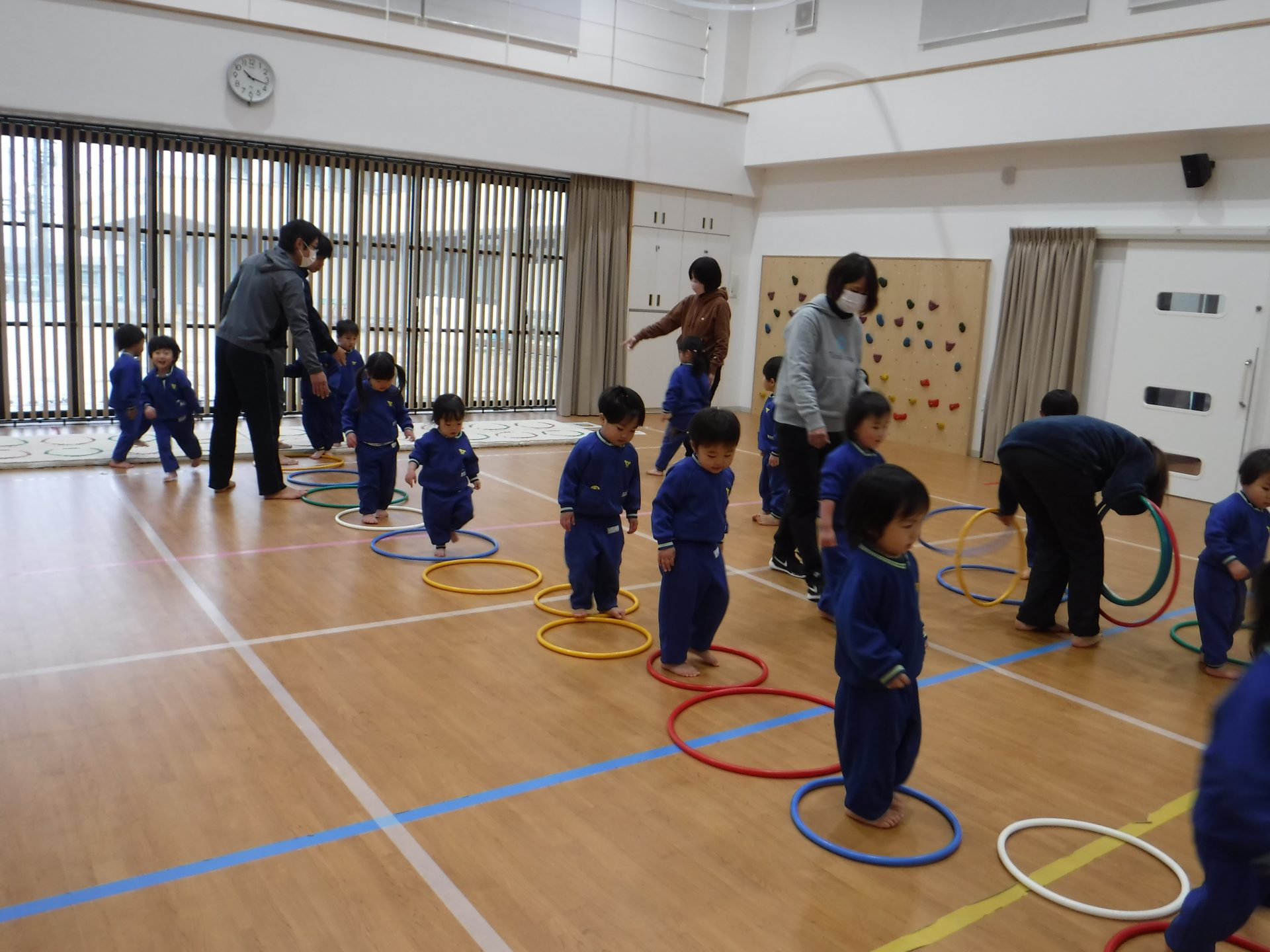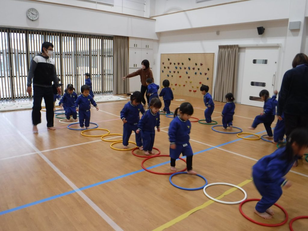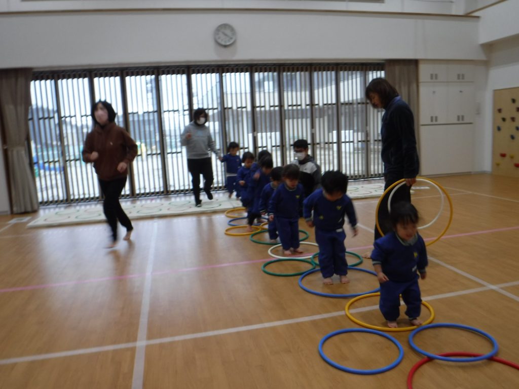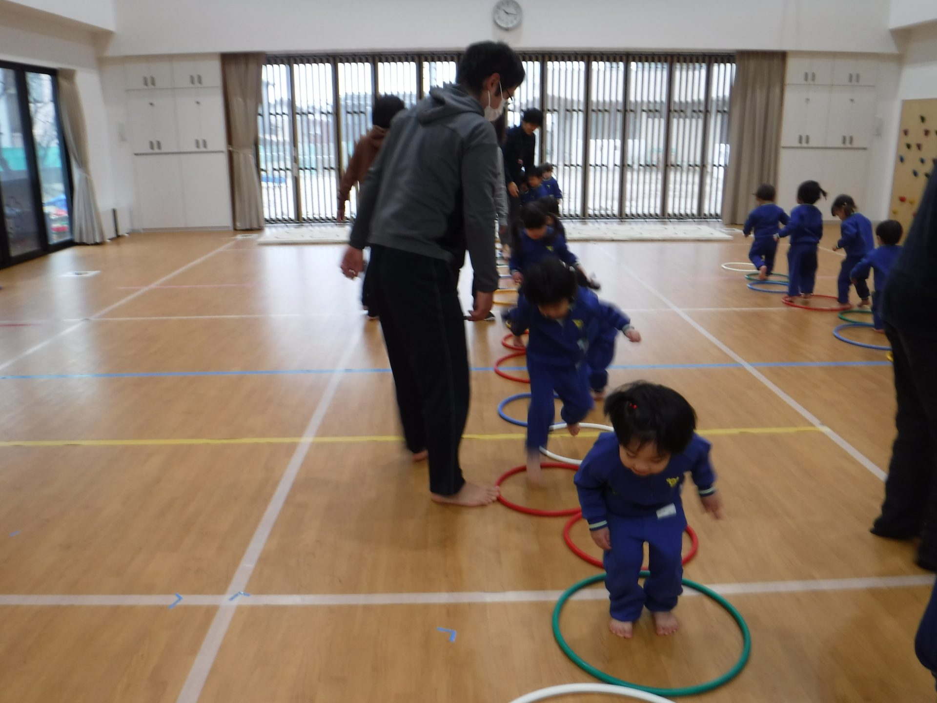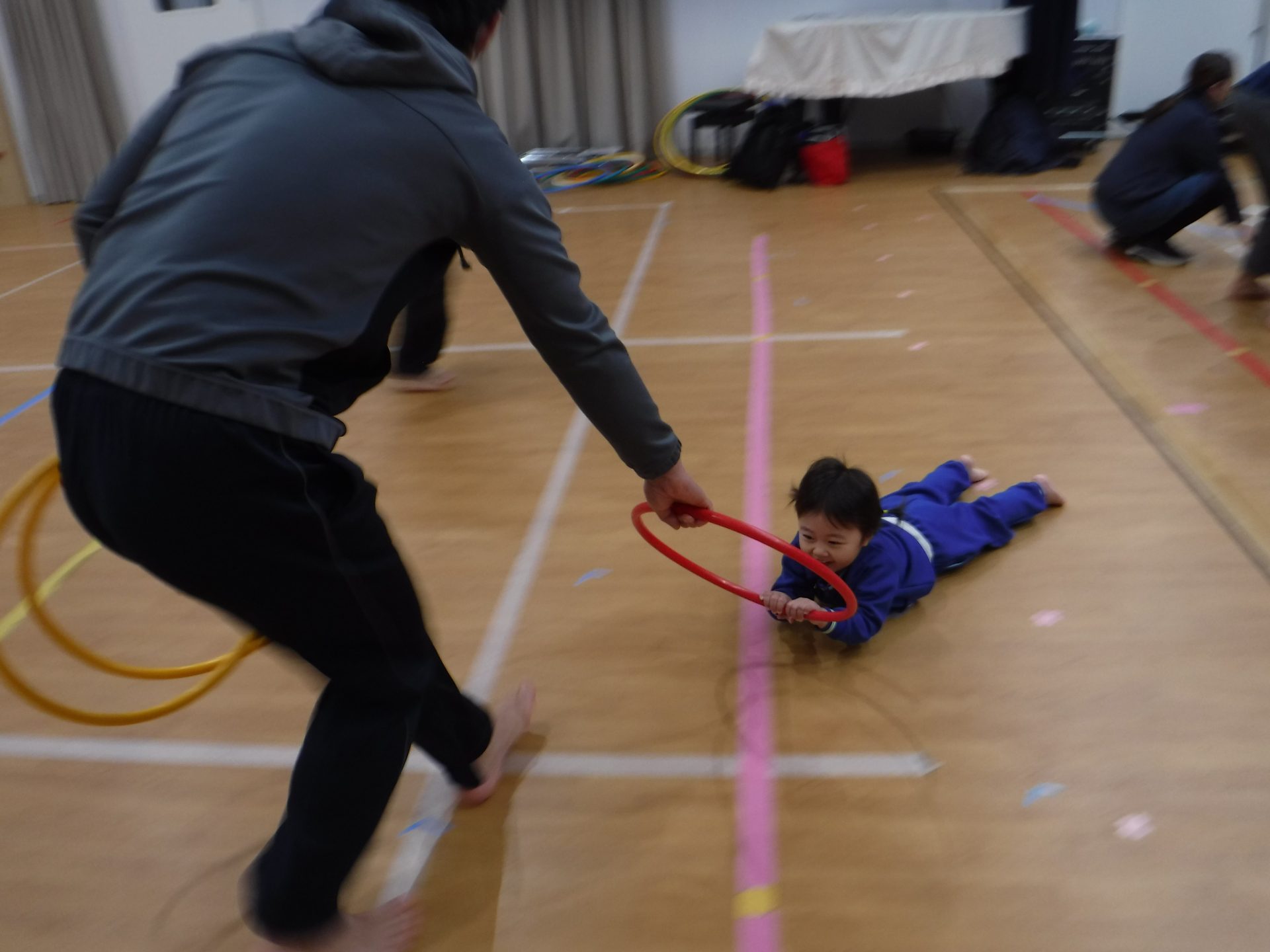 一人一つフープをもらい、回したり転がしたり、自由に遊びます。