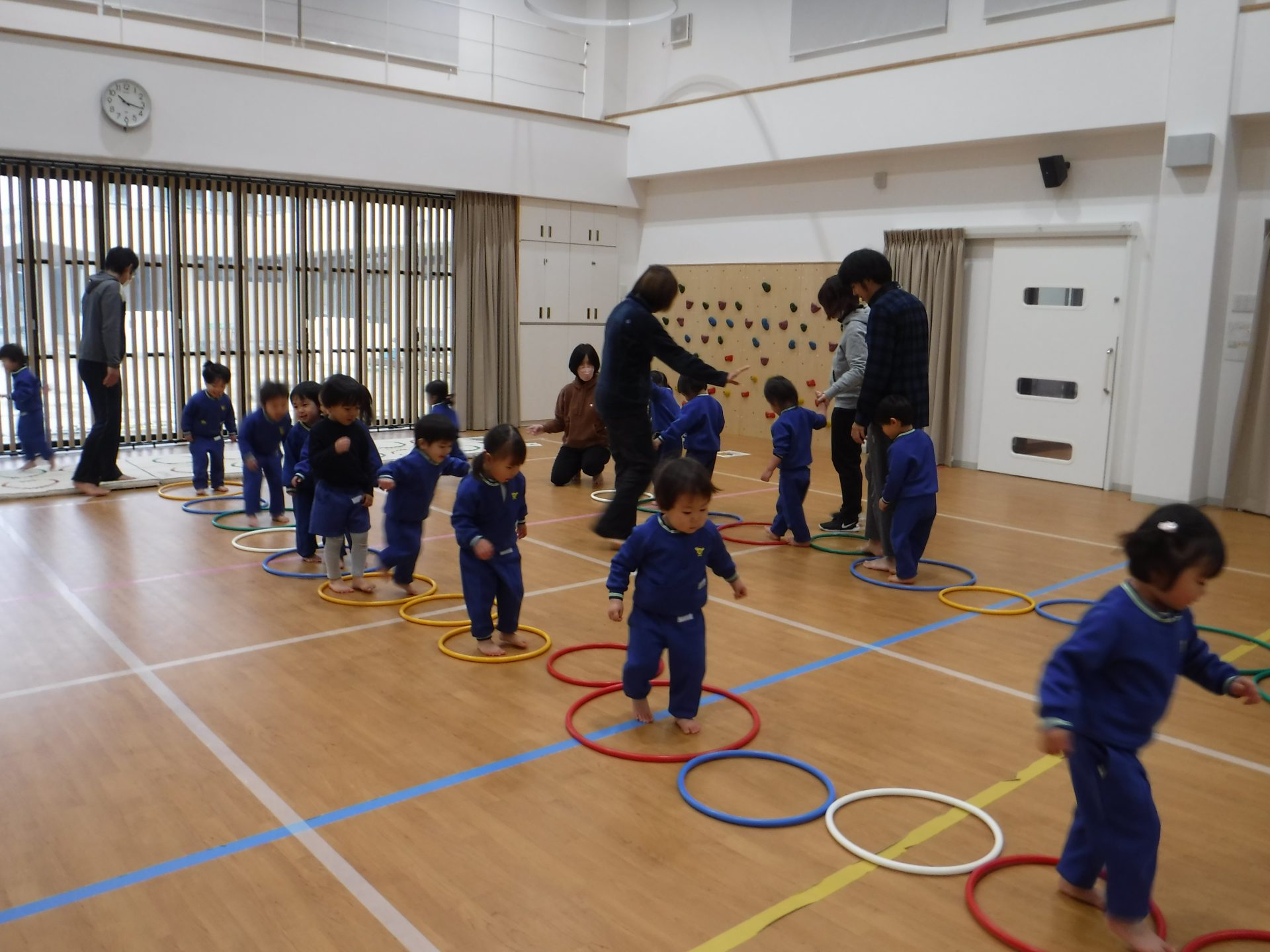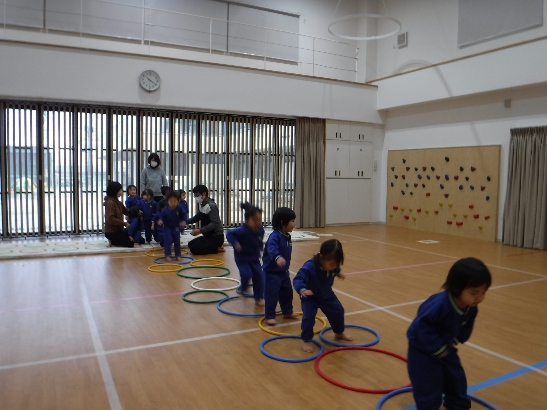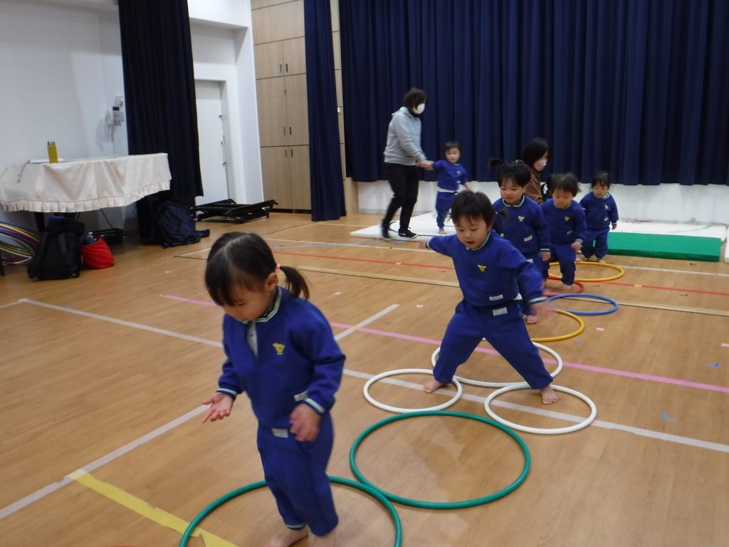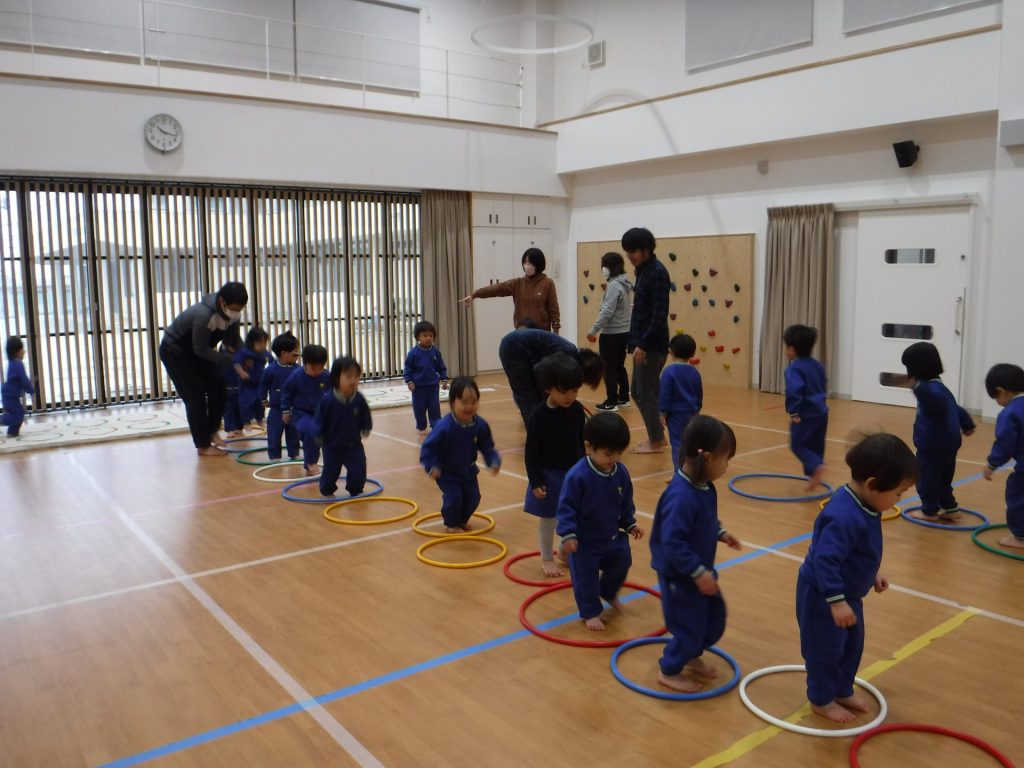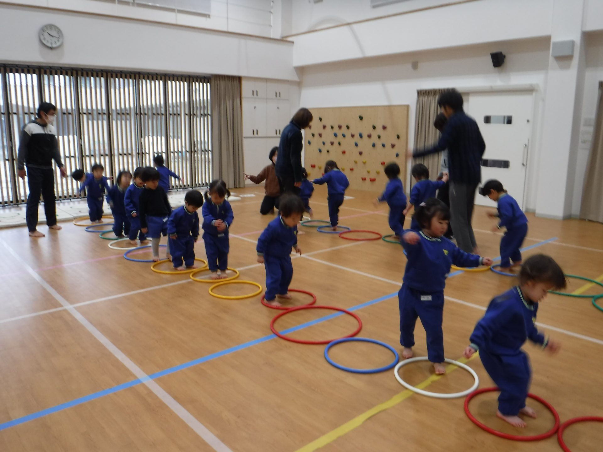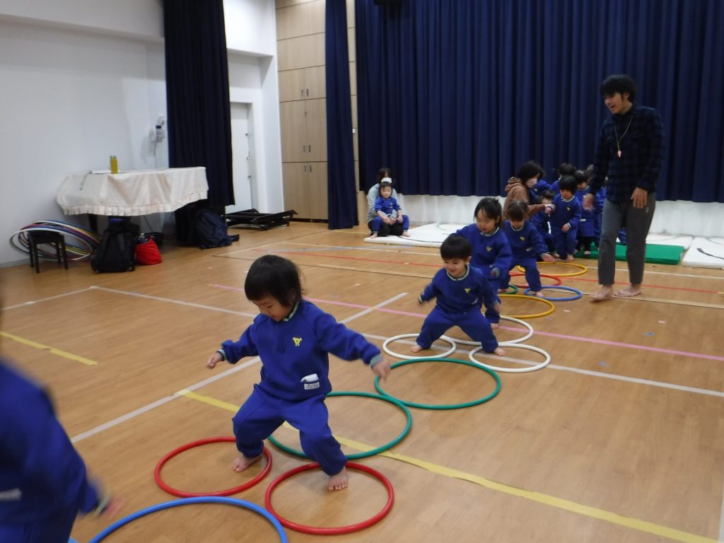 一人一つフープをもらい、回したり転がしたり、自由に遊びます。