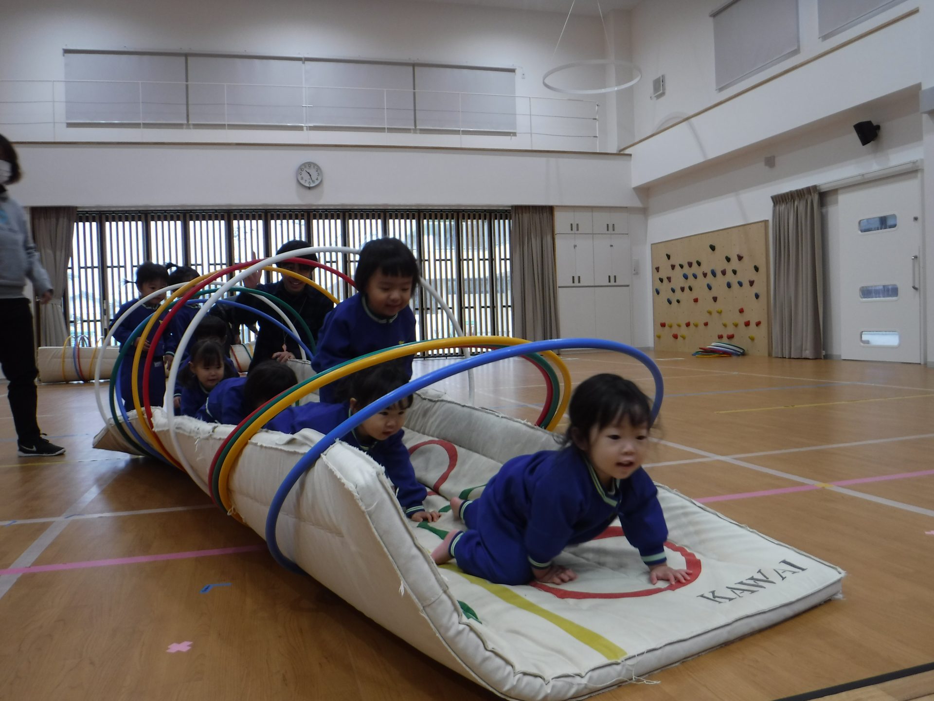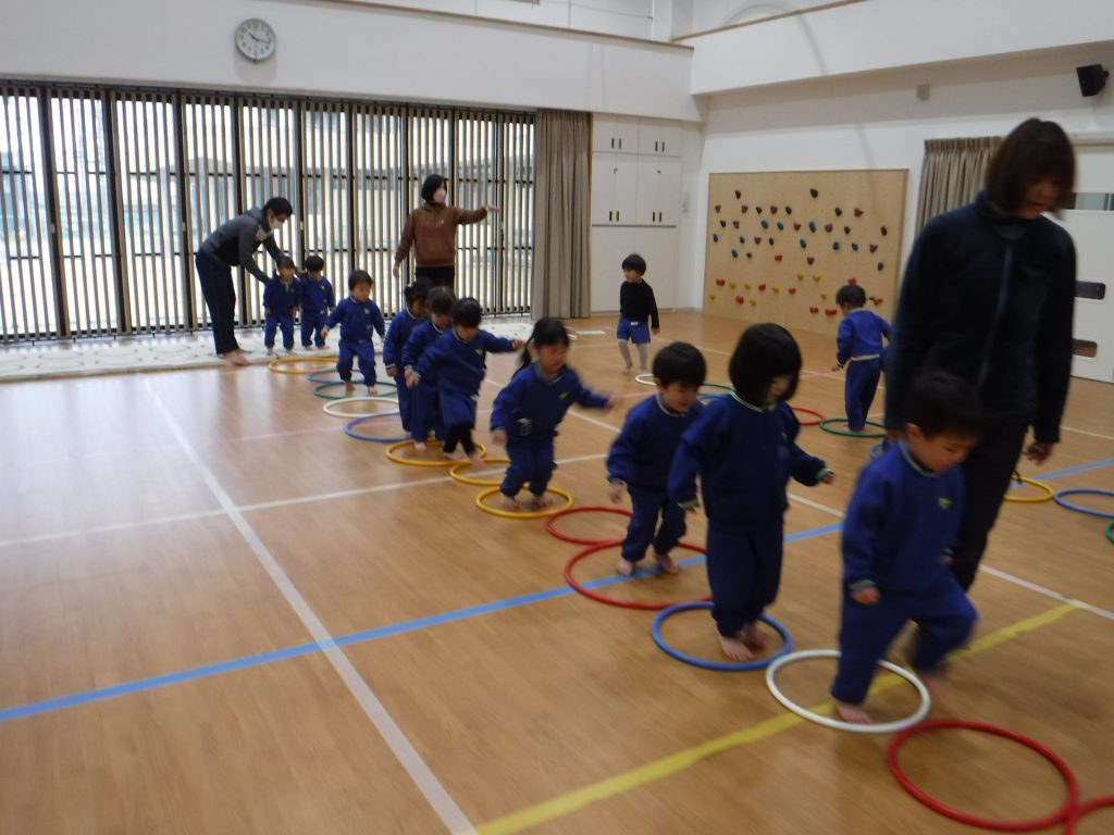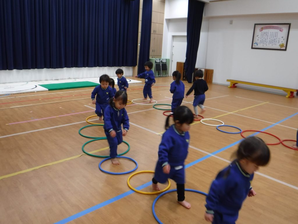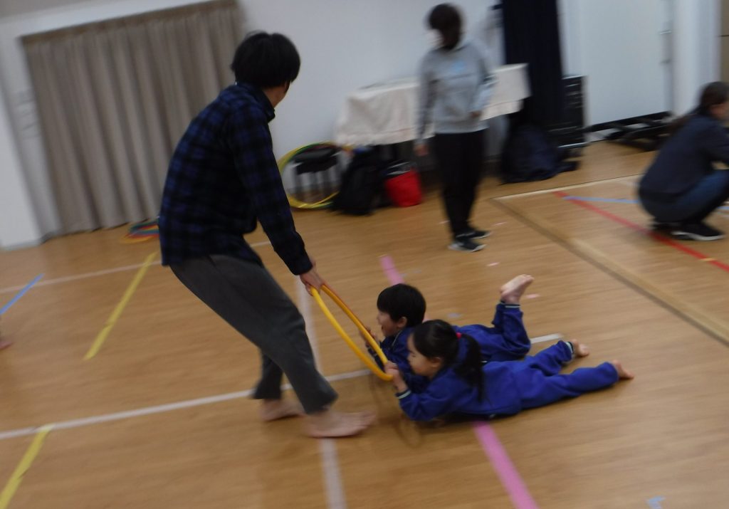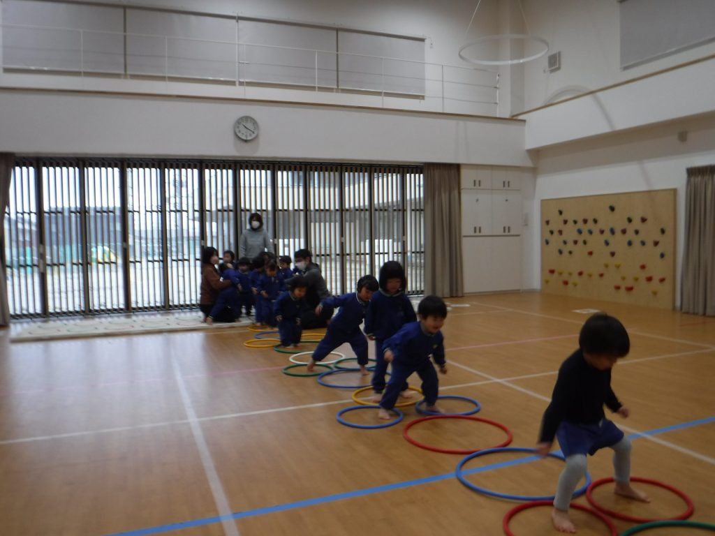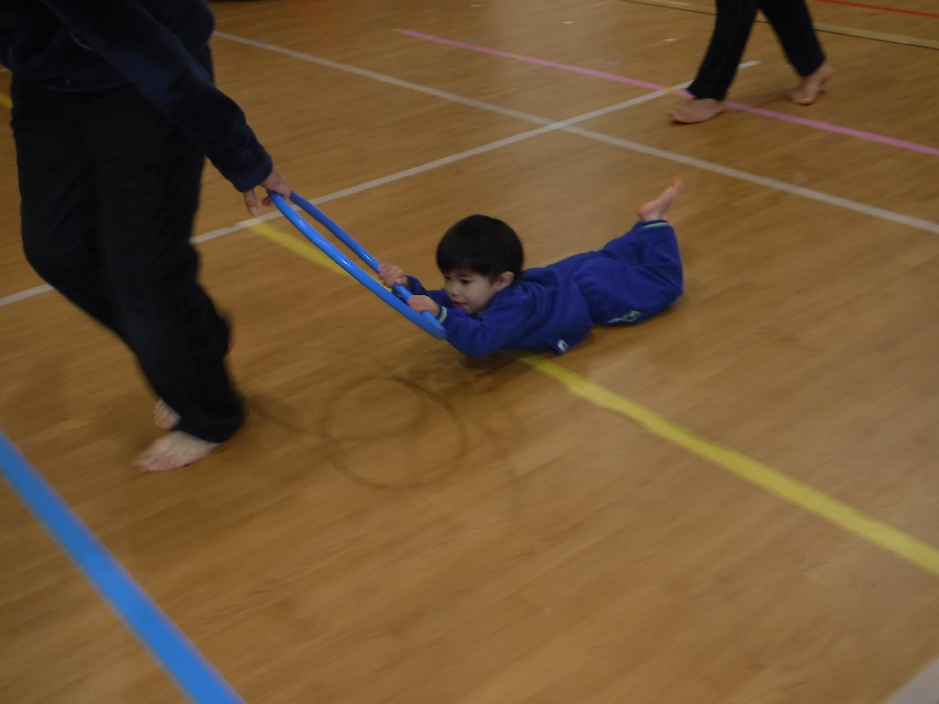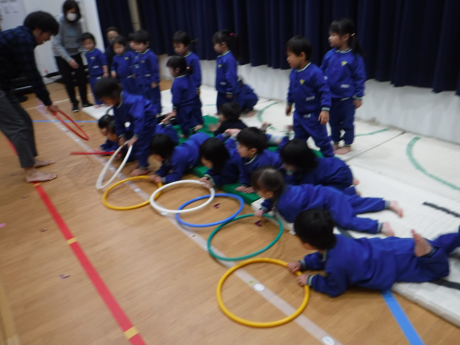 一人一つフープをもらい、回したり転がしたり、自由に遊びます。