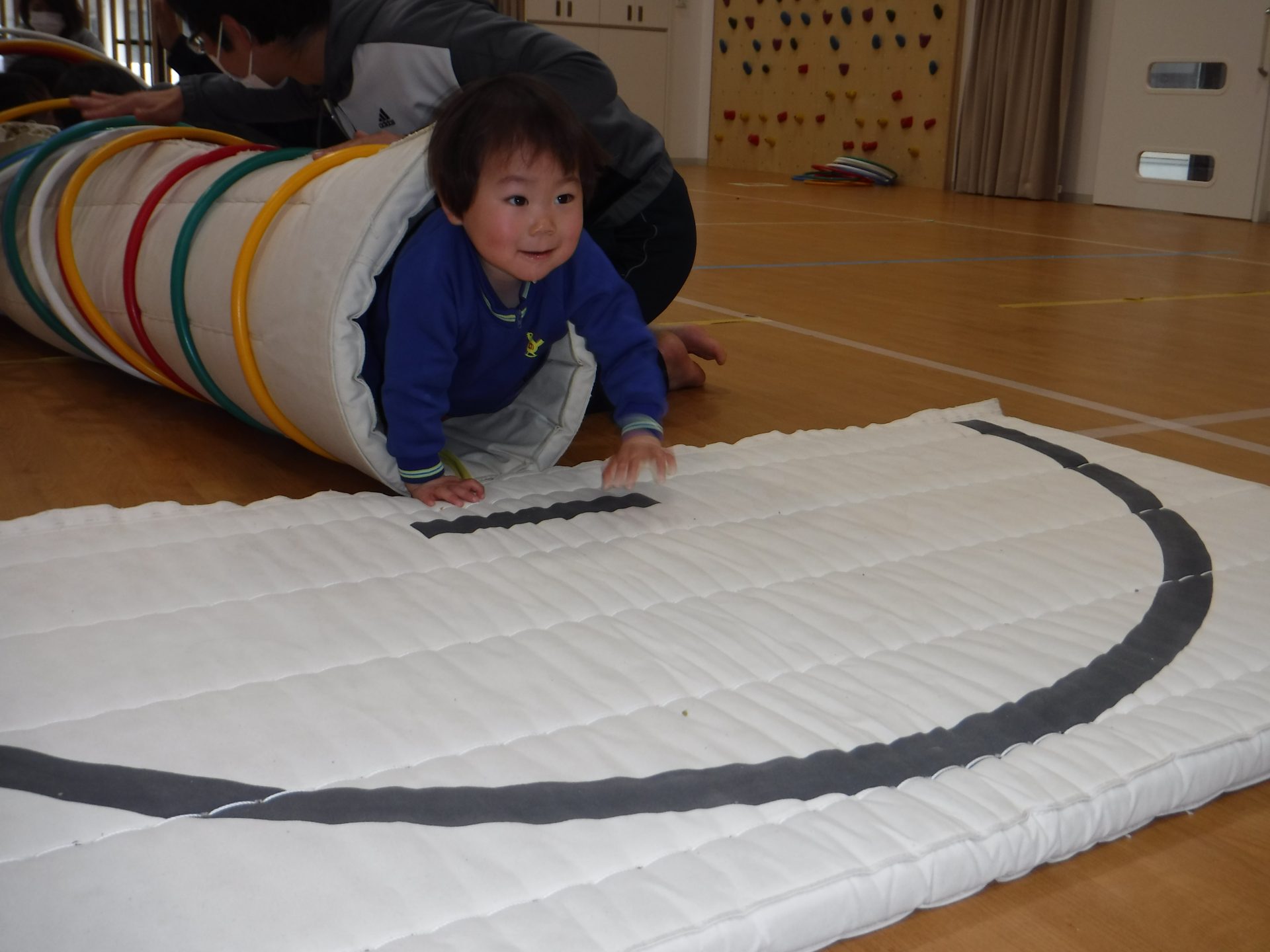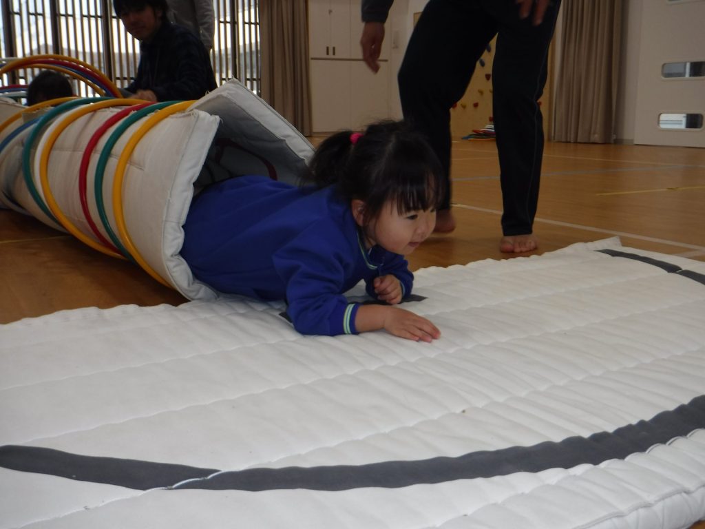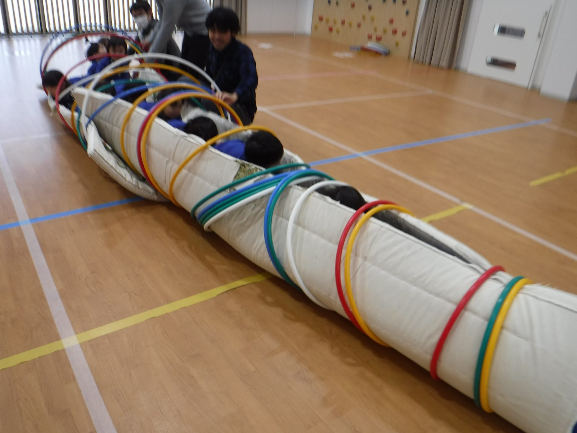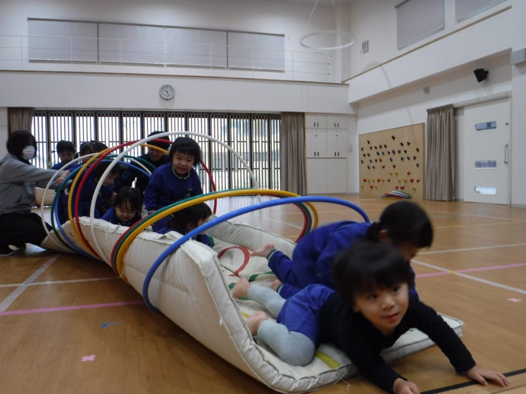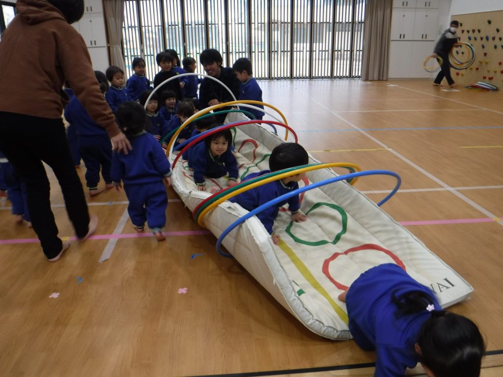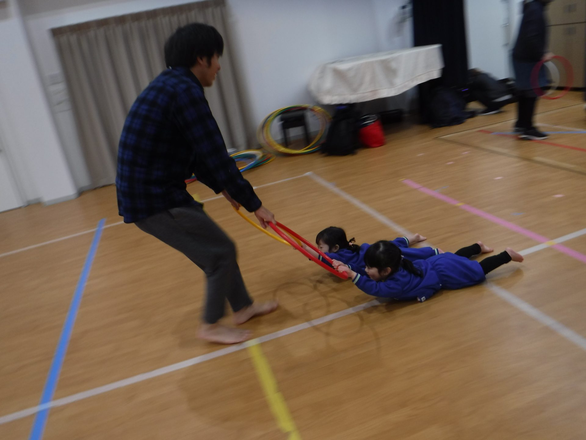 一人一つフープをもらい、回したり転がしたり、自由に遊びます。