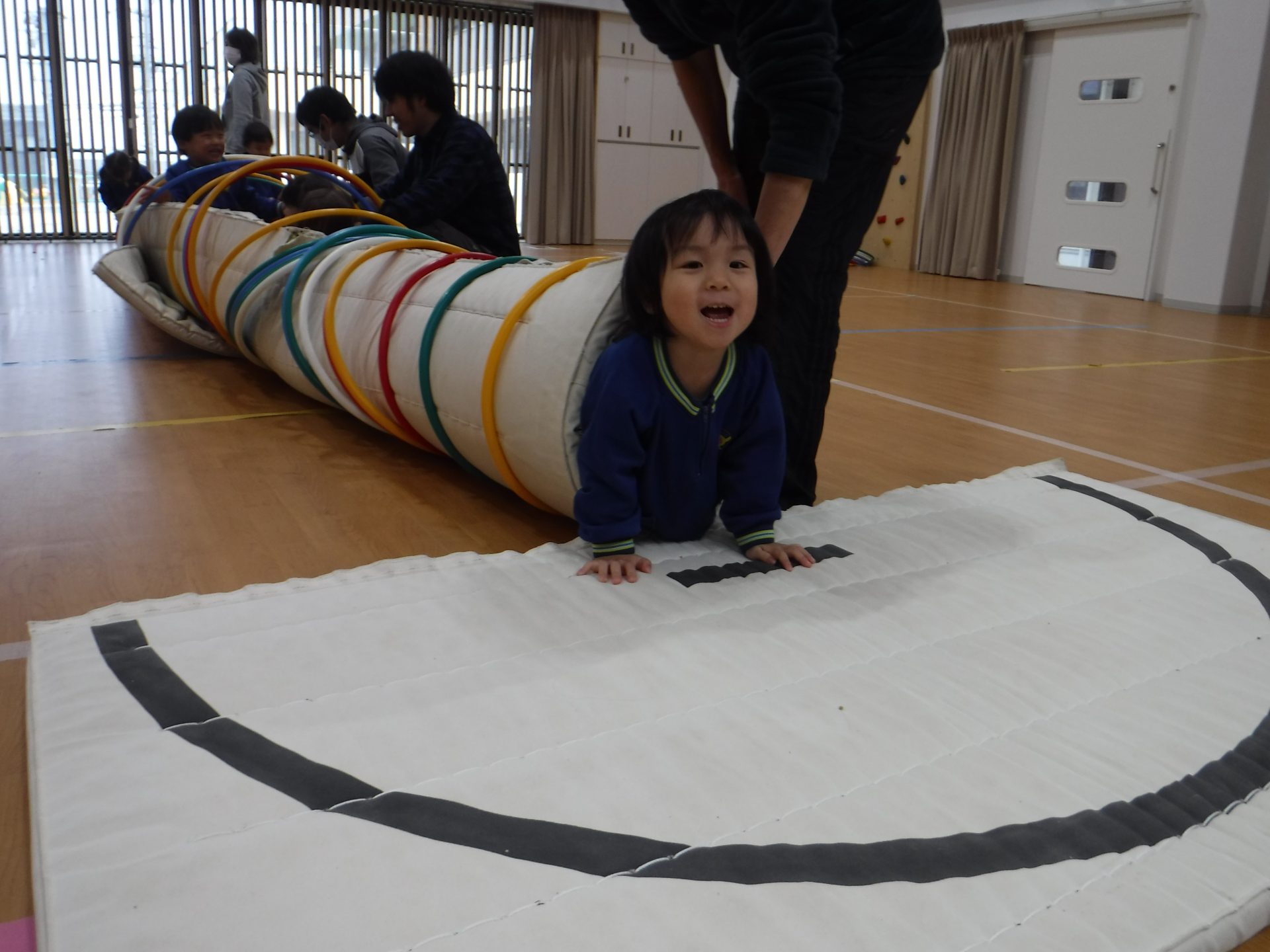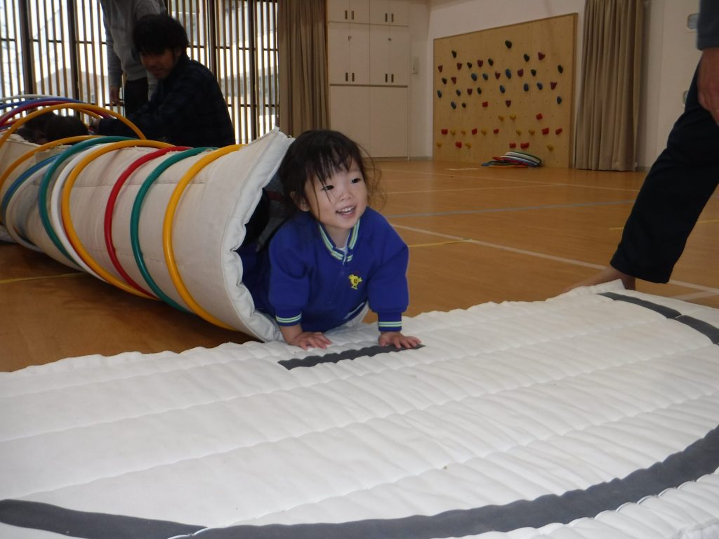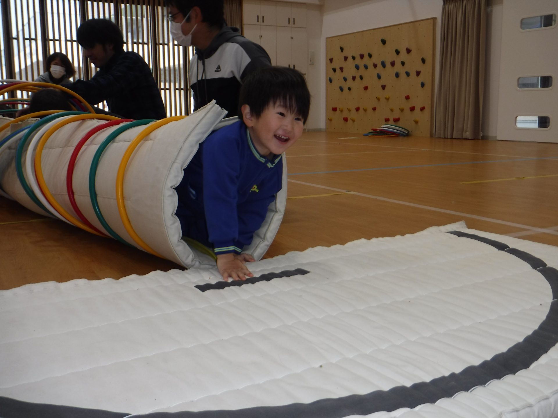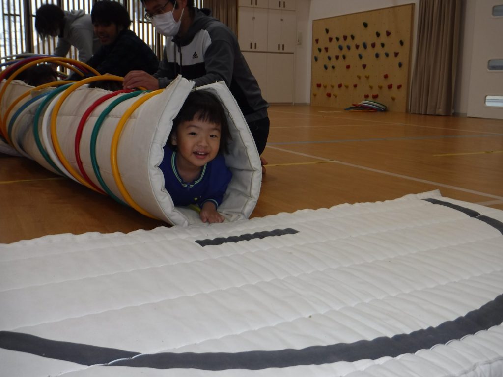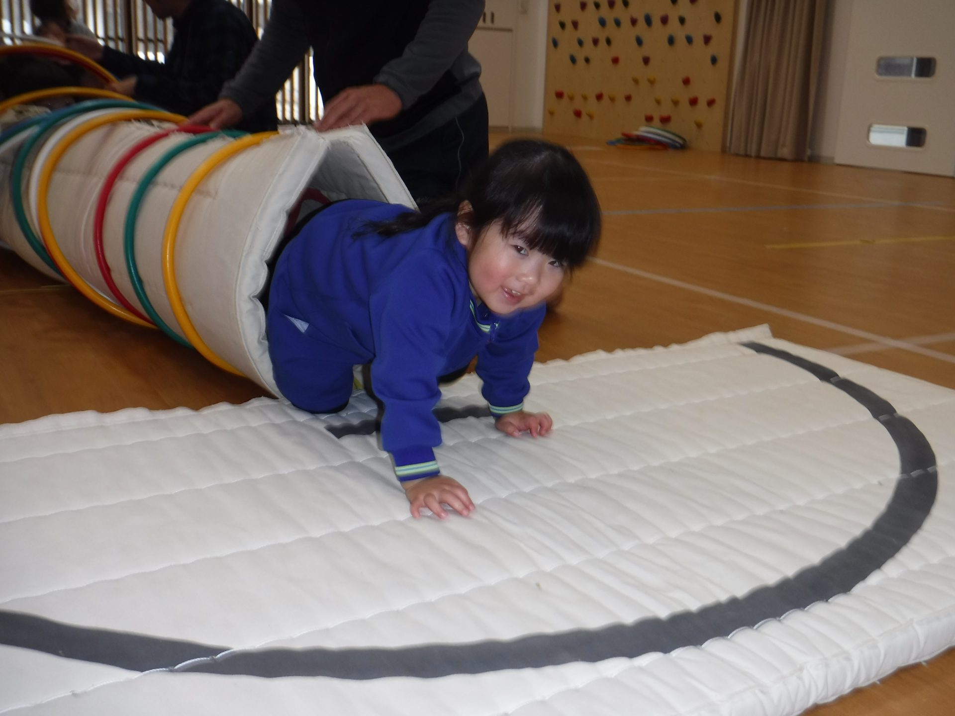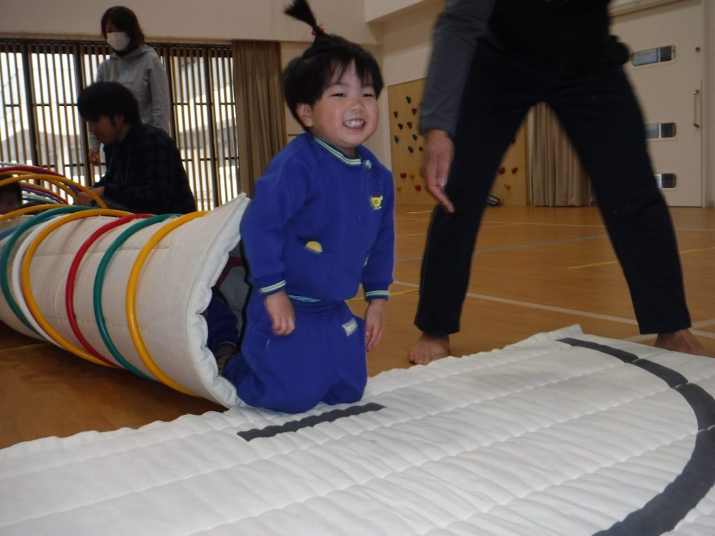 一人一つフープをもらい、回したり転がしたり、自由に遊びます。